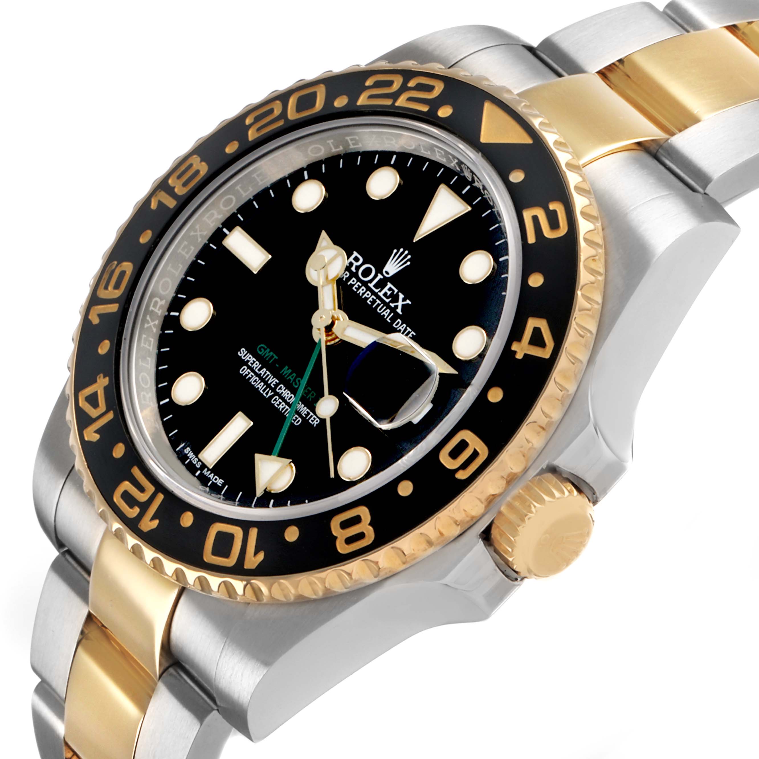 Dial: Black lacquer dial with luminescent yellow gold dot hour markers and Mercedes hands. Luminescent green arrow-tipped GMT hand. Luminescent lollipop-tipped center sweeping seconds hand. Date calendar at the 3 o'clock aperture. Outer stick minute markers.