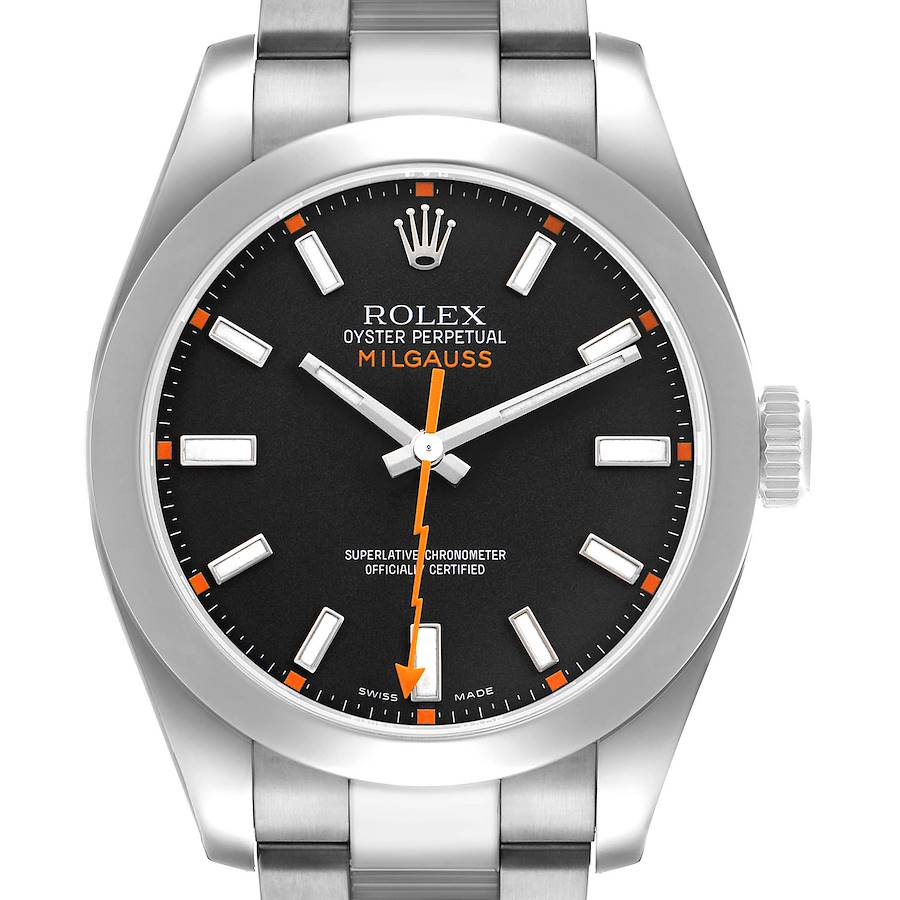 Rolex Milgauss 40 Steel Black Dial Mens Watch 116400. Officially certified chronometer automatic self-winding movement. Stainless steel oyster case 40.0 mm in diameter. Rolex logo on the crown. Stainless steel smooth domed bezel. Scratch resistant sapphire crystal. Black dial with luminescent hands and hour markers. Orange lightning-bolt seconds hand. Stainless steel oyster bracelet with an Oysterlock clasp. Fits a 8" wrist.