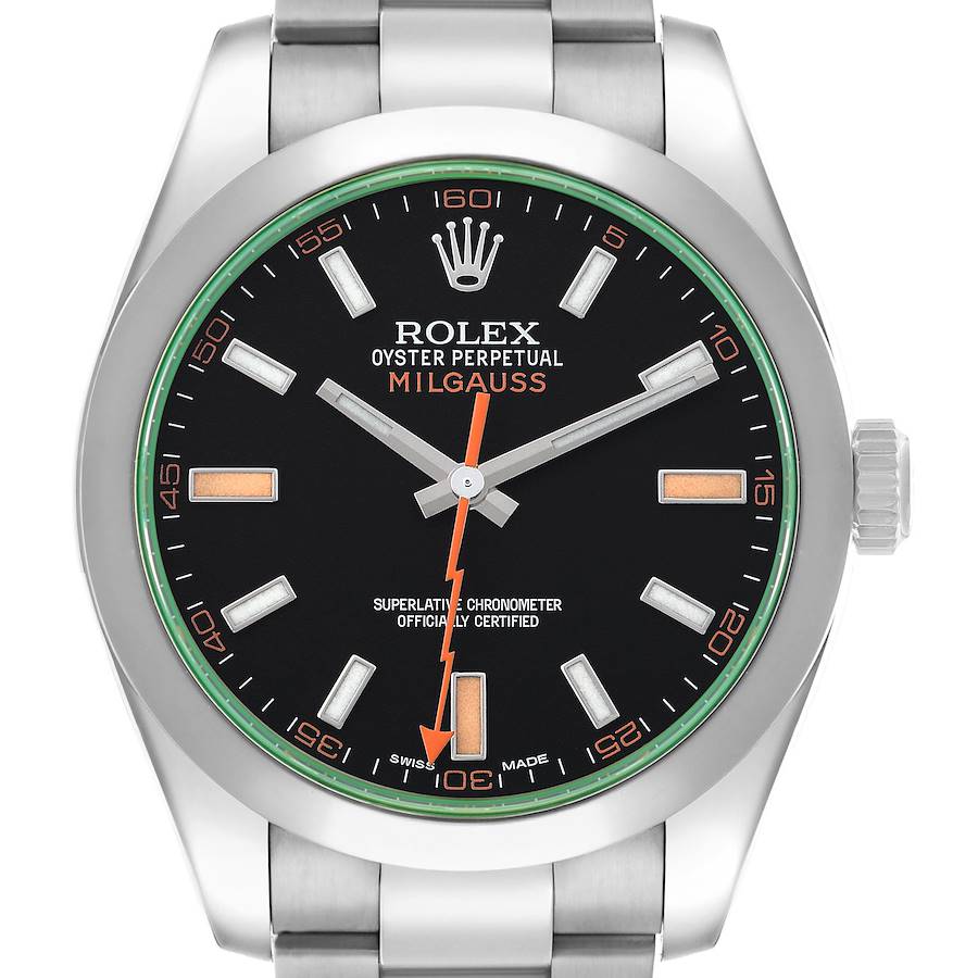 Rolex Milgauss Steel Green Crystal Black Dial Mens Watch 116400GV. Officially certified chronometer automatic self-winding movement. Stainless steel oyster case 40.0 mm in diameter. Rolex logo on the crown. Stainless steel smooth domed bezel. Scratch resistant green sapphire crystal. Black dial with luminescent baton hands and hour markers. Orange lightning-bolt seconds hand. Outer minute and 1/2 second stick markers. Stainless steel oyster bracelet with an Oysterlock clasp. Fits a 7.5" wrist.