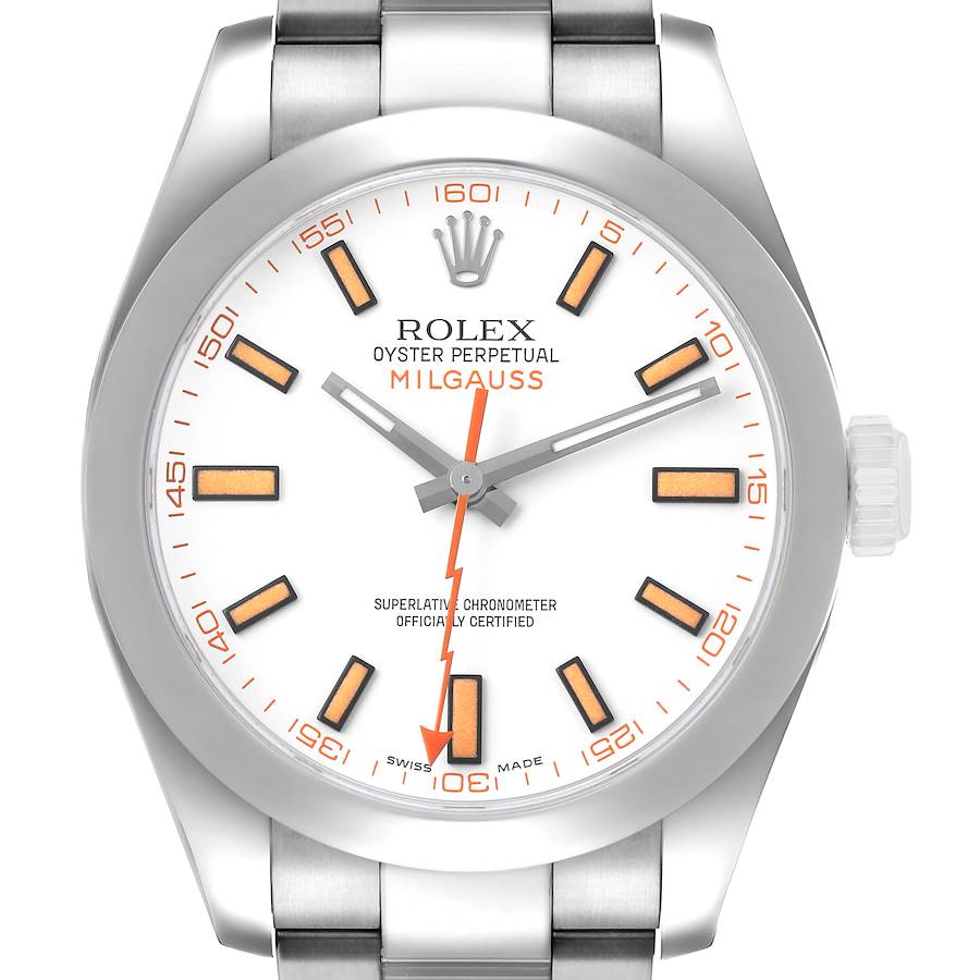 Rolex Milgauss Steel White Dial Mens Watch 116400. Officially certified chronometer automatic self-winding movement. Stainless steel oyster case 40.0 mm in diameter. Rolex logo on the crown. Stainless steel smooth domed bezel. Scratch resistant sapphire crystal. White dial with luminescent-inlay steel baton hands and orange hour markers. Orange lightning bolt sweeping seconds hand. Outer orange minute marker track. Stainless steel oyster bracelet with an oysterlock clasp. Fits a 7 3/4" wrist.