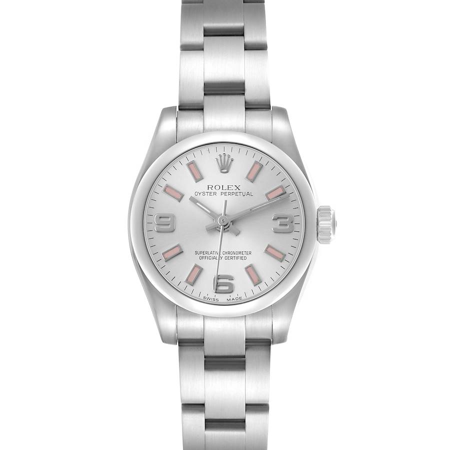 Rolex Oyster Perpetual 26 Steel Pink Hour Markers Ladies Watch 176200. Officially certified chronometer automatic self-winding movement. Stainless steel oyster case 26.0 mm in diameter. Rolex logo on the crown. Stainless steel smooth domed bezel. Scratch resistant sapphire crystal. Silver dial with pink hour markers and raised Arabic numerals at 3, 6, and 9 o'clock. Luminescent baton hour markers and hands. Outer minute track. Stainless steel oyster bracelet with an oysterlock clasp. Fits a 6 1/4" wrist.