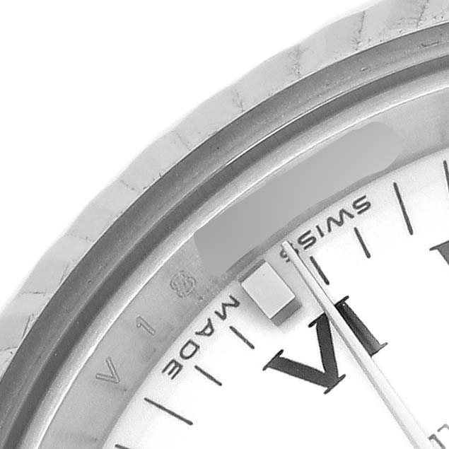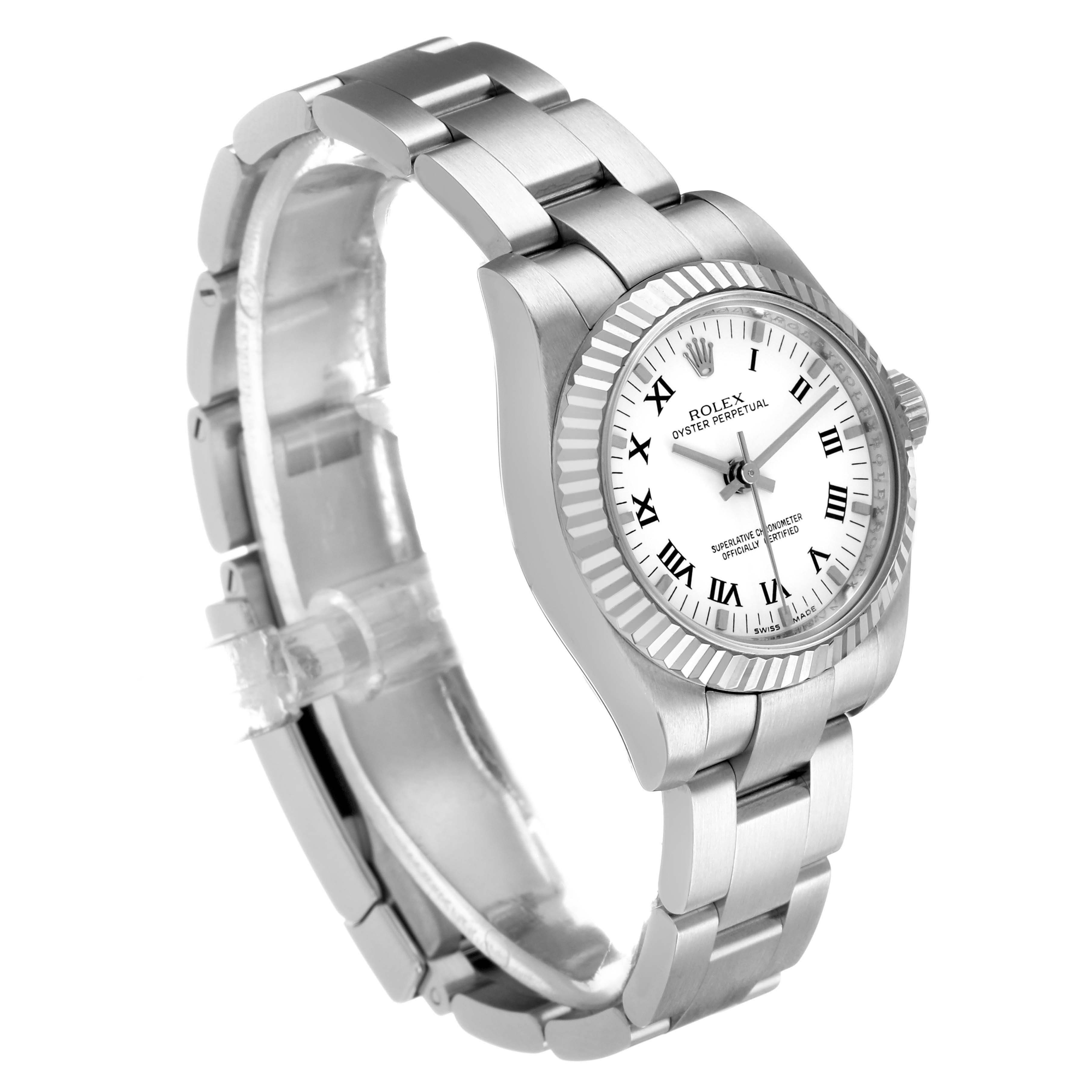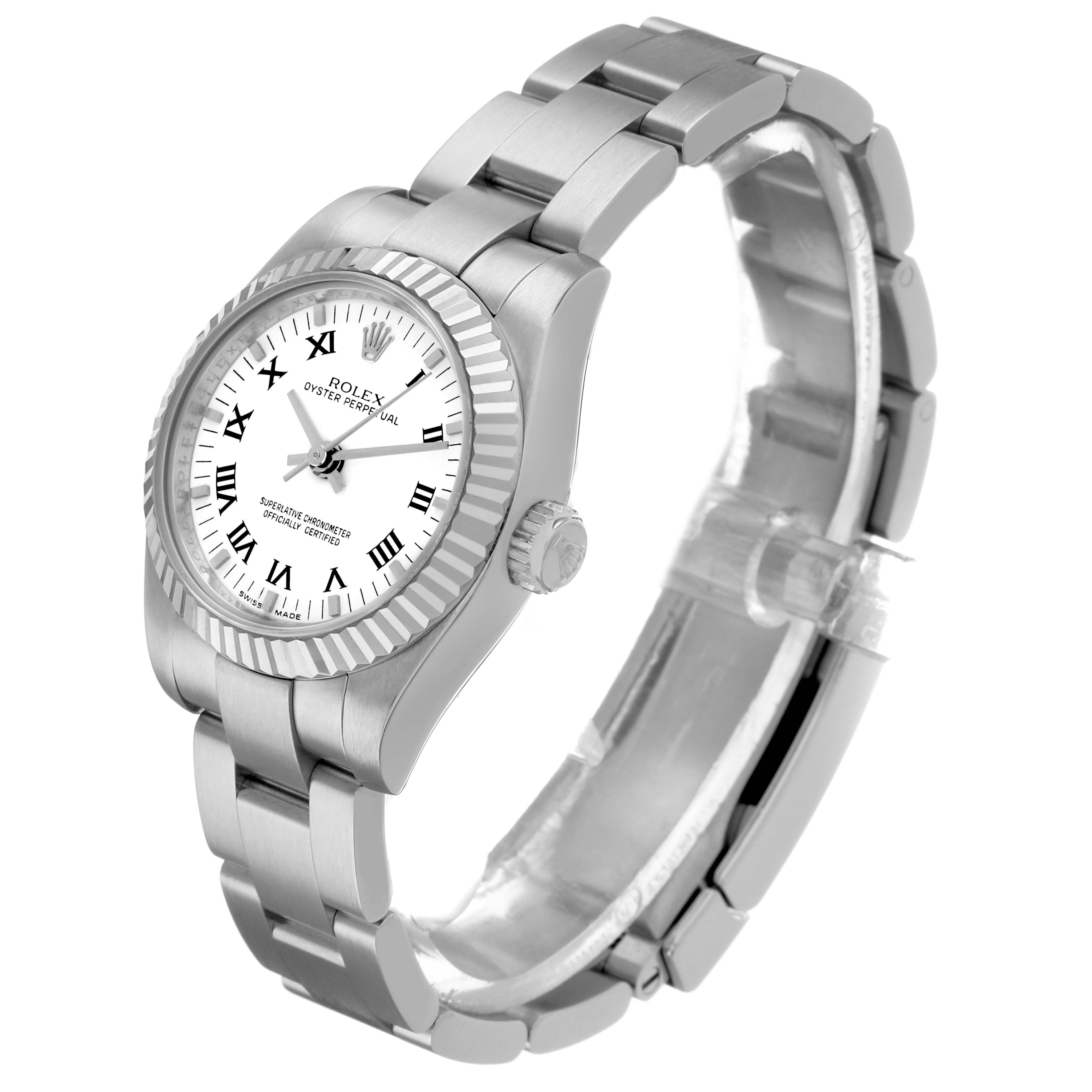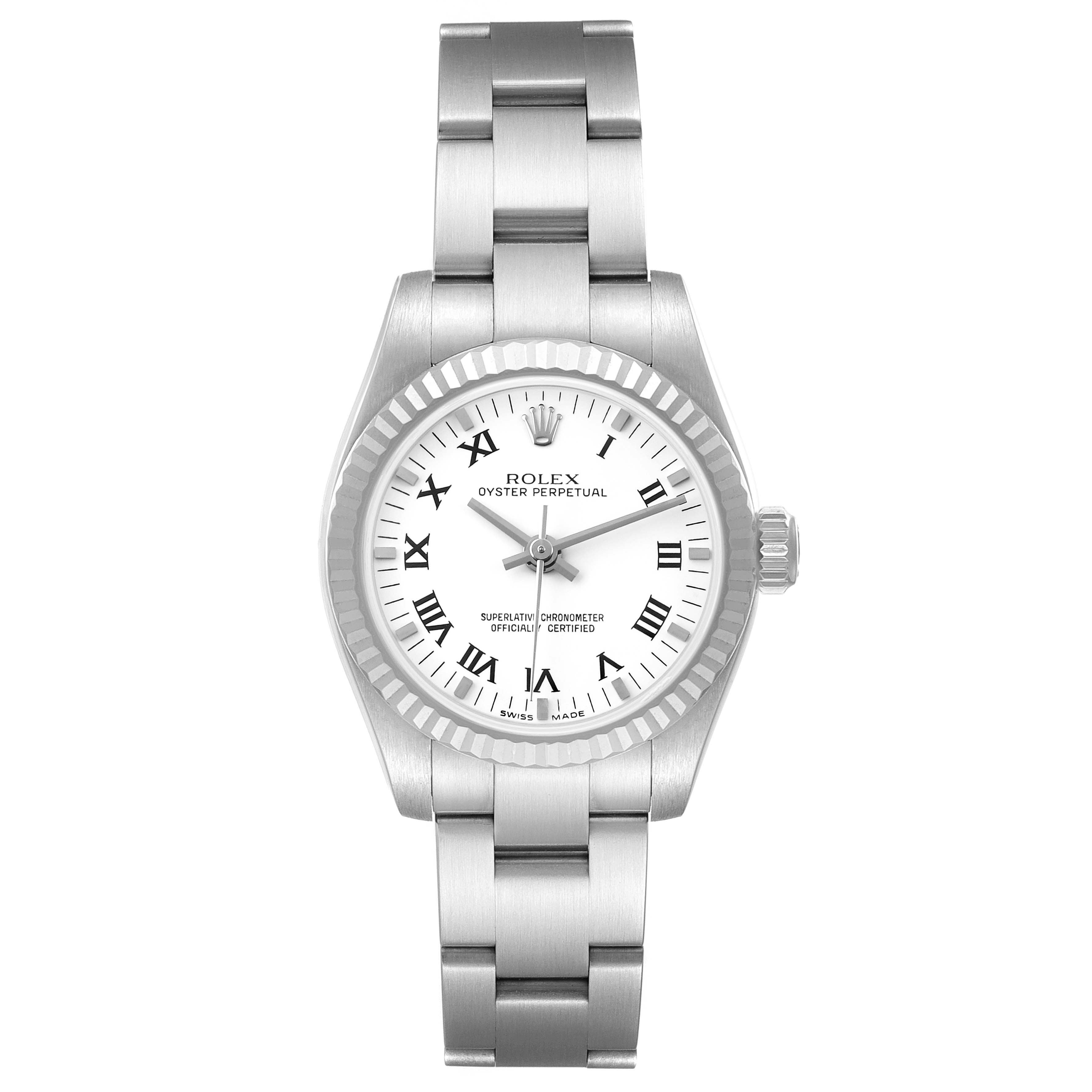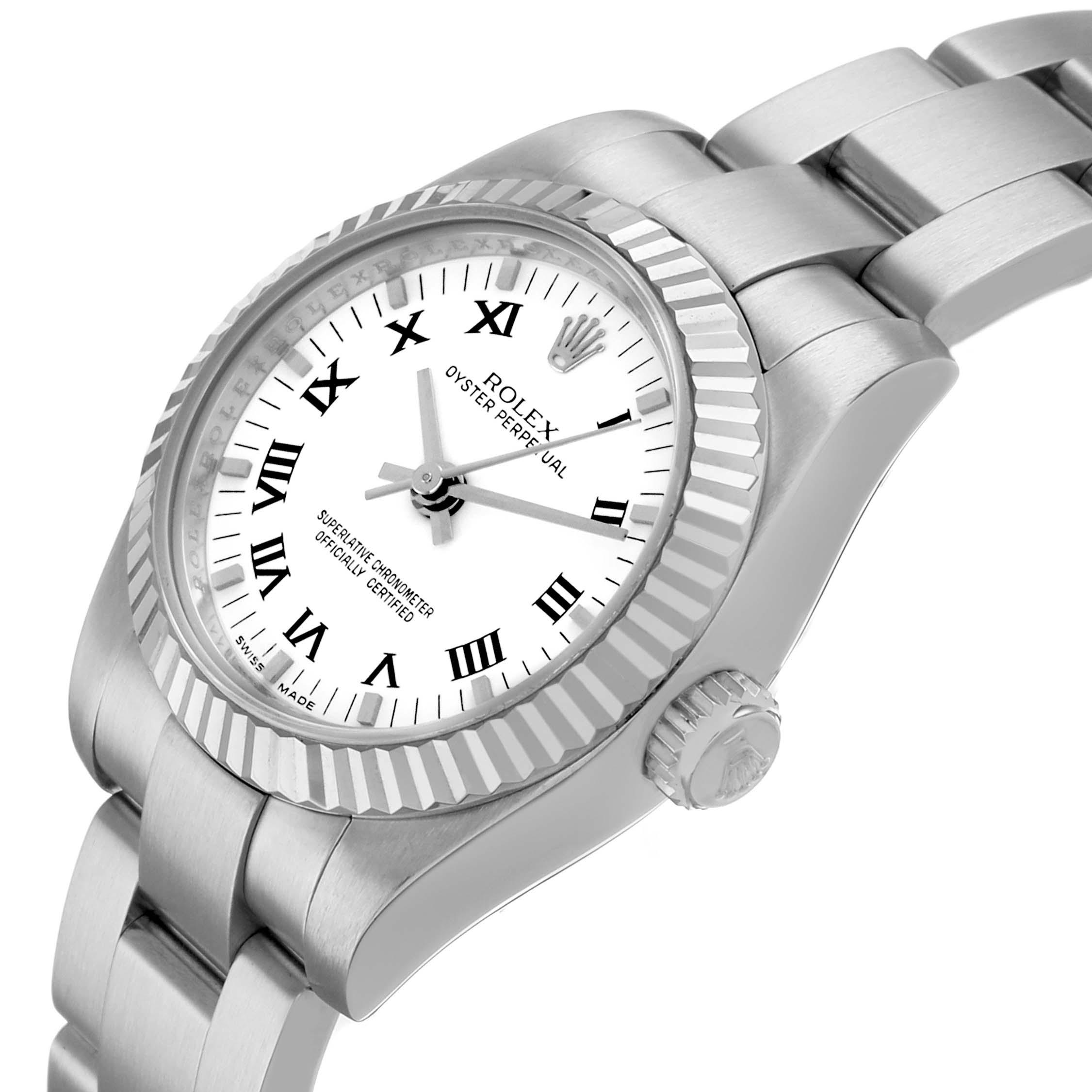 Rolex Oyster Perpetual 26 Steel White Gold White Dial Ladies Watch 176234. Officially certified chronometer self-winding movement. Stainless steel oyster case 26.0 mm in diameter. Rolex logo on a crown. 18K white gold fluted bezel. Scratch resistant sapphire crystal. White dial with black inner Roman numerals. Raised 18k white gold outer hour markers. 18K white gold hour, minute, and second hands. Stainless steel oyster bracelet with a deployent buckle. Fits a 6 1/2" wrist.