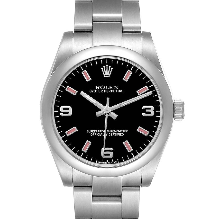 Rolex Oyster Perpetual 31 Midsize Steel Pink Ladies Watch 177200 Card. Officially certified chronometer automatic self-winding movement with quickset date function. Stainless steel oyster case 31.0 mm in diameter. Rolex logo on the crown. Stainless steel smooth bezel. Scratch resistant sapphire crystal. Black dial with raised pink luminescent baton hour markers and Arabic numerals. Luminescent baton hands. Stainless steel oyster bracelet with an oysterlock clasp. Fits a 7" wrist.