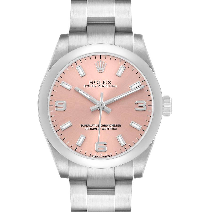 Rolex Oyster Perpetual 31 Midsize Steel Salmon Dial Ladies Watch 177200 Card. Officially certified chronometer automatic self-winding movement with quickset date function. Stainless steel oyster case 31.0 mm in diameter. Rolex logo on crown. Stainless steel smooth bezel. Scratch resistant sapphire crystal. Salmon pink dial with luminous baton hour markers and raised white gold Arabic numerals at 3, 6, and 9. Stainless steel oyster bracelet with an oysterlock clasp. Fits a 7" wrist.
