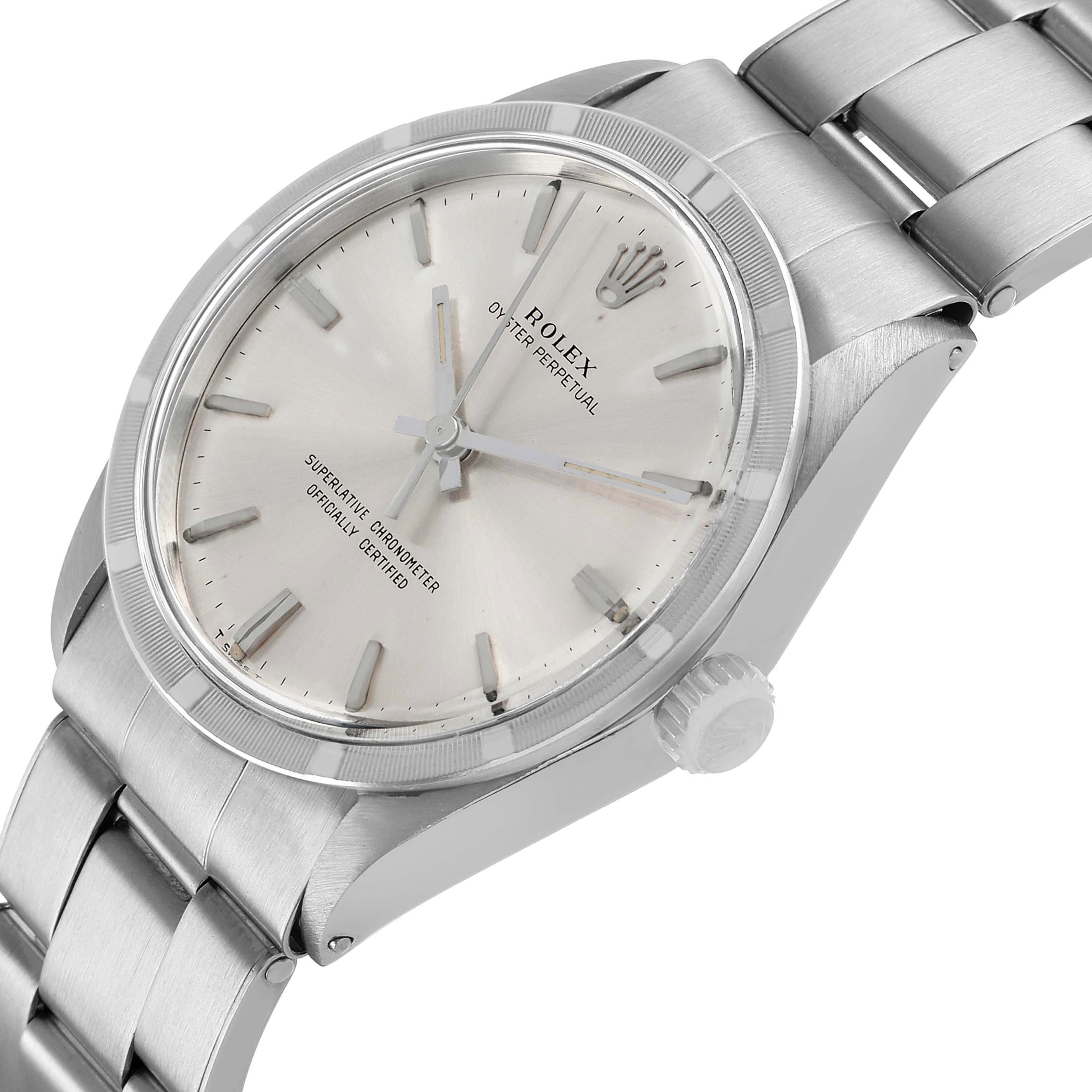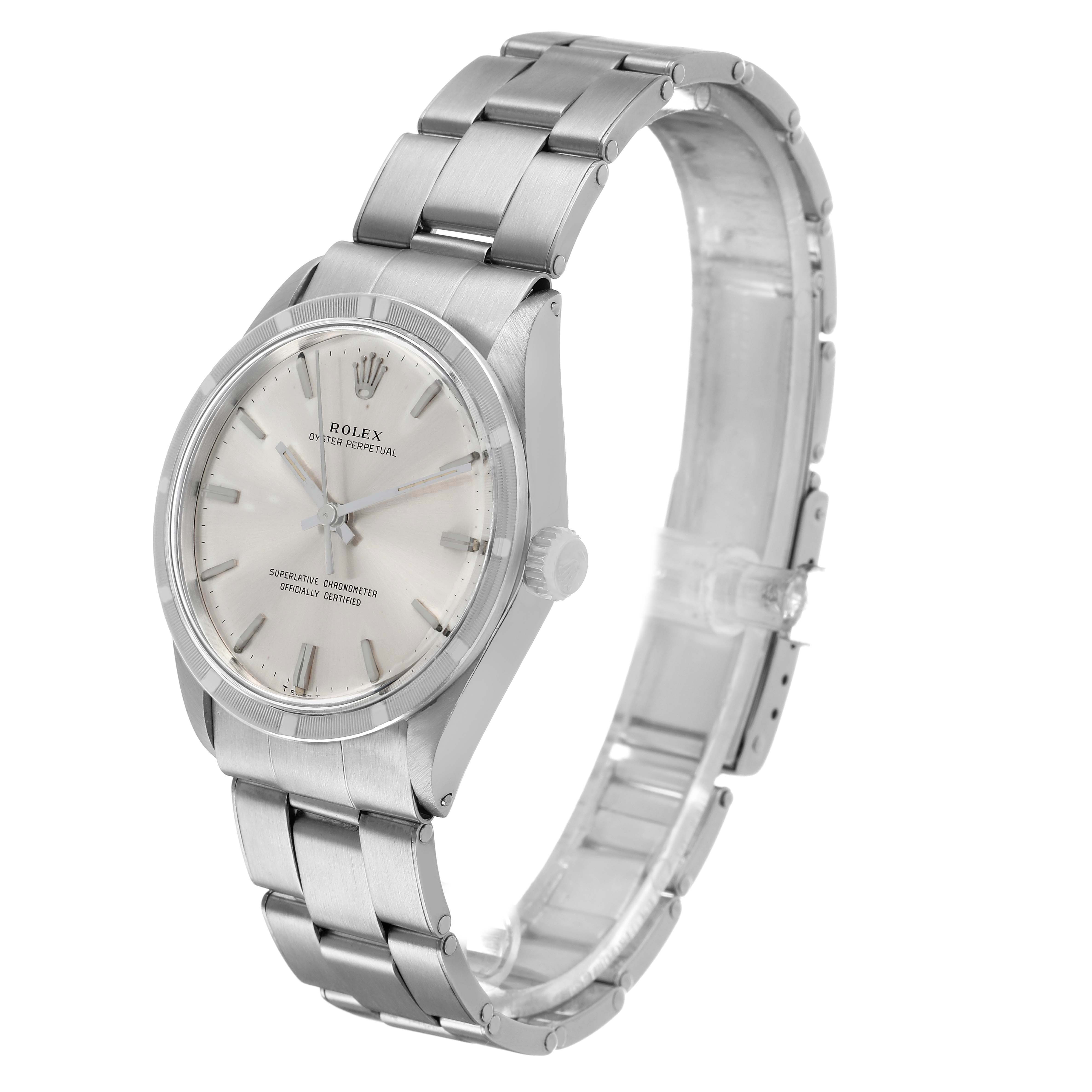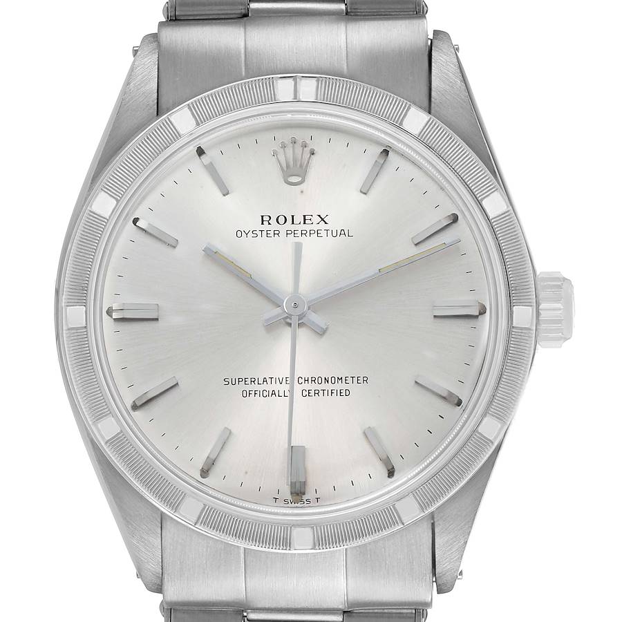 Rolex Oyster Perpetual 34 Silver Dial Engine Turned Bezel Vintage Steel Mens Watch 1007. Officially certified chronometer automatic self-winding movement. Stainless steel oyster case 34.0 mm in diameter. Rolex logo on the crown. Stainless steel engine turned bezel. Acrylic crystal. Silver dial with baton hour markers and tritium-inlay hands. Stainless steel oyster bracelet with a fold-over clasp. Fits a 7 3/4" wrist.