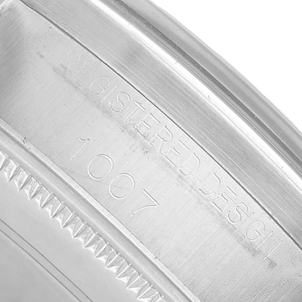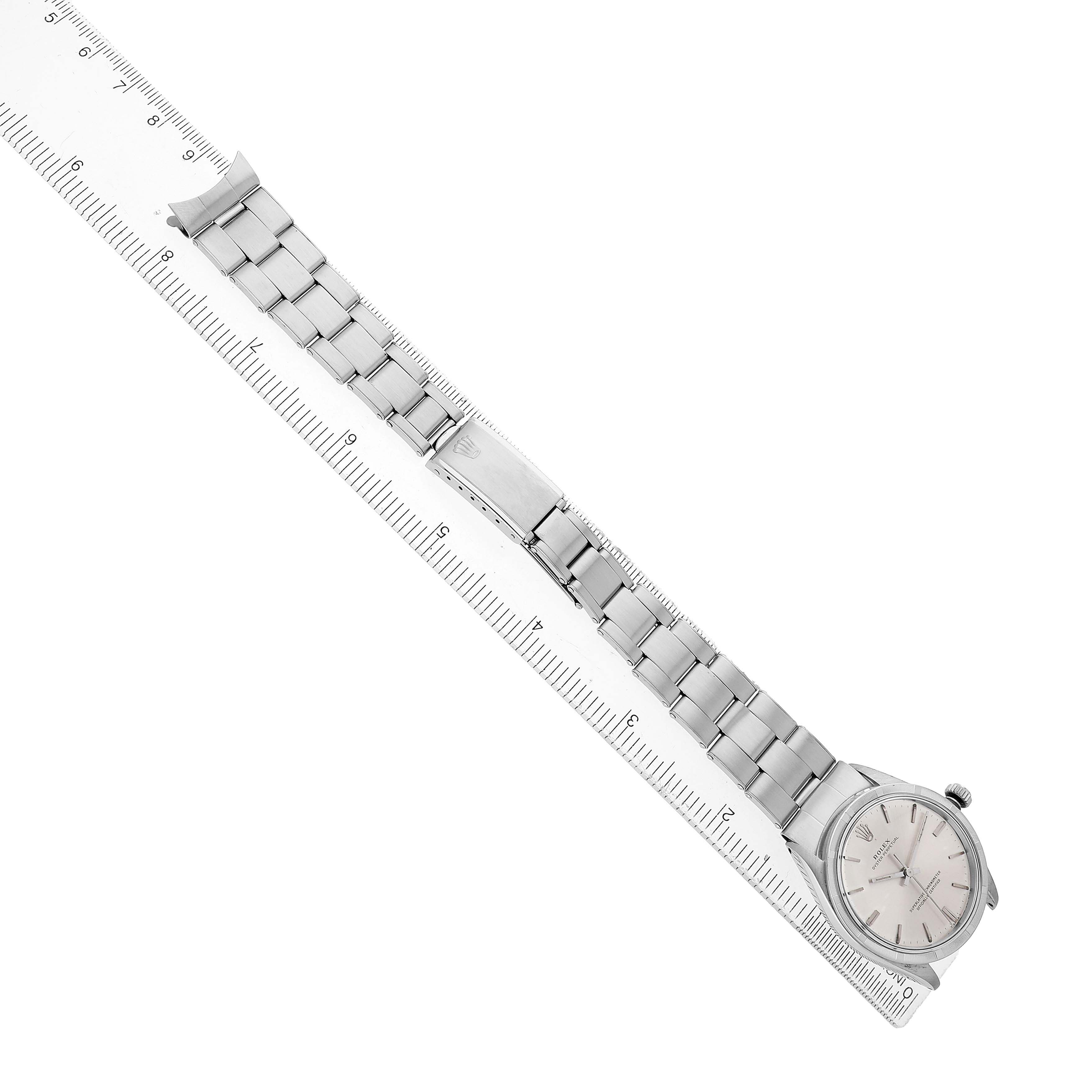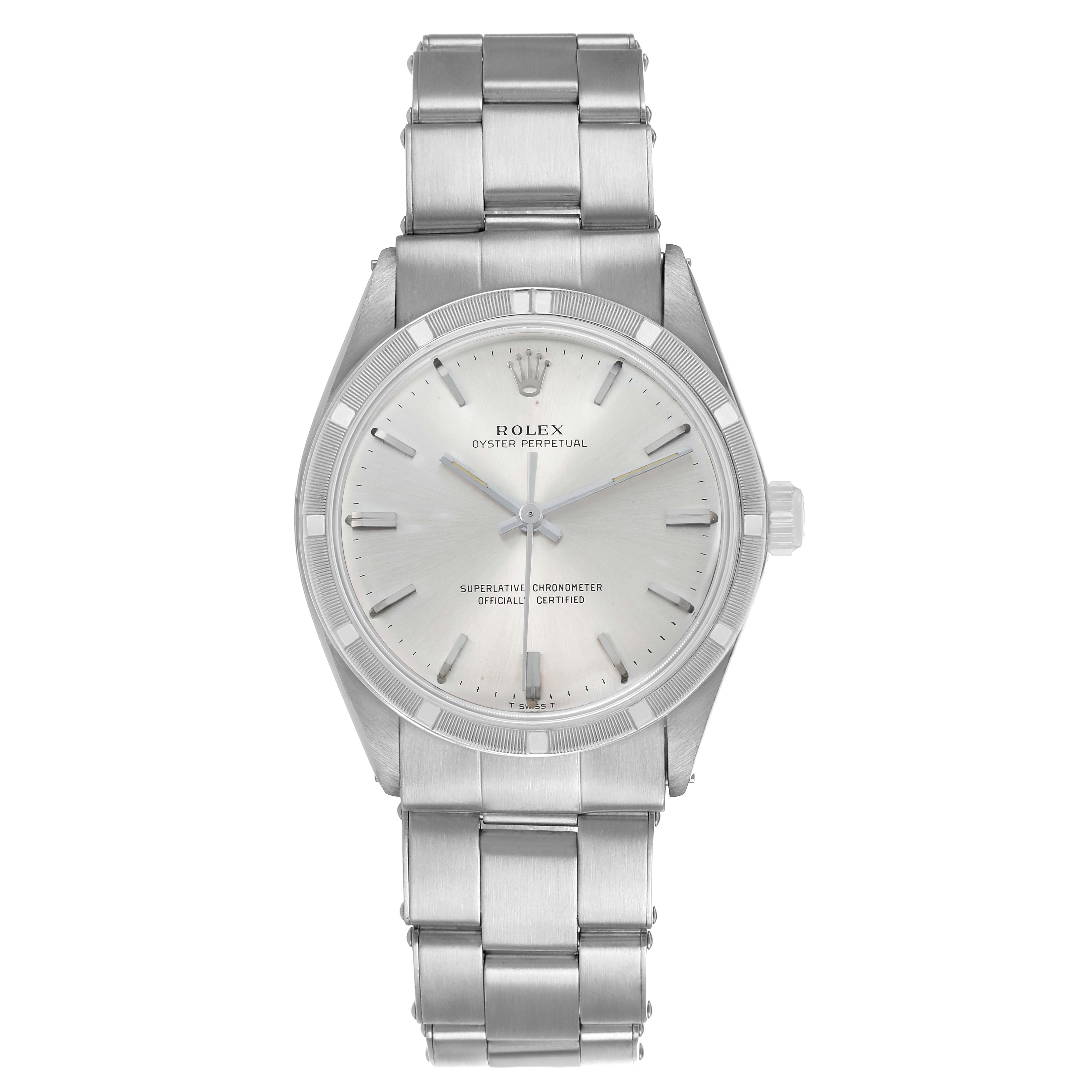 Rolex Oyster Perpetual 34 Silver Dial Engine Turned Bezel Vintage Steel Mens Watch 1007. Officially certified chronometer automatic self-winding movement. Stainless steel oyster case 34.0 mm in diameter. Rolex logo on the crown. Stainless steel engine turned bezel. Acrylic crystal. Silver dial with baton hour markers and tritium-inlay hands. Stainless steel oyster bracelet with a fold-over clasp. Fits a 7 3/4" wrist.