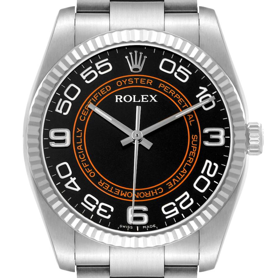 Rolex Oyster Perpetual 36 Harley Dial Steel White Gold Mens Watch 116034. Officially certified chronometer self-winding movement. Stainless steel case 36.0 mm in diameter. Rolex logo on a crown. 18K white gold fluted bezel. Scratch resistant sapphire crystal. Black and brown Harley dial with white arabic numerals. Stainless steel oyster bracelet with fold over clasp. Fits 7 1/4" wrist.
