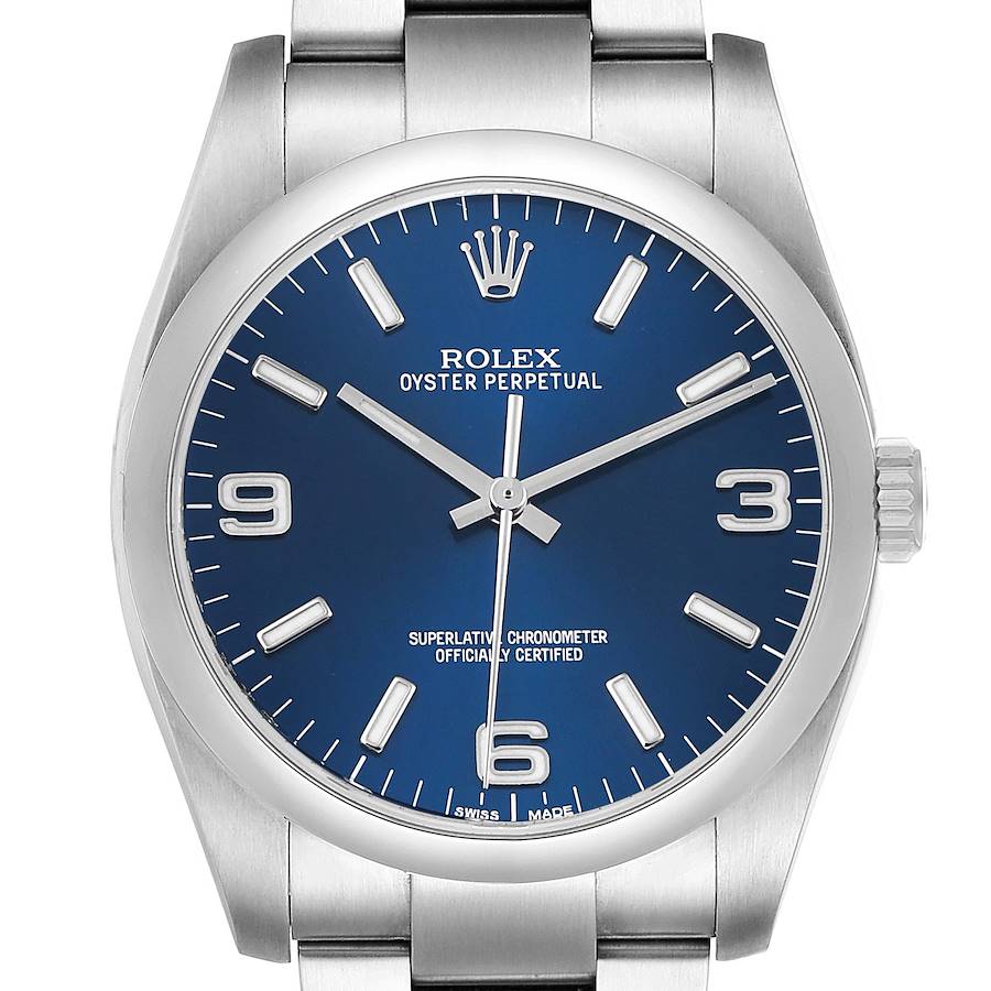 Rolex Oyster Perpetual 36 Steel Blue Dial Mens Watch 116000. Officially certified chronometer automatic self-winding movement. Stainless steel case 36.0 mm in diameter. Rolex logo on a crown. Stainless steel smooth domed bezel. Scratch resistant sapphire crystal. Blue dial with luminescent baton hour markers with Arabic numerals at 3,6, and 9. Luminescent baton hands. Stainless steel oyster bracelet with an oysterlock clasp. Fits a 7 1/4" wrist.