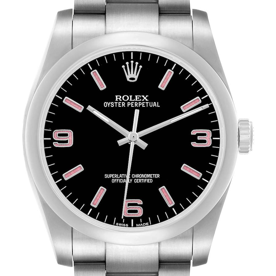Rolex Oyster Perpetual 36 Steel Pink Baton Black Mens Watch 116000. Officially certified chronometer self-winding movement. Stainless steel oyster case 36.0 mm in diameter. Rolex logo on the crown. Stainless steel smooth domed bezel. Scratch resistant sapphire crystal. Black dial with luminescent baton hands and pink luminescent baton hour markers. Pink luminescent Arabic numerals at 3, 6, and 9 o'clock. Stainless steel oyster bracelet with an Oysterlock clasp. Fits a 6.5" wrist.