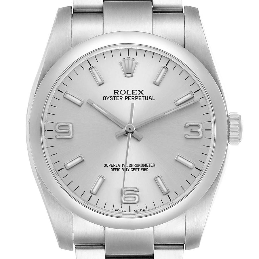 Rolex Oyster Perpetual 36 Steel Silver Dial Mens Watch 116000. Officially certified chronometer self-winding movement. Stainless steel oyster case 36.0 mm in diameter. Rolex logo on the crown. Stainless steel smooth domed bezel. Scratch resistant sapphire crystal. Silver dial with luminescent baton hands and luminescent baton hour markers. Luminescent Arabic numerals at 3, 6, and 9 o'clock. Stainless steel oyster bracelet with an Oysterlock clasp. Fits a 7 1/4" wrist.