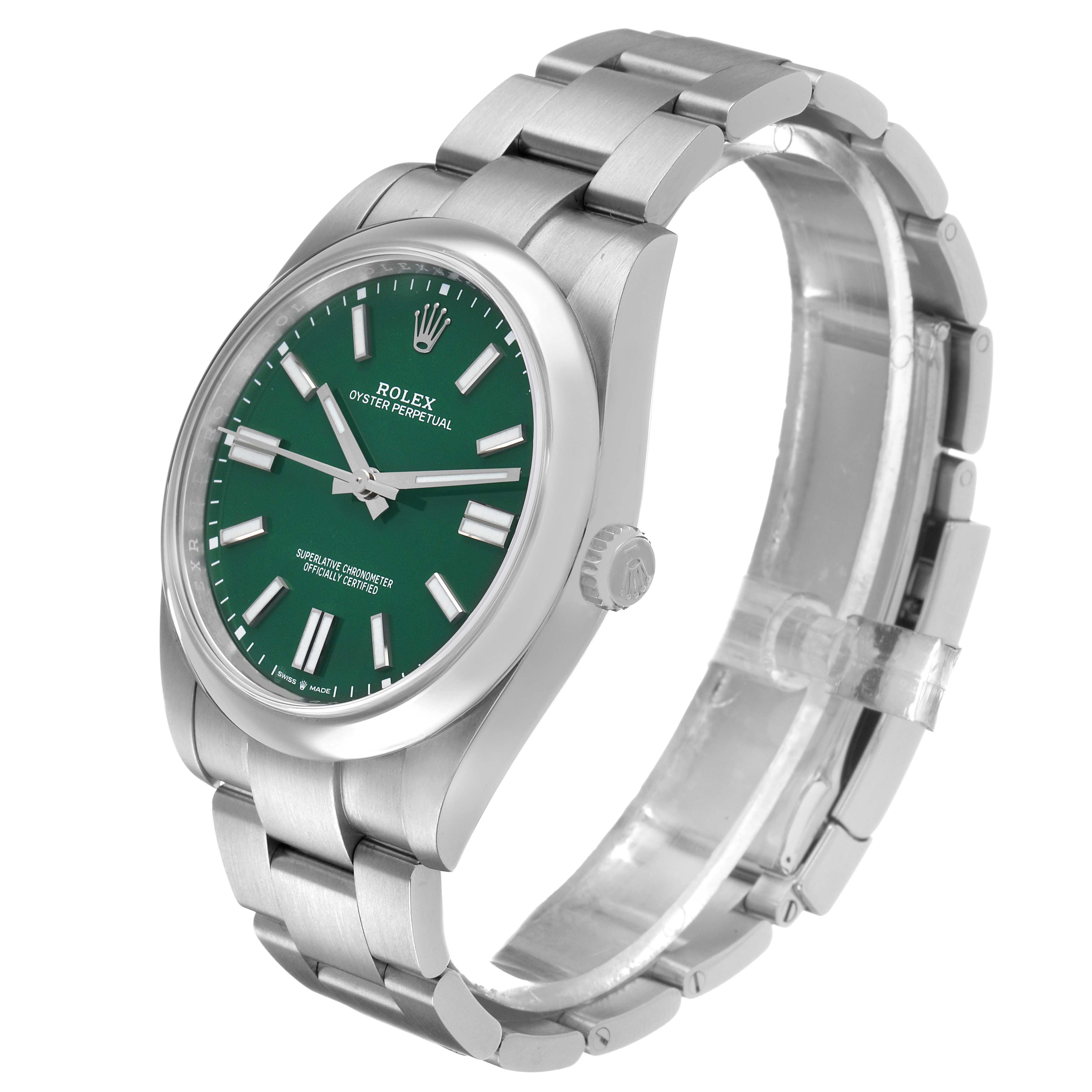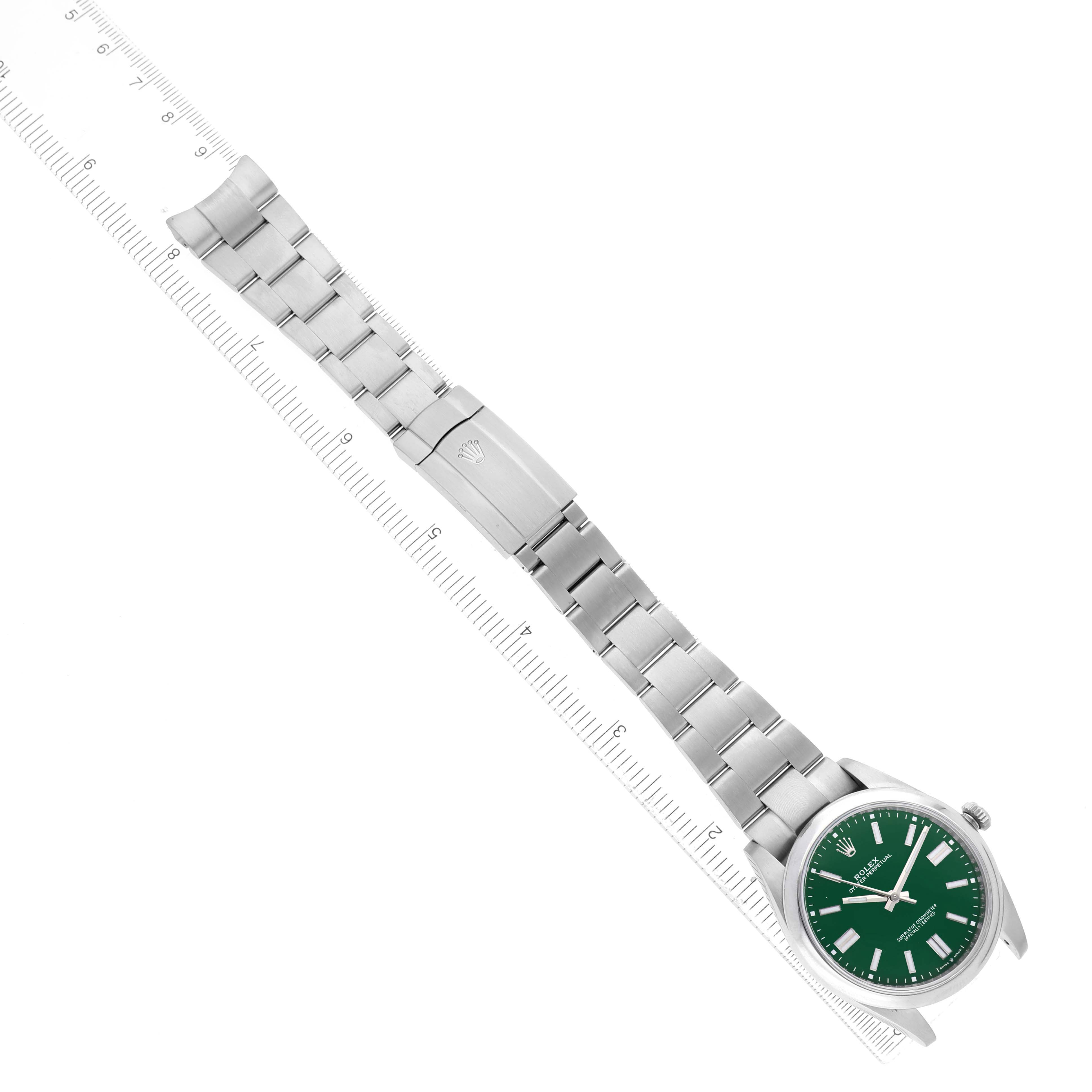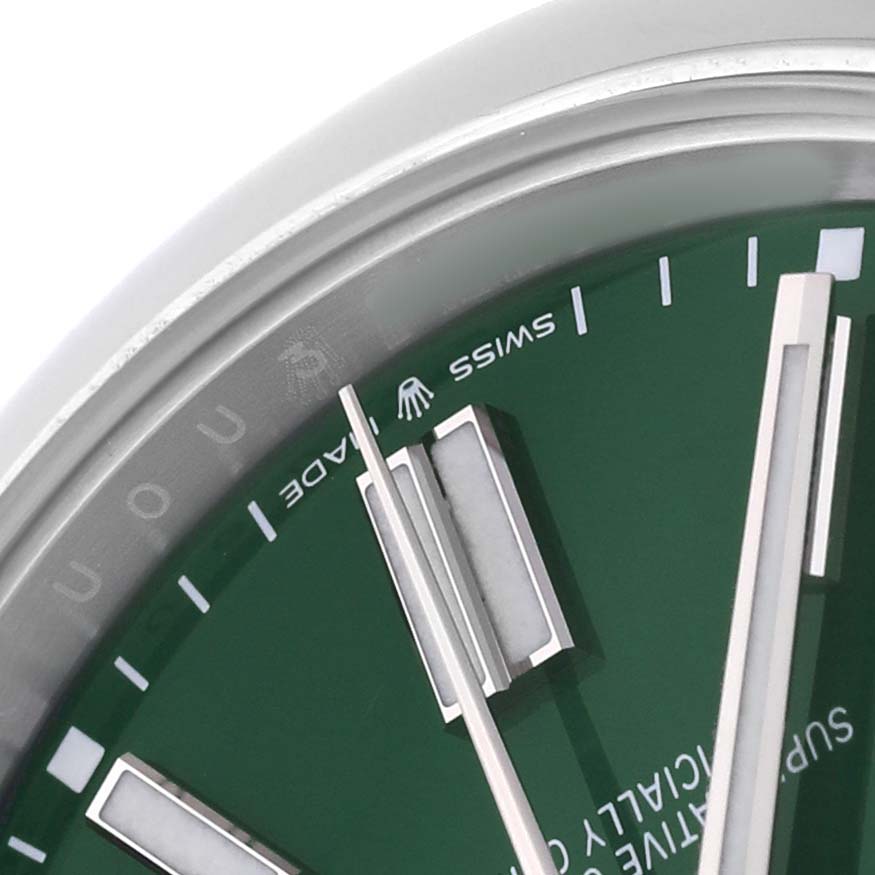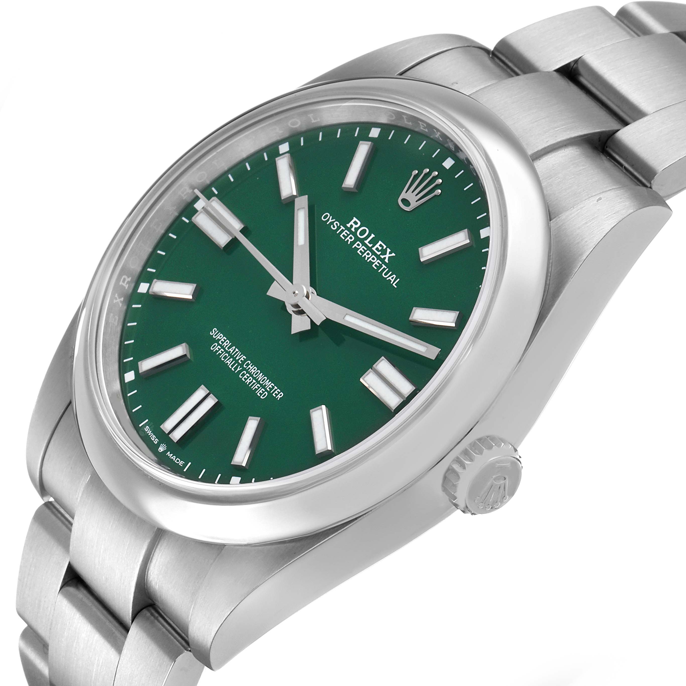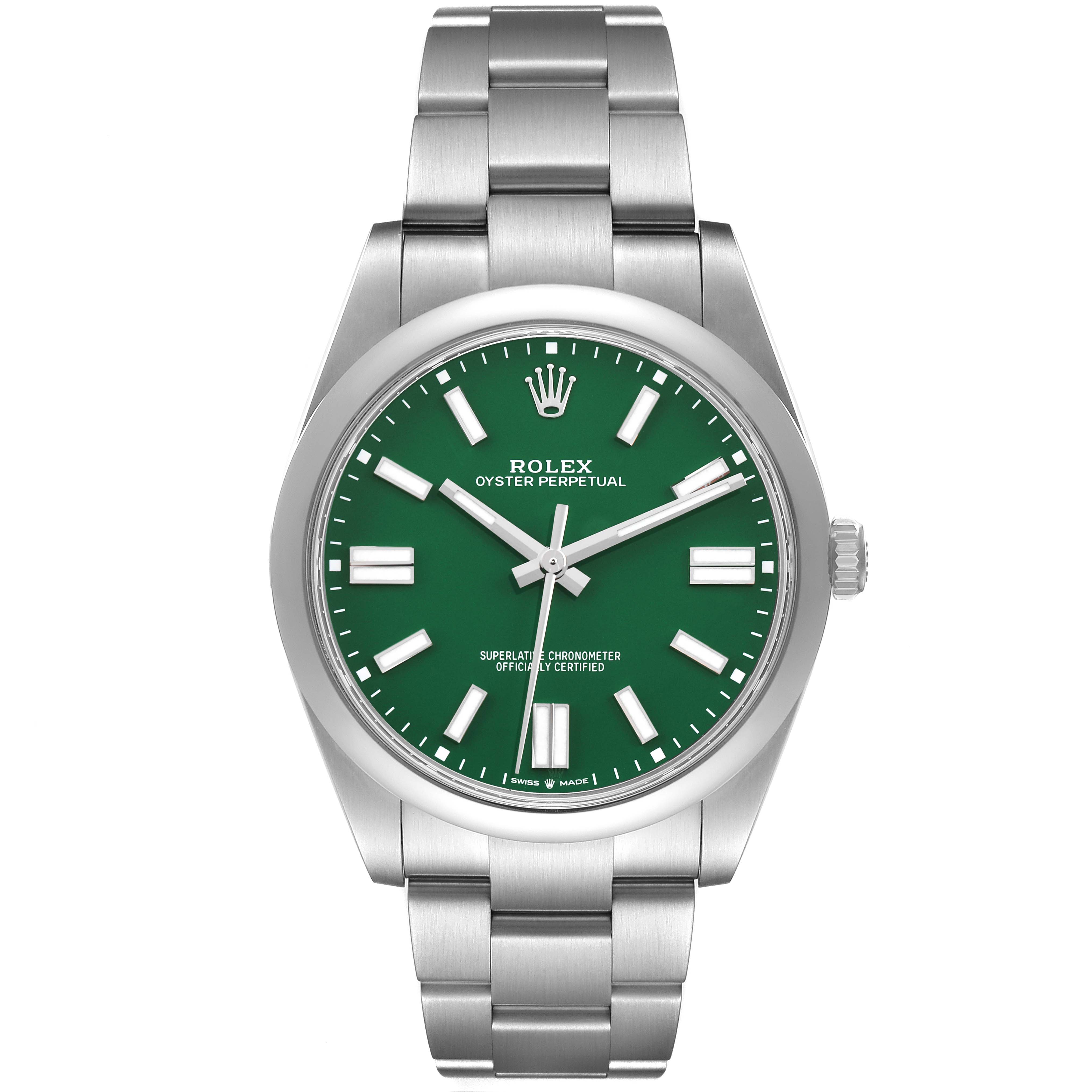 Rolex Oyster Perpetual 41 Steel Green Dial Mens Watch 124300 Card. Officially certified chronometer automatic self-winding movement. Stainless steel oyster case 41.0 mm in diameter. Rolex logo on the crown. Stainless steel smooth bezel. Scratch resistant sapphire crystal. Green dial with steel luminescent-inlay baton hour markers and hands. Outer white stick minute markers. Stainless steel oyster bracelet with an oysterlock clasp and easylink micro-adjustment. Fits a 7 3/4" wrist.