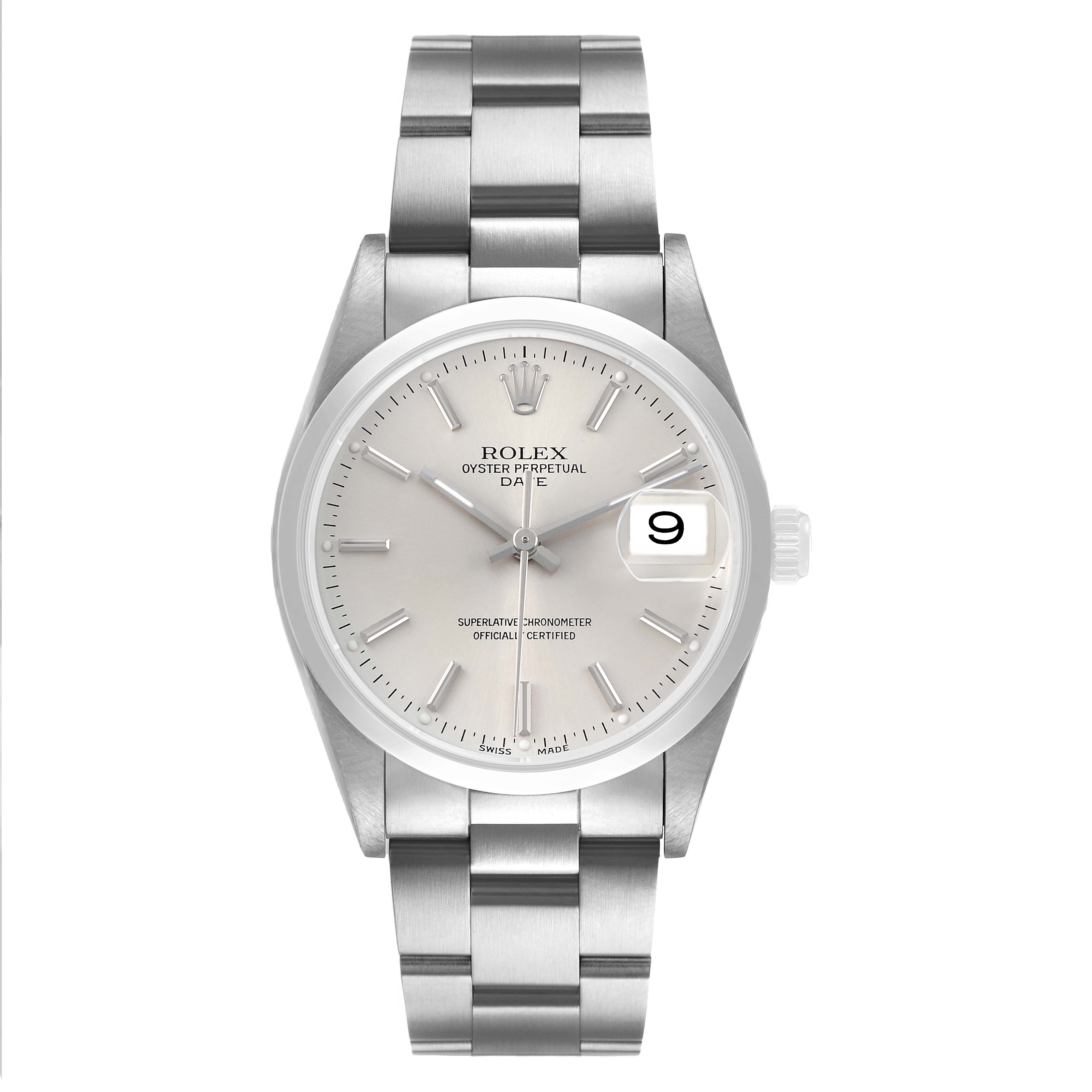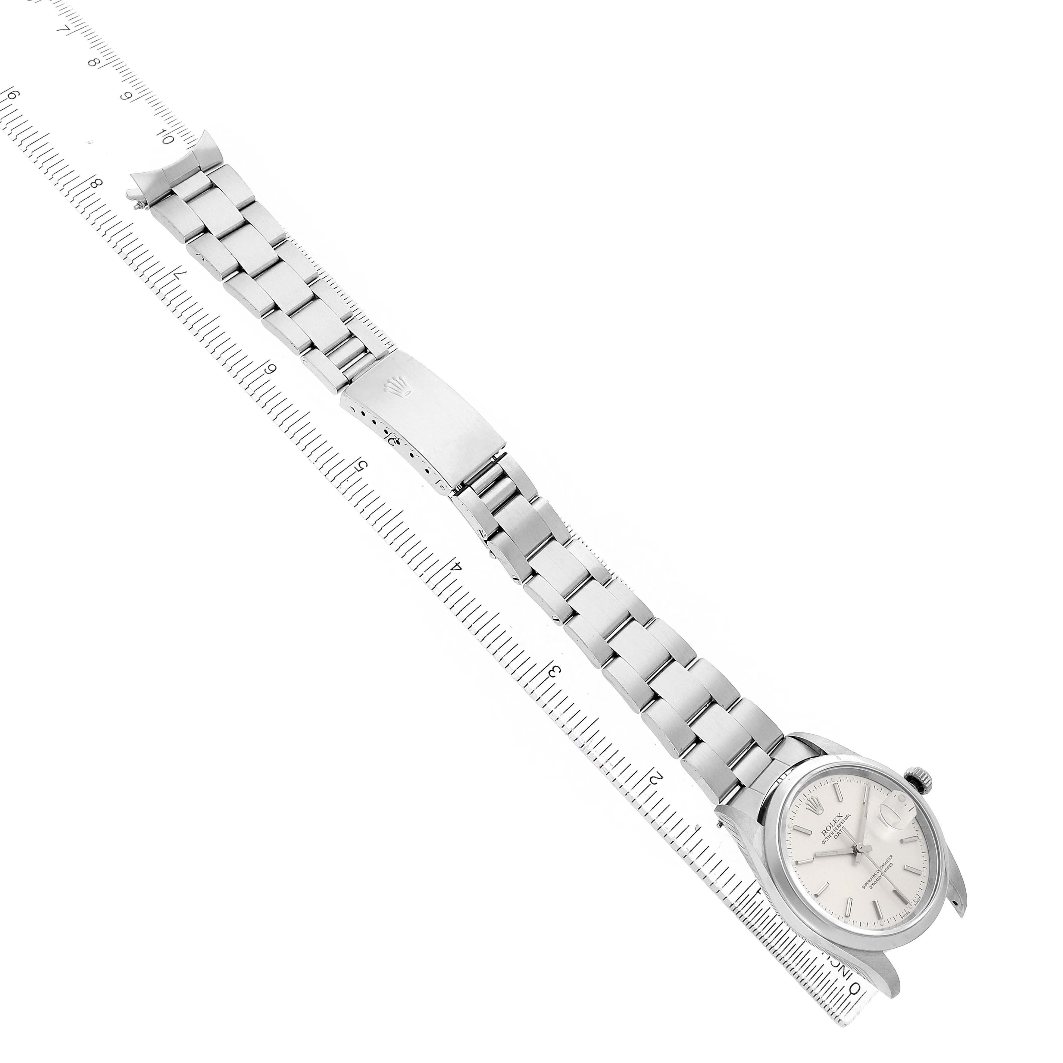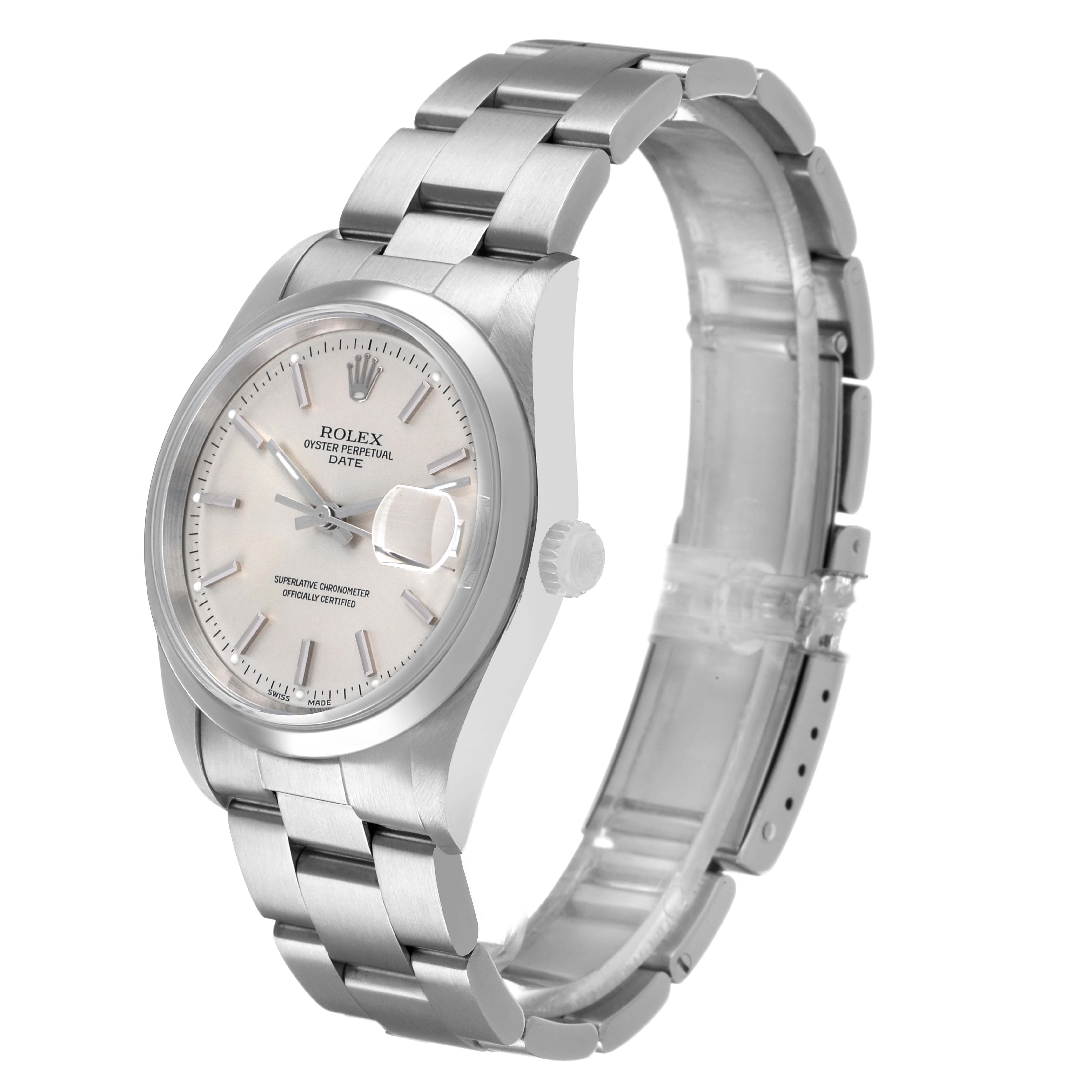 Rolex Oyster Perpetual Date Silver Dial Steel Mens Watch 15200. Officially certified chronometer automatic self-winding movement. Stainless steel oyster case 34.0 mm in diameter. Rolex logo on the crown. Stainless steel smooth domed bezel. Scratch resistant sapphire crystal with a cyclops magnifier. Silver dial with luminescent baton hands and hour markers. Date calendar at the 3 o'clock aperture. Outer stick minute markers. Stainless steel oyster bracelet with a folding clasp. Fits a 7 1/4" wrist.