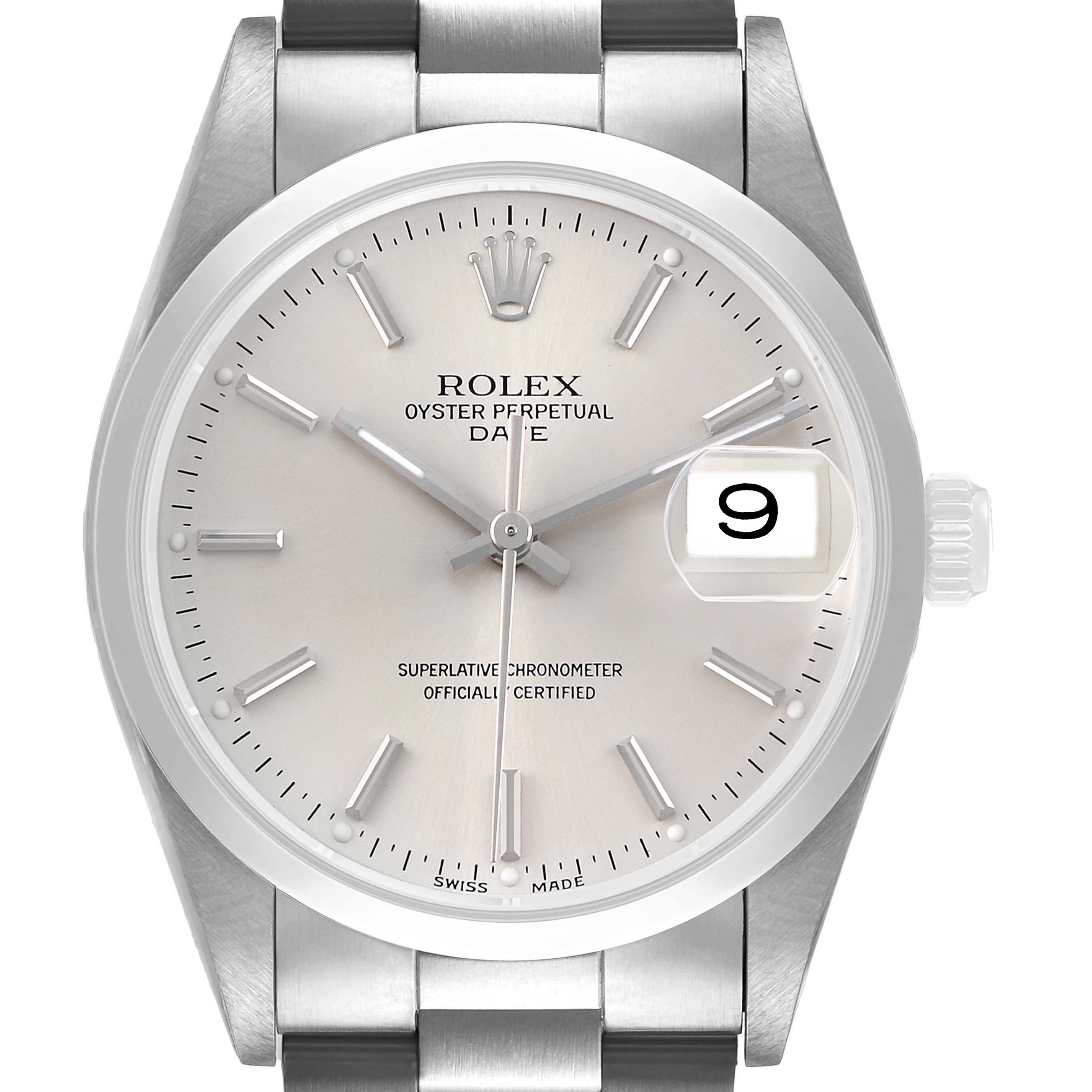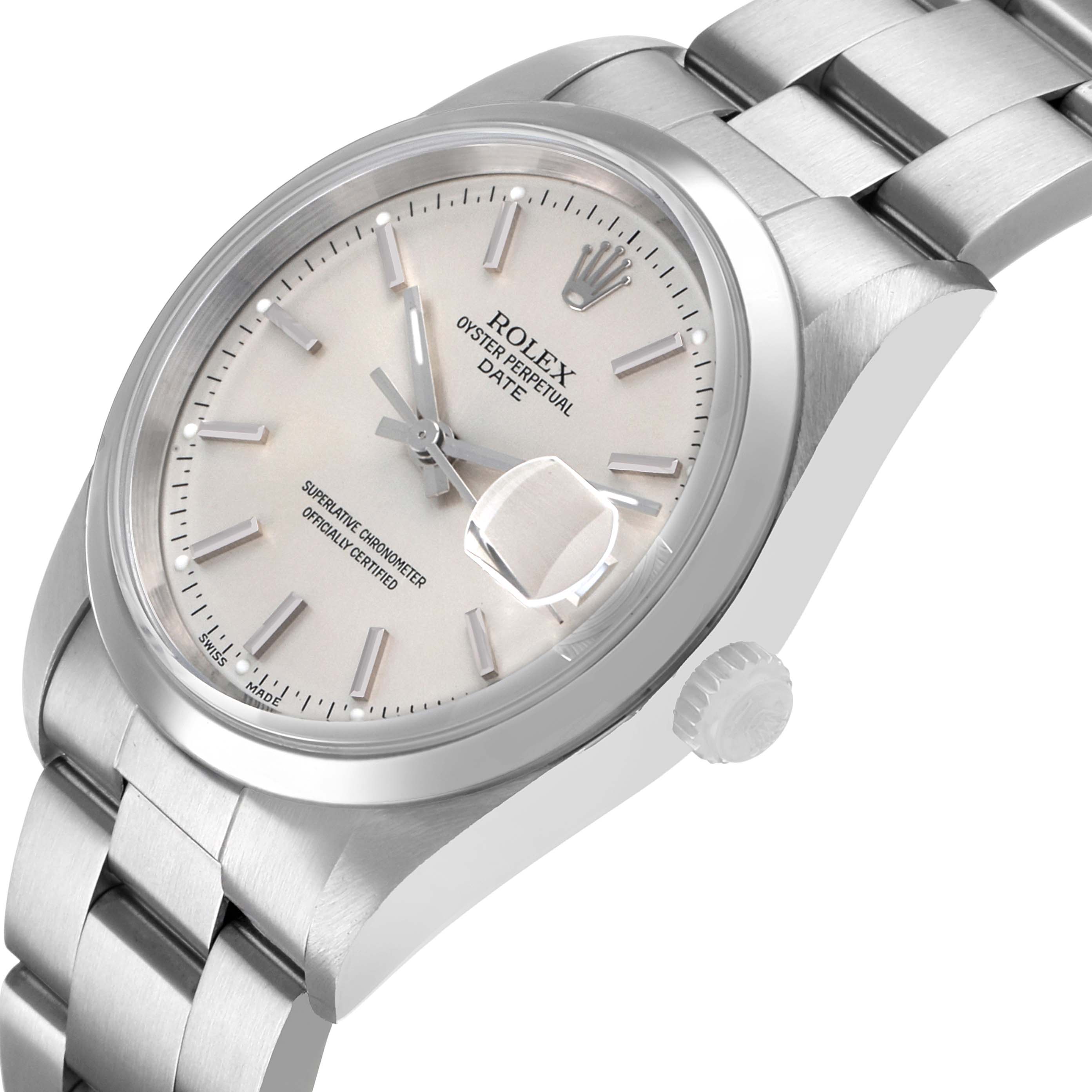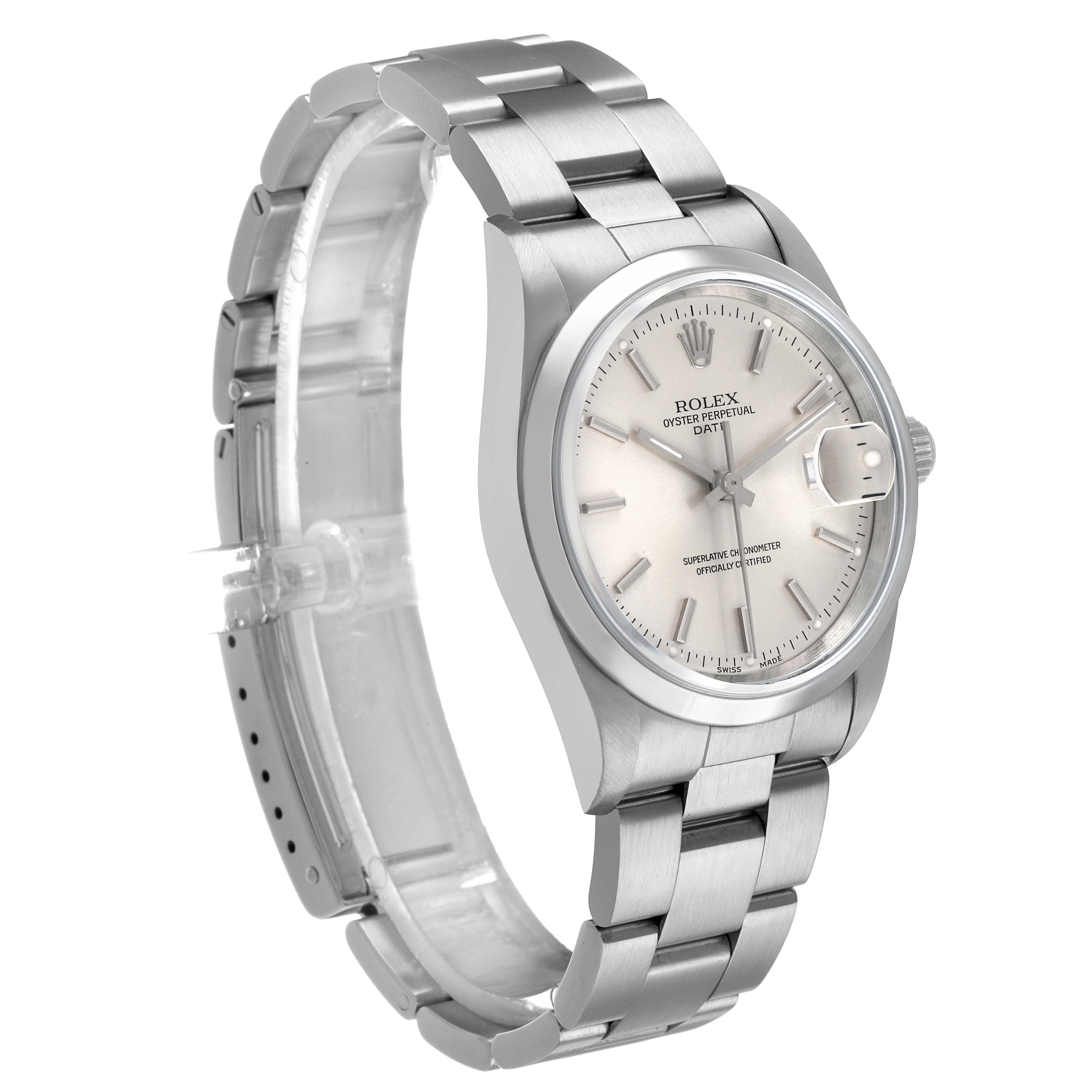 Rolex Oyster Perpetual Date Silver Dial Steel Mens Watch 15200. Officially certified chronometer automatic self-winding movement. Stainless steel oyster case 34.0 mm in diameter. Rolex logo on the crown. Stainless steel smooth domed bezel. Scratch resistant sapphire crystal with a cyclops magnifier. Silver dial with luminescent baton hands and hour markers. Date calendar at the 3 o'clock aperture. Outer stick minute markers. Stainless steel oyster bracelet with a folding clasp. Fits a 7 1/4" wrist.