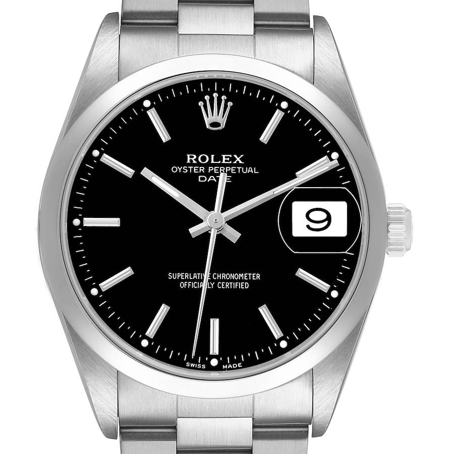 Rolex Oyster Perpetual Date Steel Black Dial Mens Watch 15200. Officially certified chronometer automatic self-winding movement. Stainless steel oyster case 34.0 mm in diameter. Rolex logo on the crown. Stainless steel smooth bezel. Scratch resistant sapphire crystal with a cyclops magnifier. Black dial with baton hands and hour markers. Date calendar at the 3 o'clock aperture. Stainless steel oyster bracelet with a fold-over clasp. Fits a 7 1/4" wrist.