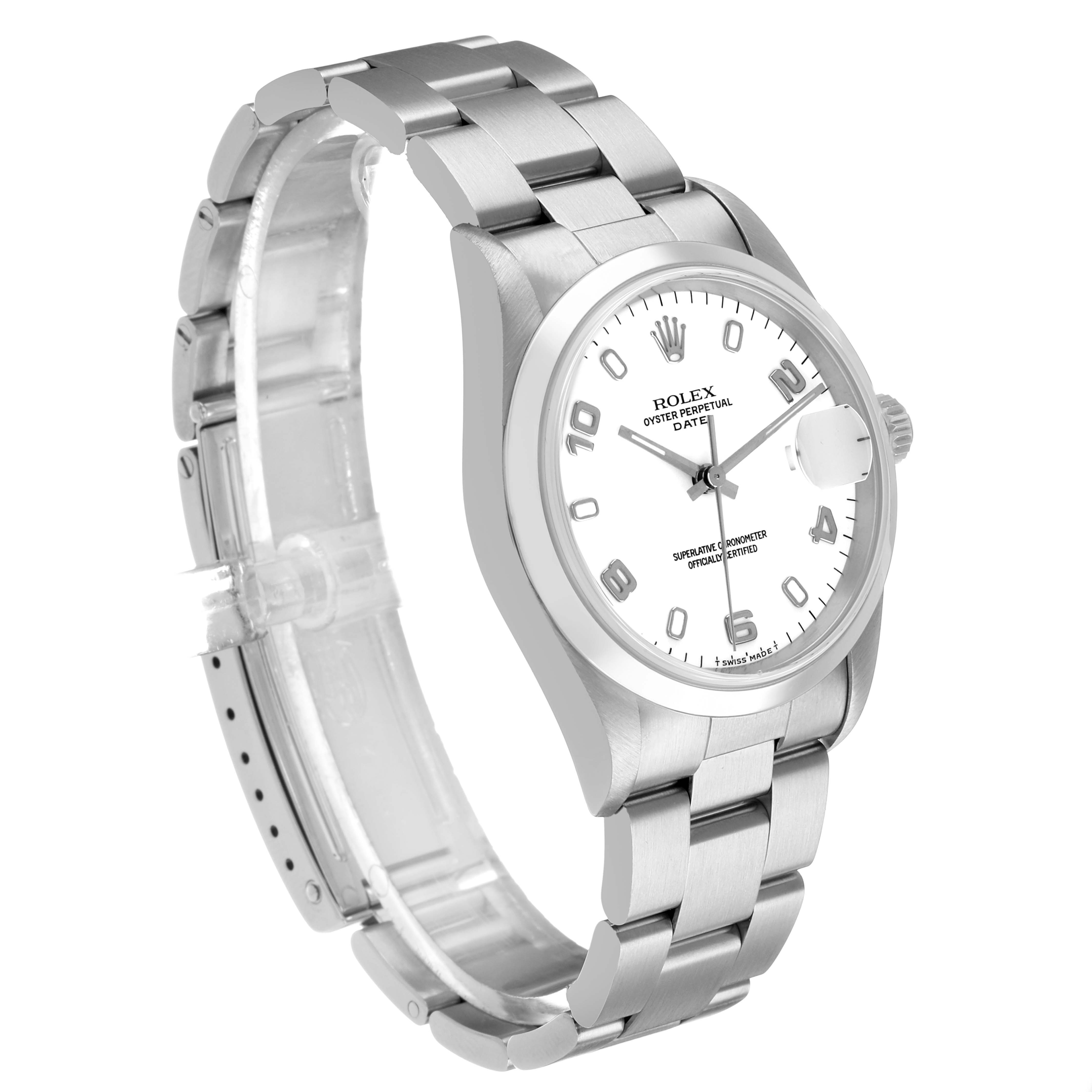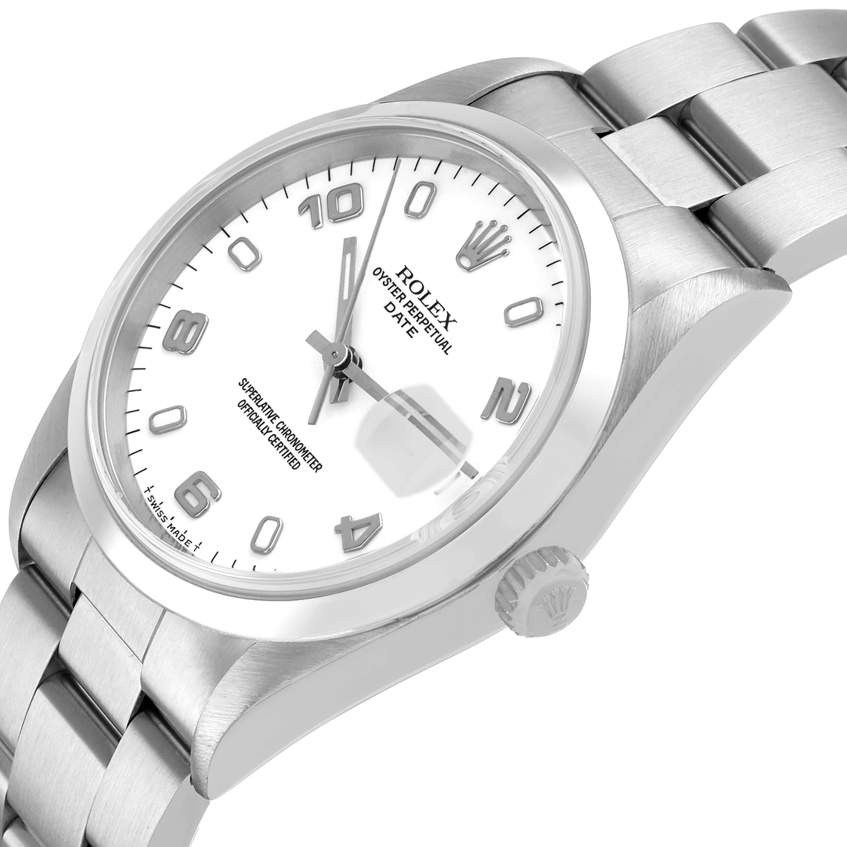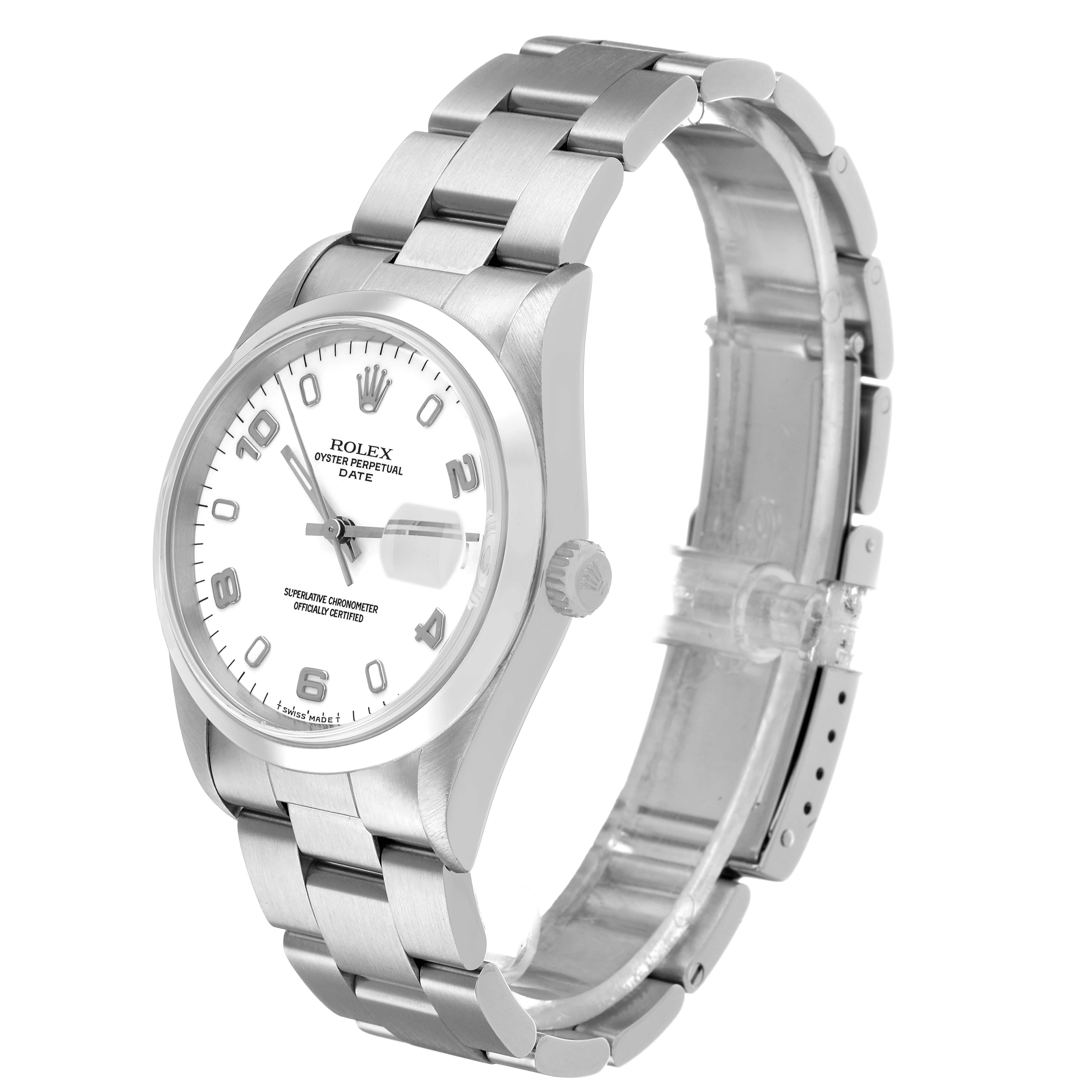 Rolex Oyster Perpetual Date Steel White Dial Mens Watch 15200. Officially certified chronometer automatic self-winding movement. Stainless steel oyster case 34.0 mm in diameter. Rolex logo on the crown. Stainless steel smooth bezel. Scratch resistant sapphire crystal with a cyclops magnifier. White dial with Arabic numerals and luminescent baton hour markers. Luminescent baton hands. Stick minute markers on outer rim. Date calendar at the 3 o'clock aperture. Stainless steel oyster bracelet with a fold-over clasp. Fits a 7 1/2" wrist.