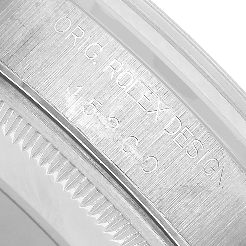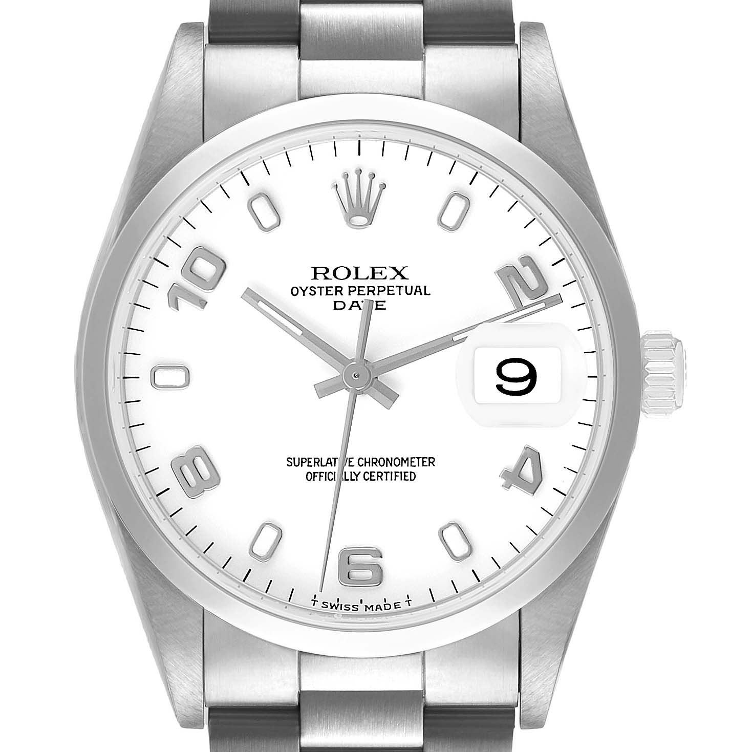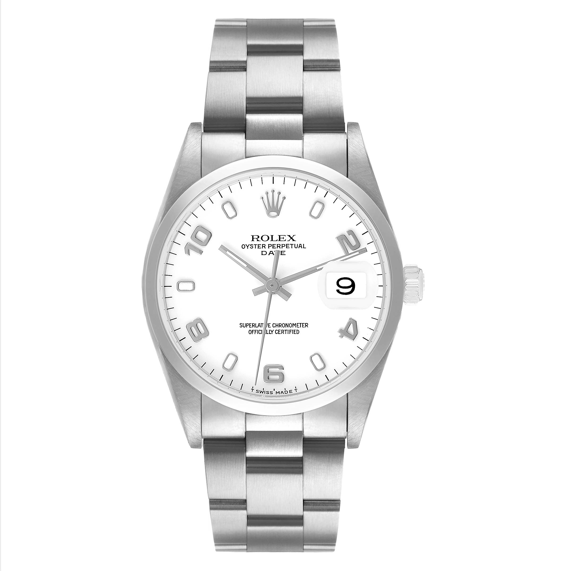 Rolex Oyster Perpetual Date Steel White Dial Mens Watch 15200. Officially certified chronometer automatic self-winding movement. Stainless steel oyster case 34.0 mm in diameter. Rolex logo on the crown. Stainless steel smooth bezel. Scratch resistant sapphire crystal with a cyclops magnifier. White dial with Arabic numerals and luminescent baton hour markers. Luminescent baton hands. Stick minute markers on outer rim. Date calendar at the 3 o'clock aperture. Stainless steel oyster bracelet with a fold-over clasp. Fits a 7 1/2" wrist.
