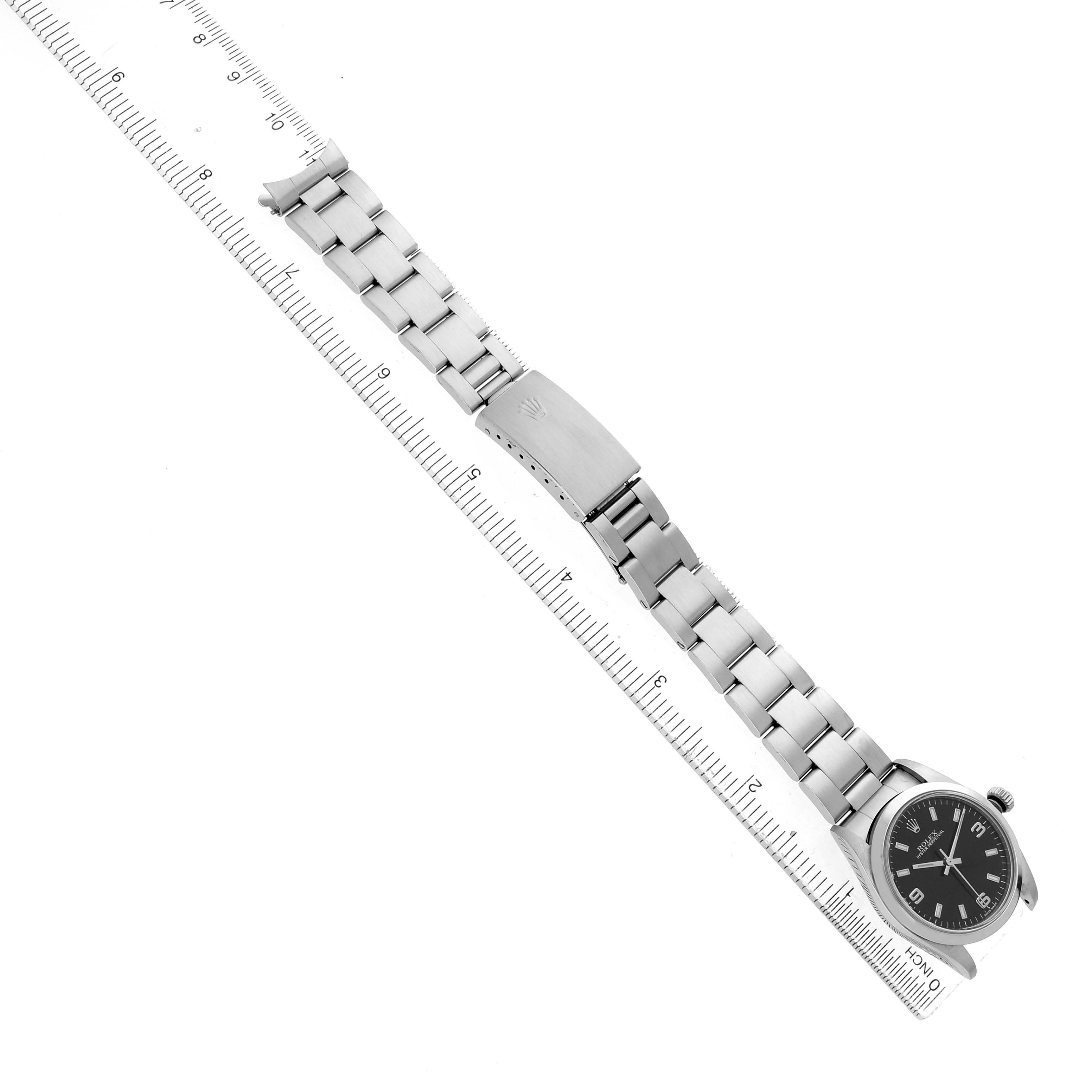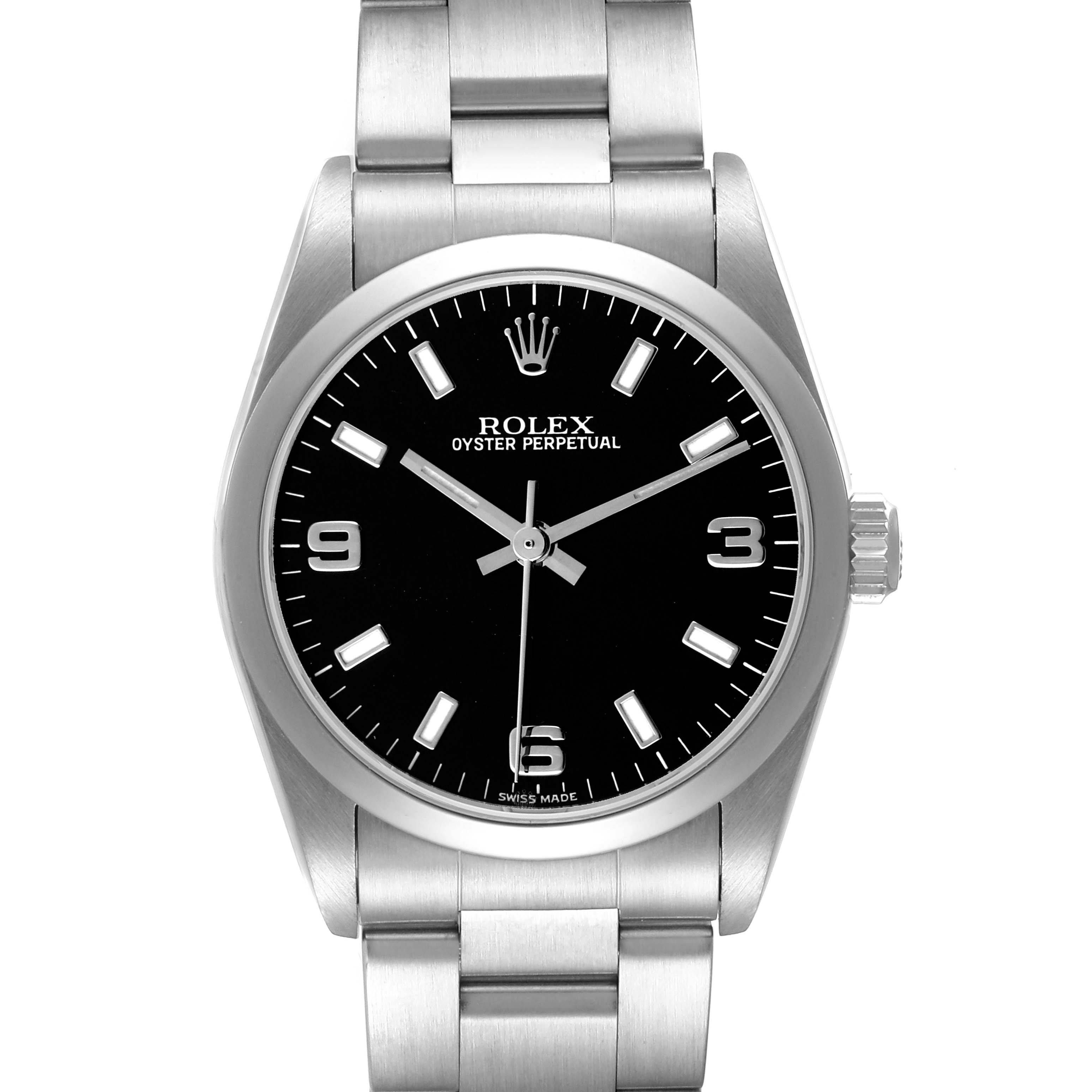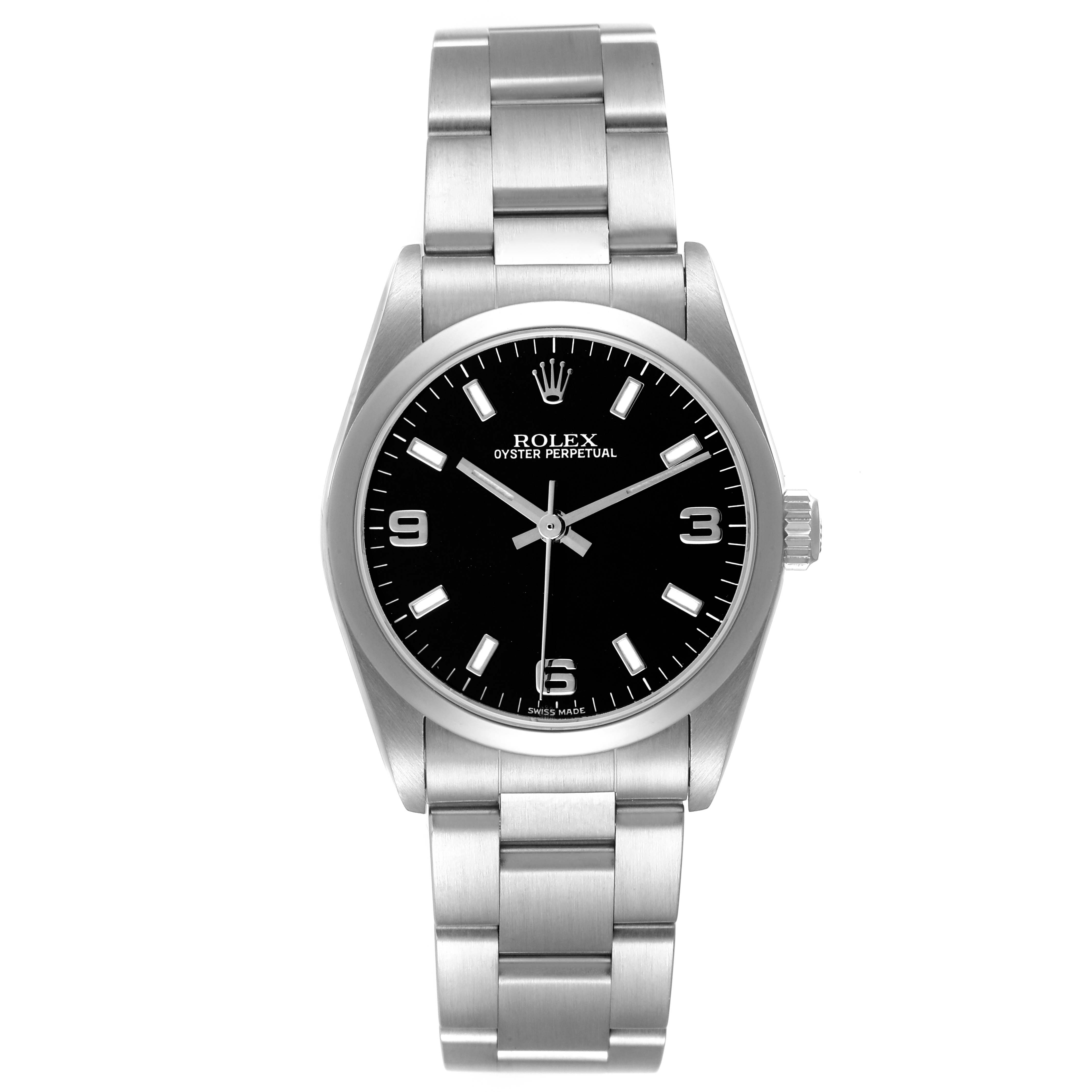 Rolex Oyster Perpetual Midsize 31 Steel Black Dial Ladies Watch 77080. Officially certified chronometer automatic self-winding movement. Stainless steel oyster case 31.0 mm in diameter. Rolex logo on the crown. Stainless steel smooth bezel. Scratch resistant sapphire crystal. Black dial with luminescent baton hands and hour markers. Raised Arabic numerals at 3, 6, and 9 o'clock. Stainless steel oyster bracelet with a fold-over clasp. Fits a 7 1/4" wrist.