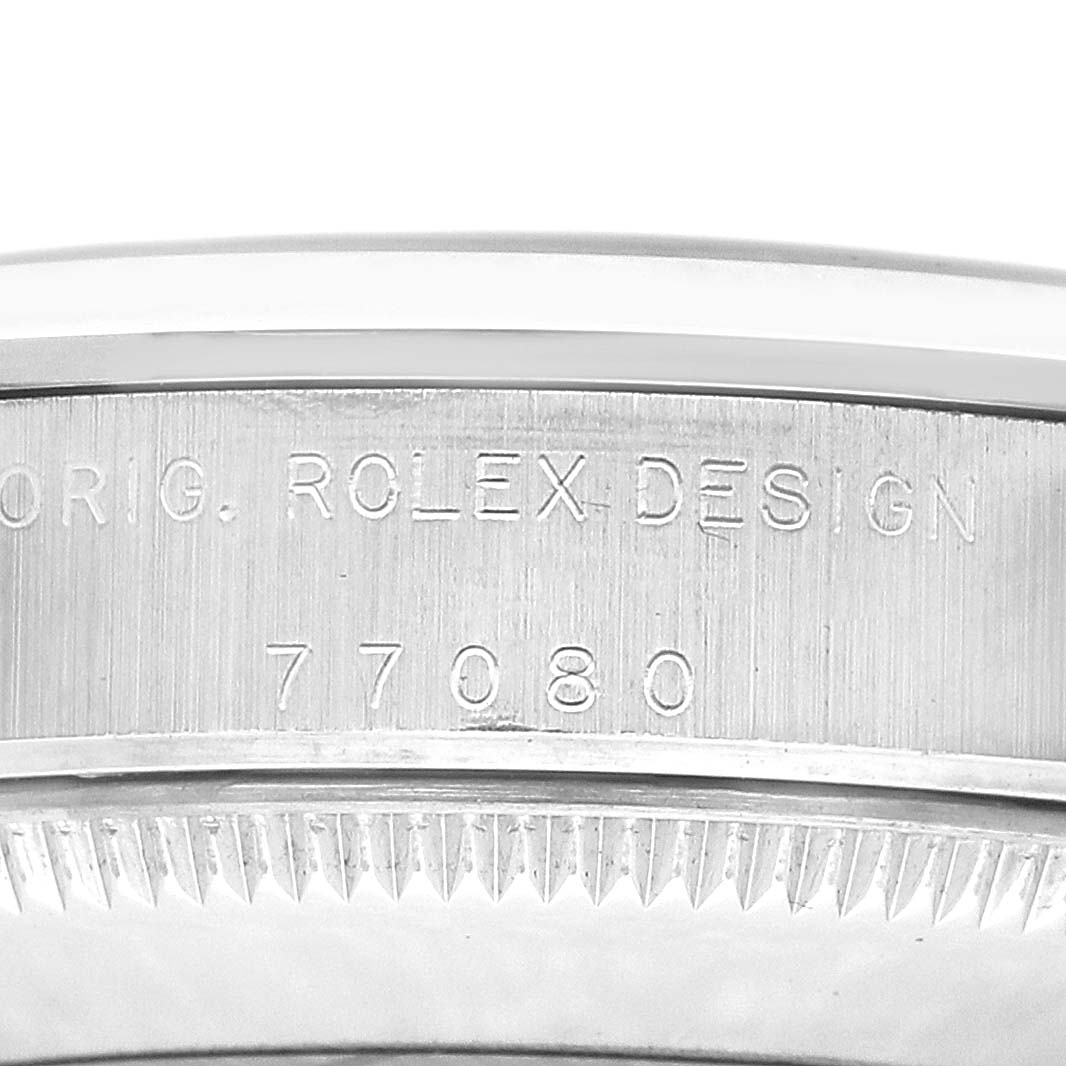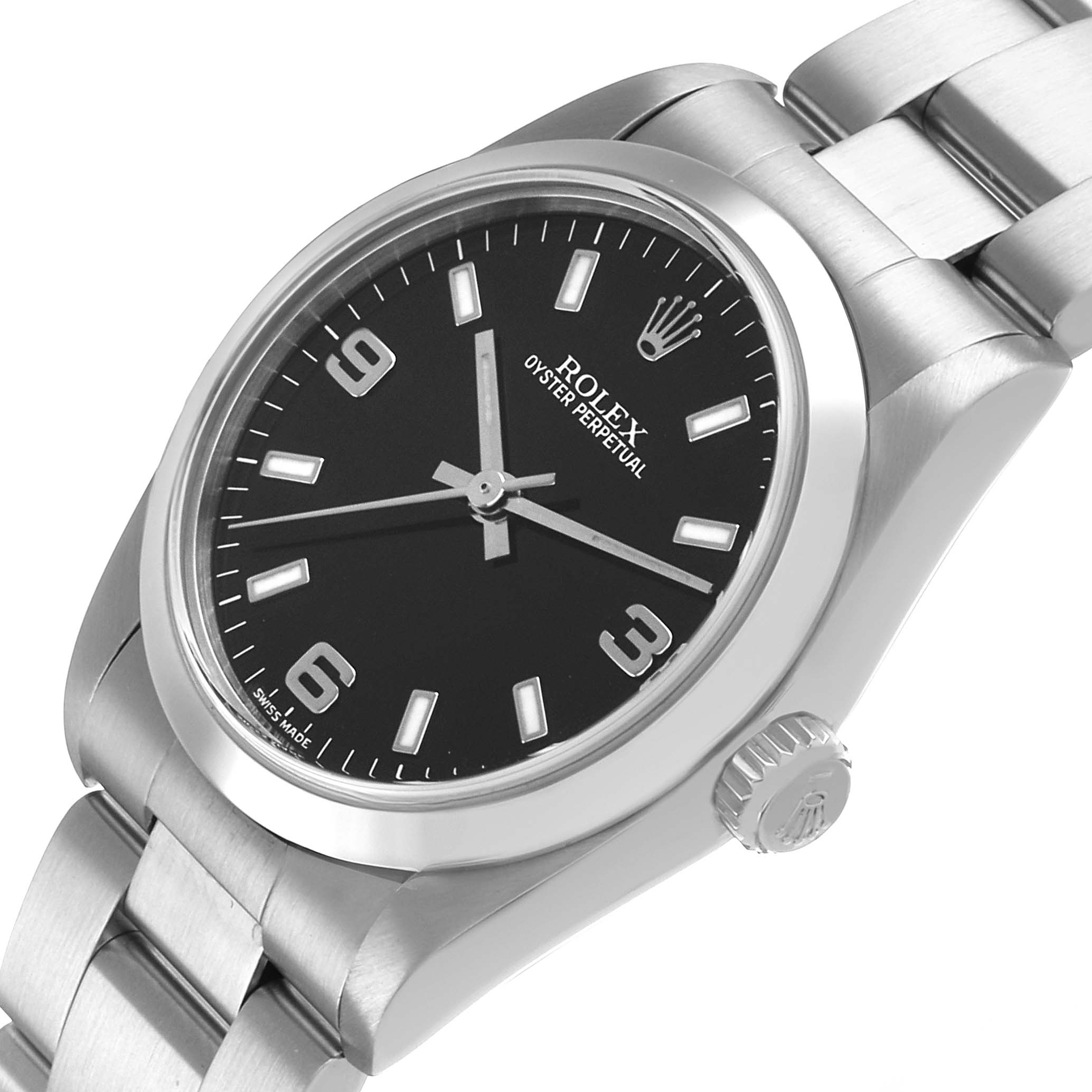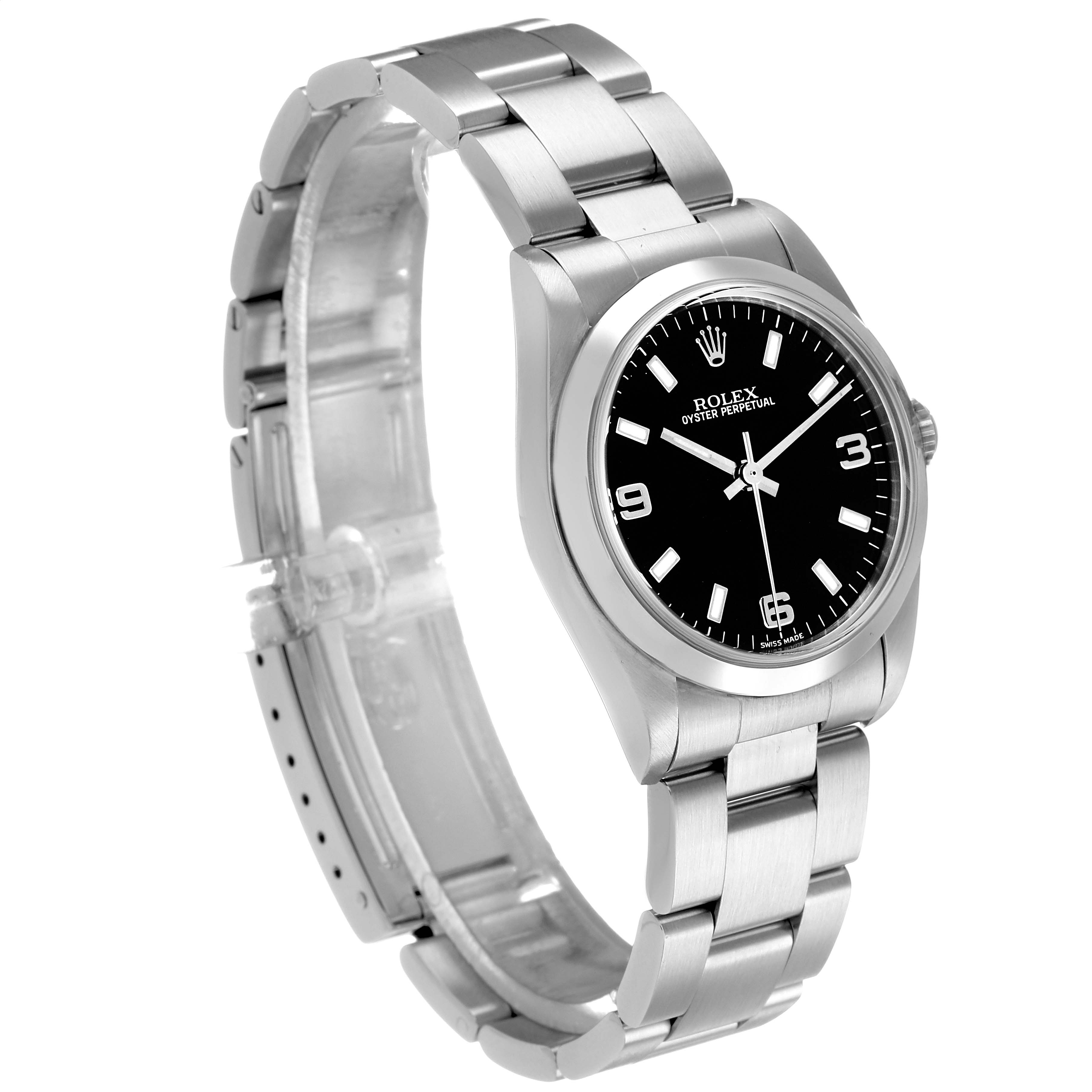 Rolex Oyster Perpetual Midsize 31 Steel Black Dial Ladies Watch 77080. Officially certified chronometer automatic self-winding movement. Stainless steel oyster case 31.0 mm in diameter. Rolex logo on the crown. Stainless steel smooth bezel. Scratch resistant sapphire crystal. Black dial with luminescent baton hands and hour markers. Raised Arabic numerals at 3, 6, and 9 o'clock. Stainless steel oyster bracelet with a fold-over clasp. Fits a 7 1/4" wrist.