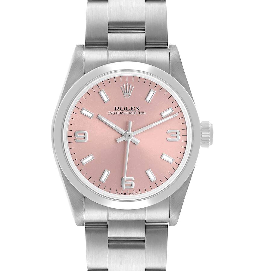 Rolex Oyster Perpetual Midsize 31 Steel Salmon Dial Ladies Watch 67480. Automatic self-winding movement. Stainless steel oyster case 31.0 mm in diameter. Rolex logo on the crown. Stainless steel smooth bezel. Scratch resistant sapphire crystal. Salmon dial with luminous baton hour markers and Arabic numerals at 3, 6, and 9. Luminescent-inlayed baton hands. Outer stick minute markers. Stainless steel oyster bracelet with a fold over clasp. Fits a 7 1/4" wrist.