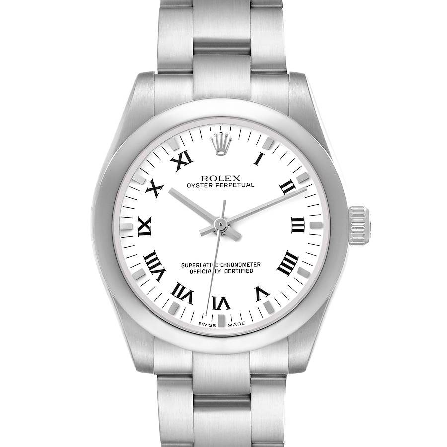 Rolex Oyster Perpetual Midsize 31 Steel White Dial Ladies Watch 177200 Card. Officially certified chronometer automatic self-winding movement. Stainless steel oyster case 31.0 mm in diameter. Rolex logo on the crown. Stainless steel smooth domed bezel. Scratch resistant sapphire crystal. White dial with Roman numeral hour markers and baton hands. Stainless steel oyster bracelet with an Oysterlock clasp. Fits a 7" wrist.
