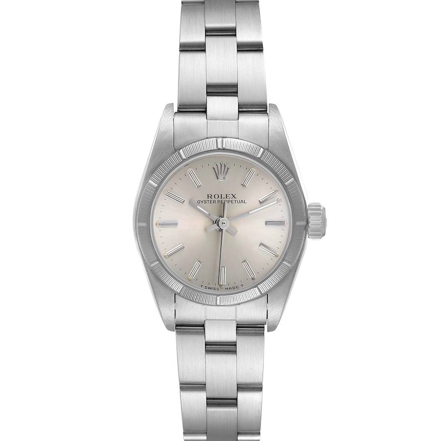 Rolex Oyster Perpetual Silver Dial Steel Ladies Watch 67230. Officially certified chronometer automatic self-winding movement. Stainless steel oyster case 24.0 mm in diameter. Rolex logo on a crown. Stainless steel engine turned bezel. Scratch resistant sapphire crystal. Silver dial with baton hour markers. Stainless steel oyster bracelet with a fold over clasp. Fits 6.5" wrist.