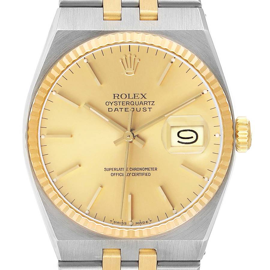 Rolex Oysterquartz Datejust Champagne Dial Steel Yellow Gold Mens Watch 17013. Quartz movement. Stainless steel oyster case 36.0 mm in diameter. Rolex logo on the 18k yellow gold crown. 18k yellow gold fluted bezel. Scratch resistant sapphire crystal with a cyclops magnifier. Champagne dial with tritium-inlay yellow gold baton hands and hour markers. Date calendar at the 3 o'clock aperture. Stainless steel and 18K yellow gold Oysterquartz integrated bracelet with a fold-over clasp. Fits up to a 7 1/4" wrist.