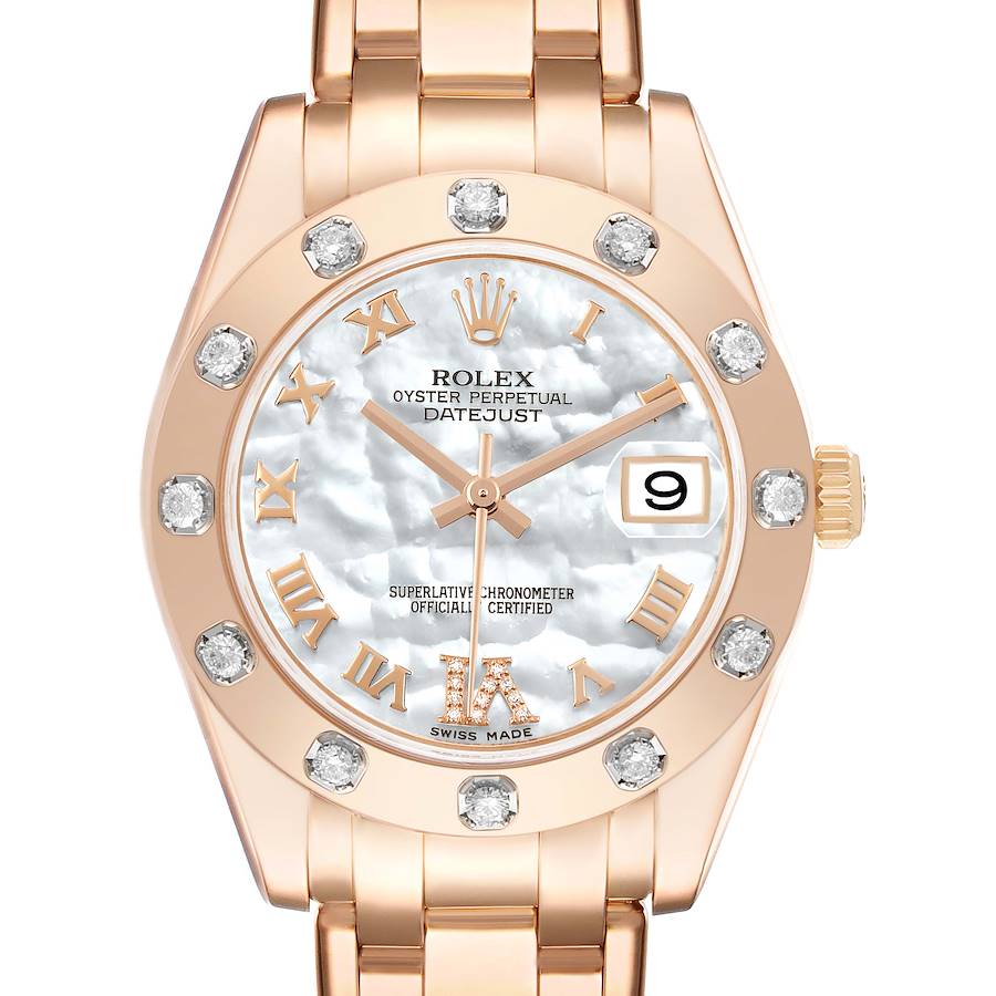 Rolex Pearlmaster MOP Dial Diamond Rose Gold Ladies Watch 81315 Box Card. Officially certified chronometer self-winding movement. 18k rose gold oyster case 34.0 mm in diameter. Rolex logo on the crown. 18k rose gold bezel set with 12 original Rolex factory diamonds. Scratch resistant sapphire crystal with cyclops magnifier. Mother of pearl dial with Roman numerals and baton hands. Original Rolex factory diamond-encrusted Roman numeral at VI. Date window at 3 o'clock. 18k rose gold Pearlmaster bracelet with hidden clasp. Fits 6 1/4" wrist.