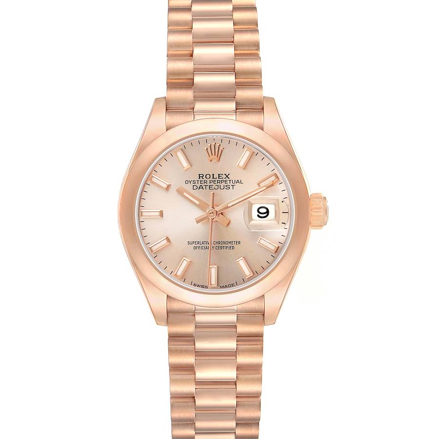 Rolex President 28 Rose Gold Pink Dial Ladies Watch 279165. Officially certified chronometer self-winding movement. 18k rose gold oyster case 28.0 mm in diameter. Rolex logo on a crown. 18k rose gold smooth domed bezel. Scratch resistant sapphire crystal with Cyclops magnifier. Pink dial with raised luminous baton hour markers. Date calendar at 3 o'clock aperture. 18k rose gold presidentual bracelet with hidden clasp. Fits 6.5" wrist.