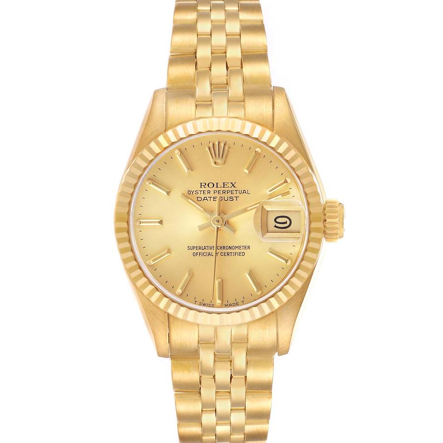 Rolex President Datejust 26 Champagne Dial Yellow Gold Ladies Watch 69178. Officially certified chronometer self-winding movement. 18k yellow gold oyster case 26.0 mm in diameter. Rolex logo on a crown. 18k yellow gold fluted bezel. Scratch resistant sapphire crystal with cyclops magnifier. Champagne dial with yellow gold baton hour markers and hands. Date calendar at the 3 o'clock aperture. 18k yellow gold jubilee bracelet with a folder over clasp. Fits 6" wrist.