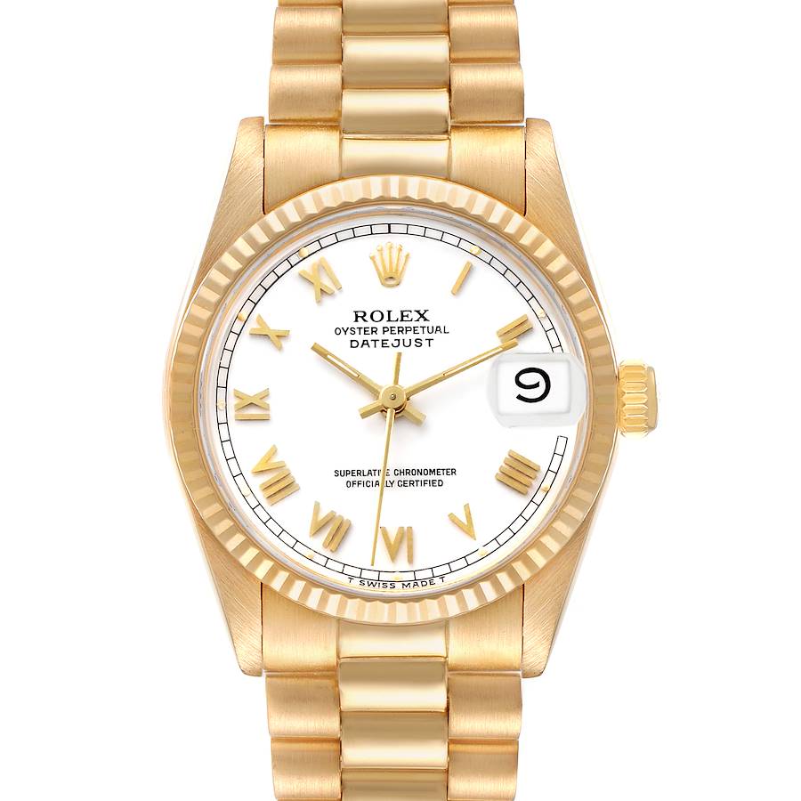 Rolex President Datejust 31 Midsize White Dial Yellow Gold Ladies Watch 68278. Officially certified chronometer self-winding movement. 18k yellow gold oyster case 31.0 mm in diameter. Rolex logo on the crown. 18k yellow gold fluted bezel. Scratch resistant sapphire crystal with a cyclops magnifier. White dial with tritium-inlay yellow gold baton hands and Roman numeral hour markers. An outer minute track. Date calendar at the 3 o'clock aperture. 18k yellow gold president bracelet with a hidden clasp. Fits a 6.5" wrist.