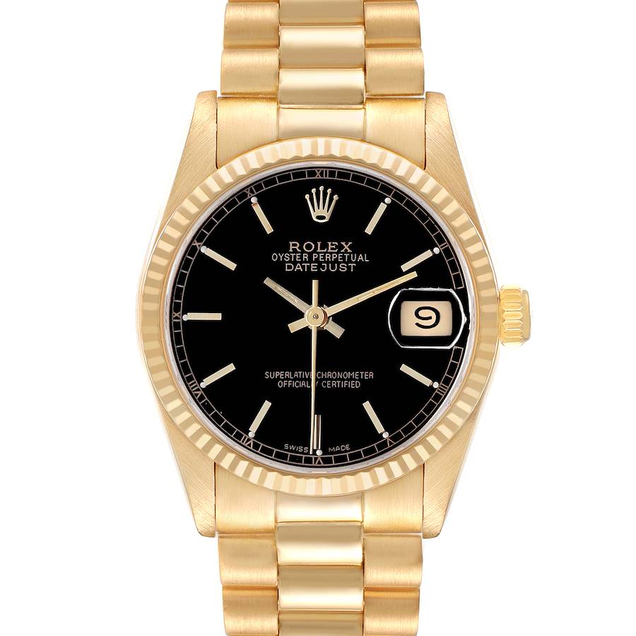 Rolex President Datejust Midsize Black Dial Yellow Gold Ladies Watch 68278. Officially certified chronometer self-winding movement. 18k yellow gold oyster case 31.0 mm in diameter. Rolex logo on the crown. 18k yellow gold fluted bezel. Scratch resistant sapphire crystal with a cyclops magnifier. Black dial with yellow gold baton hands and hour markers. Date calendar at the 3 o'clock aperture. 18k yellow gold president bracelet with a hidden folding clasp. Fits a 6.5" wrist.