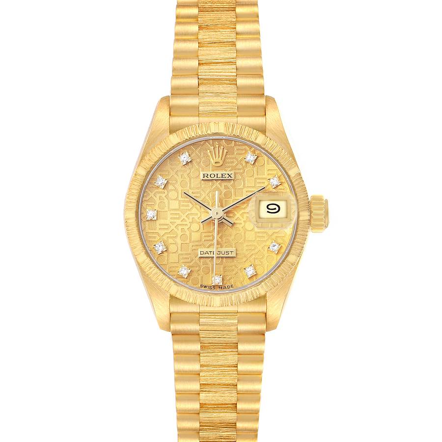 Rolex President Datejust Yellow Gold Bark Finish Diamond Ladies Watch 69278. Officially certified chronometer automatic self-winding movement. 18k yellow gold oyster case 26.0 mm in diameter. Rolex logo on the 18k yellow gold crown. 18k yellow gold engine-turned bezel with bark finish. Scratch resistant sapphire crystal with a cyclops magnifier. Champagne jubilee anniversary dial with tritium-inlay yellow gold baton hands and original Rolex factory diamond hour markers. Date calendar at the 3 o'clock aperture. 18k yellow gold bark-finish President bracelet with a hidden clasp. Fits a 6" wrist.