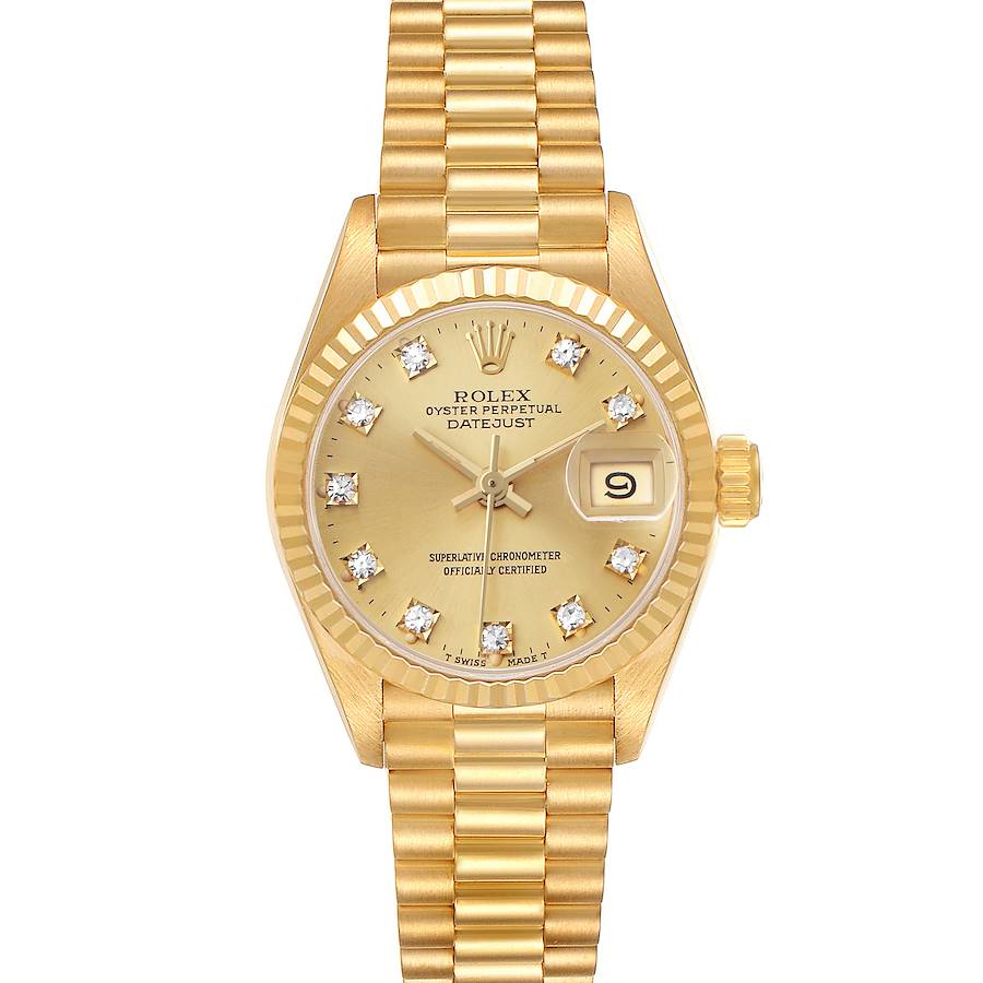 Rolex President Datejust Yellow Gold Diamond Dial Ladies Watch 69178. Officially certified chronometer automatic self-winding movement. 18k yellow gold oyster case 26.0 mm in diameter. Rolex logo on the 18k yellow gold crown. 18k yellow gold fluted bezel. Scratch resistant sapphire crystal with a cyclops magnifier. Champagne dial with original Rolex factory diamond hour markers and yellow gold baton hands. Date calendar at the 3 o'clock aperture. 18k yellow gold president bracelet with a hidden clasp. Fits a 6" wrist.