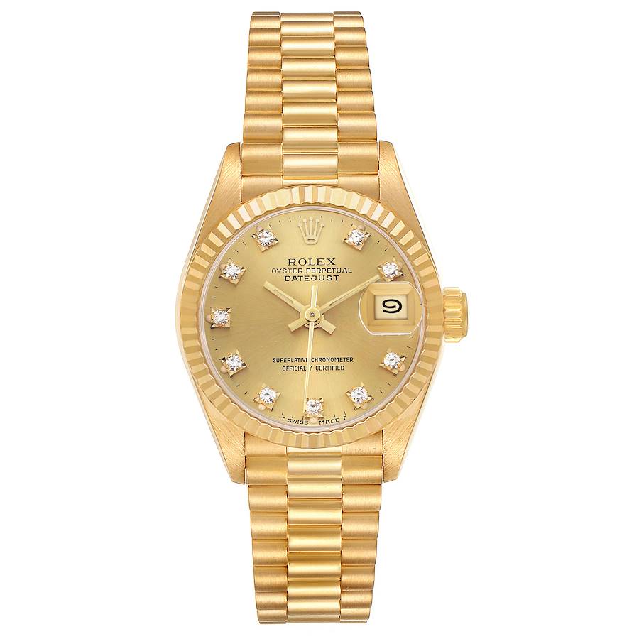 Rolex President Datejust Yellow Gold Diamond Dial Ladies Watch 69178. Officially certified chronometer automatic self-winding movement. 18k yellow gold oyster case 26.0 mm in diameter. Rolex logo on the 18k yellow gold crown. 18k yellow gold fluted bezel. Scratch resistant sapphire crystal with a cyclops magnifier. Champagne dial with original Rolex factory diamond hour markers and yellow gold baton hands. Date calendar at the 3 o'clock aperture. 18k yellow gold president bracelet with a hidden clasp. Fits a 6 1/4" wrist.