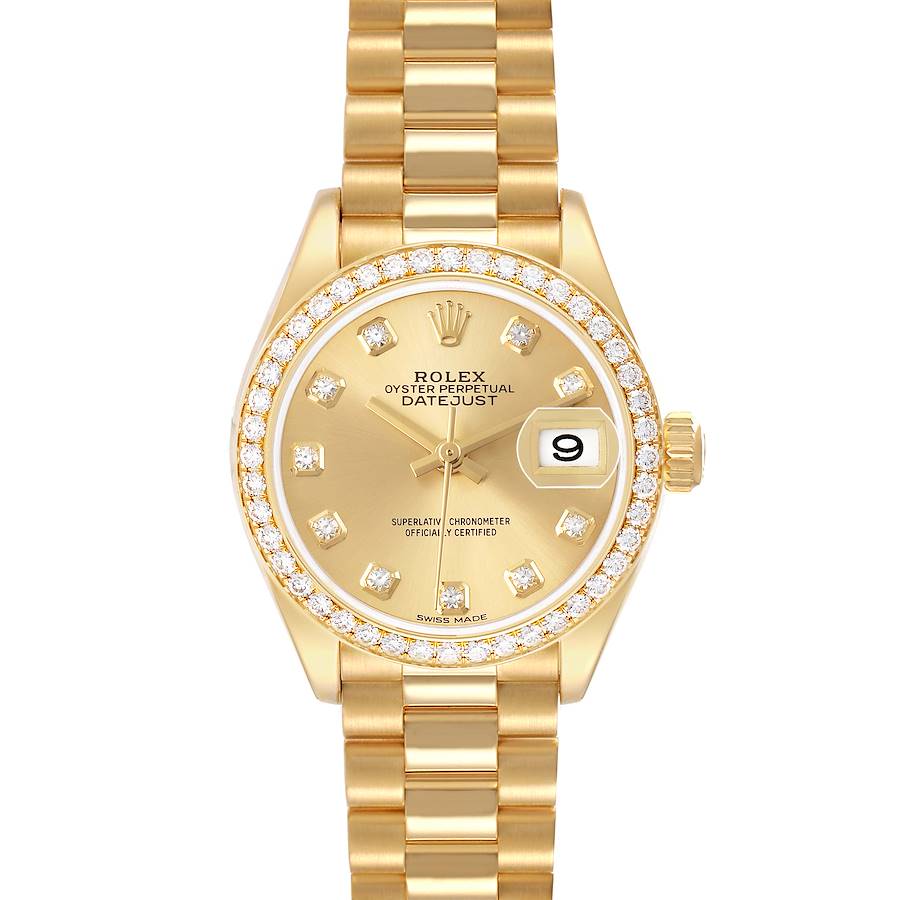 Rolex President Datejust Yellow Gold Diamond Ladies Watch 279138. Officially certified chronometer self-winding movement with quickset date function. 18k yellow gold oyster case 28.0 mm in diameter. Rolex logo on the yellow gold crown. 18k yellow gold bezel set with original Rolex factory diamonds. Scratch resistant sapphire crystal with cyclops magnifier. Champagne dial with original Rolex factory diamond hour markers. Date window at 3 o'clock. 18k yellow gold president bracelet with a hidden clasp. Fits a 6 3/4" wrist.
