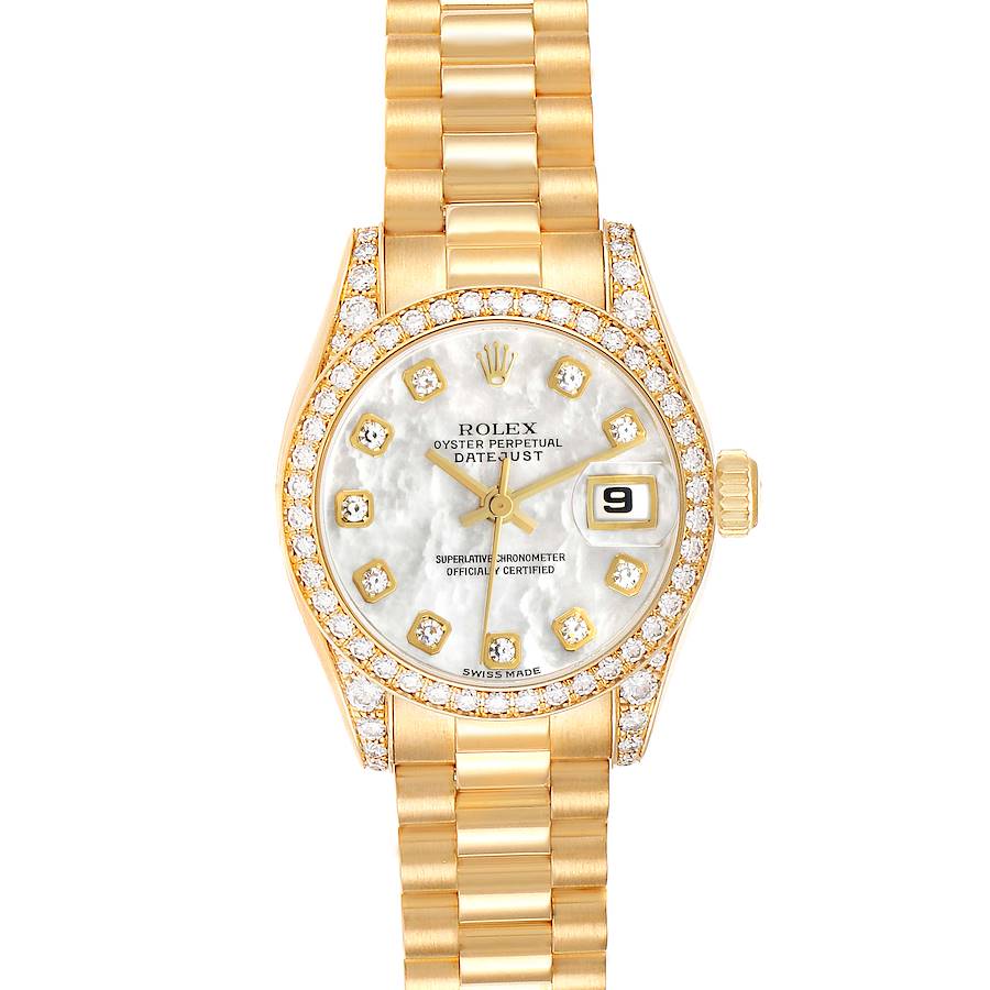 Rolex President Datejust Yellow Gold MOP Diamond Ladies Watch 179158. Officially certified chronometer automatic self-winding movement. 18k yellow gold oyster case 26.0 mm in diameter. Rolex logo on the crown. Original Rolex factory diamond lugs. 18k yellow gold original Rolex factory diamond bezel. Scratch resistant sapphire crystal with a cyclops magnifier. Mother of pearl dial with original Rolex factory diamond hour markers and yellow gold baton hands. Date calendar at the 3 o'clock aperture. 18k yellow gold president bracelet with a hidden folding clasp. Fits up to a 6.5" wrist.