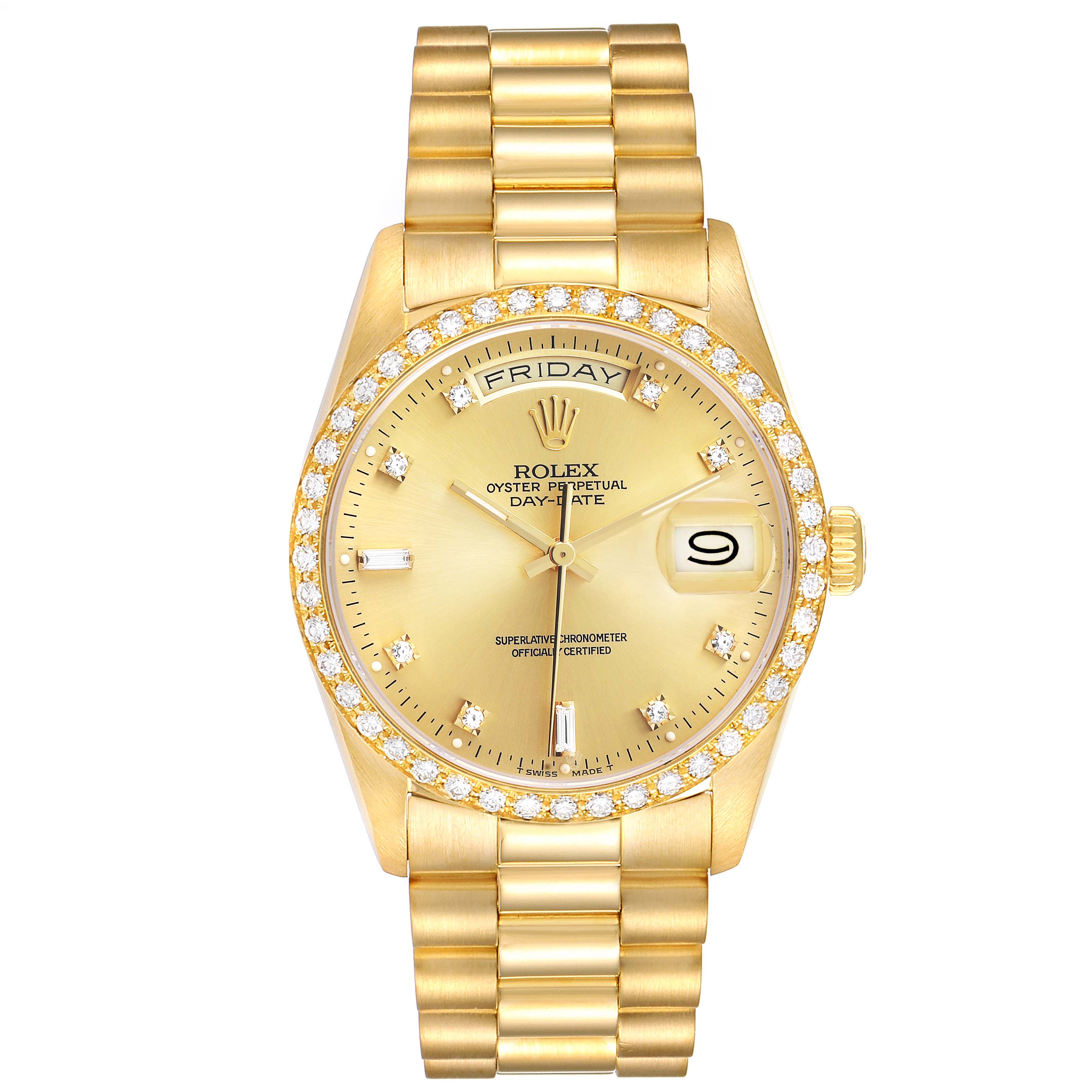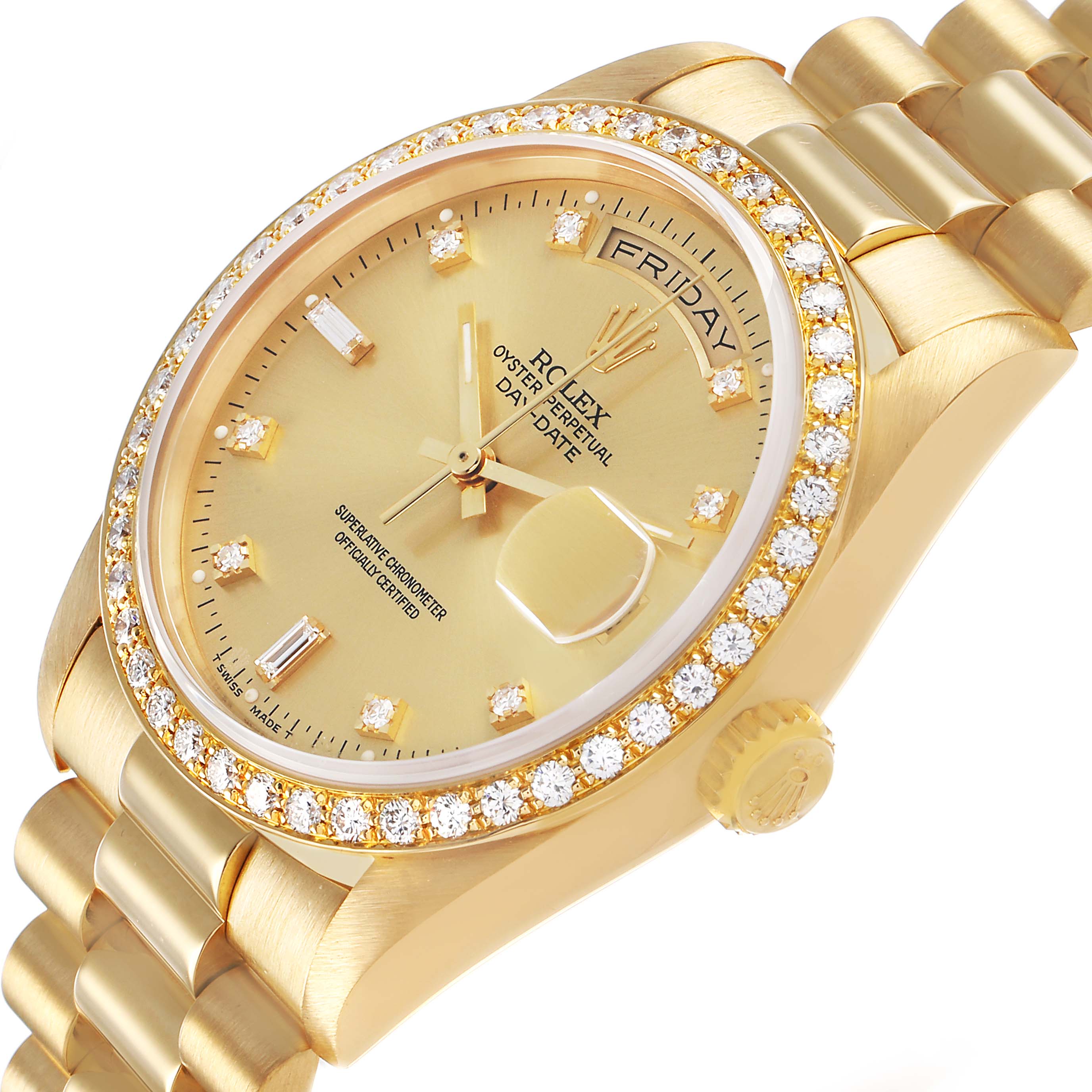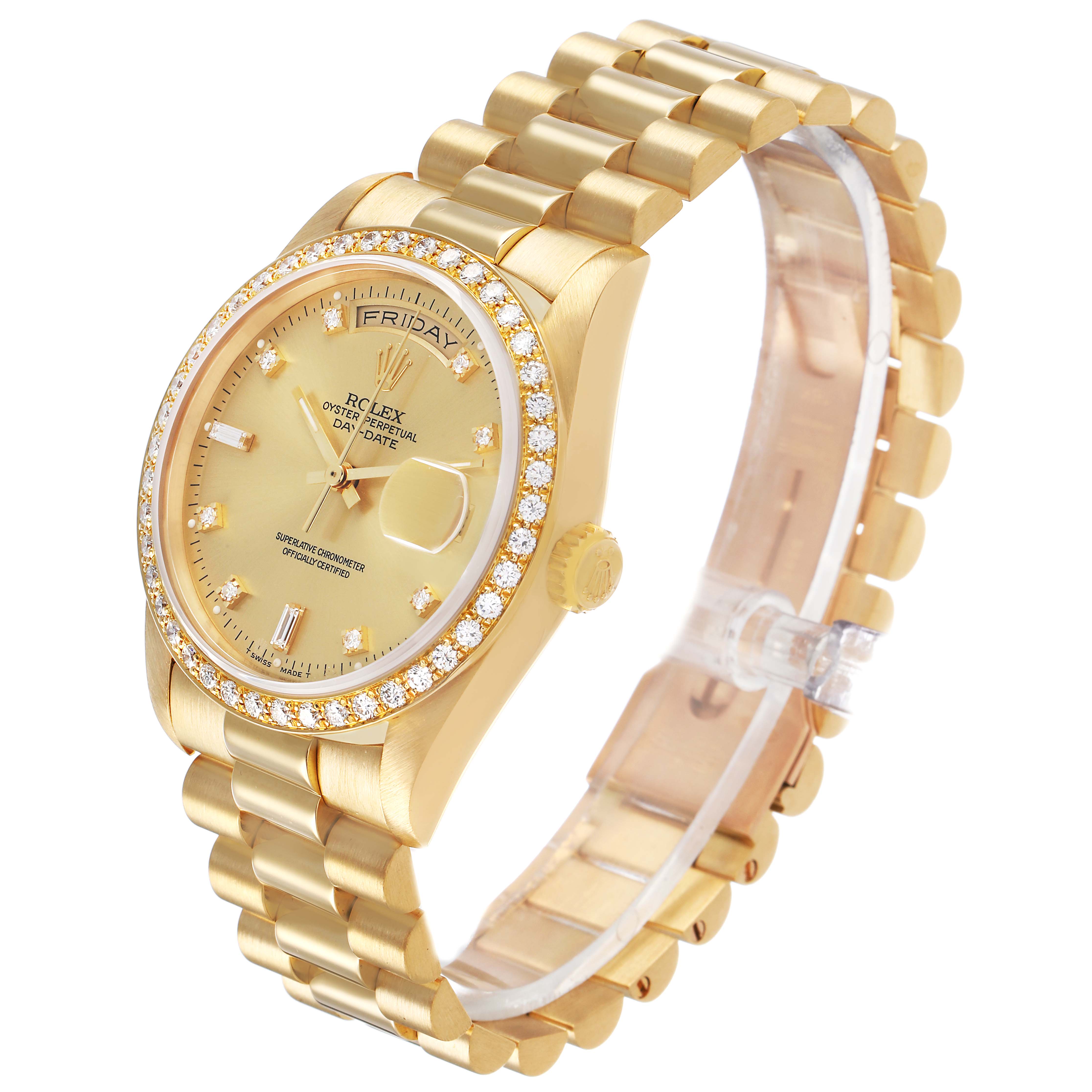 Rolex President Day-Date 36 Yellow Gold Champagne Diamond Mens Watch 18348. Officially certified chronometer automatic self-winding movement. 18k yellow gold oyster case 36.0 mm in diameter. Rolex logo on the crown. 18k yellow gold original Rolex factory diamond bezel. Scratch resistant sapphire crystal with a cyclops magnifier. Champagne dial with original Rolex factory diamond hour markers and tritium-inlay yellow gold baton hands. Date calendar at the 3 o'clock aperture. Weekday window at 12 o'clock. 18k yellow gold president bracelet with a hidden clasp. Fits a 7 1/2" wrist.