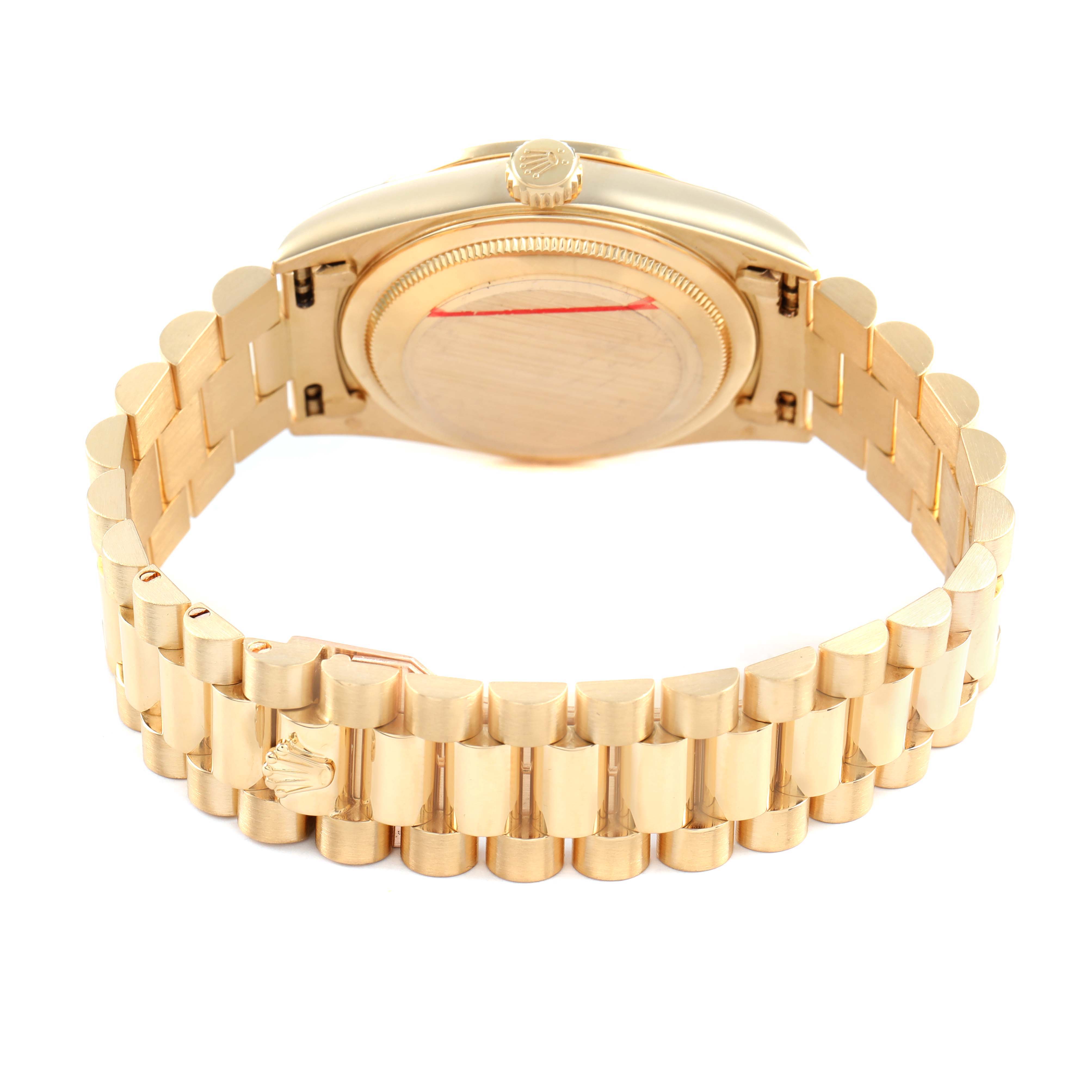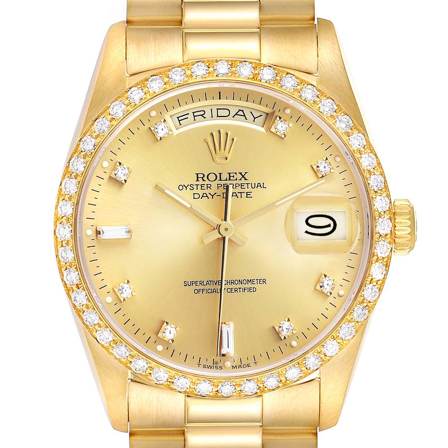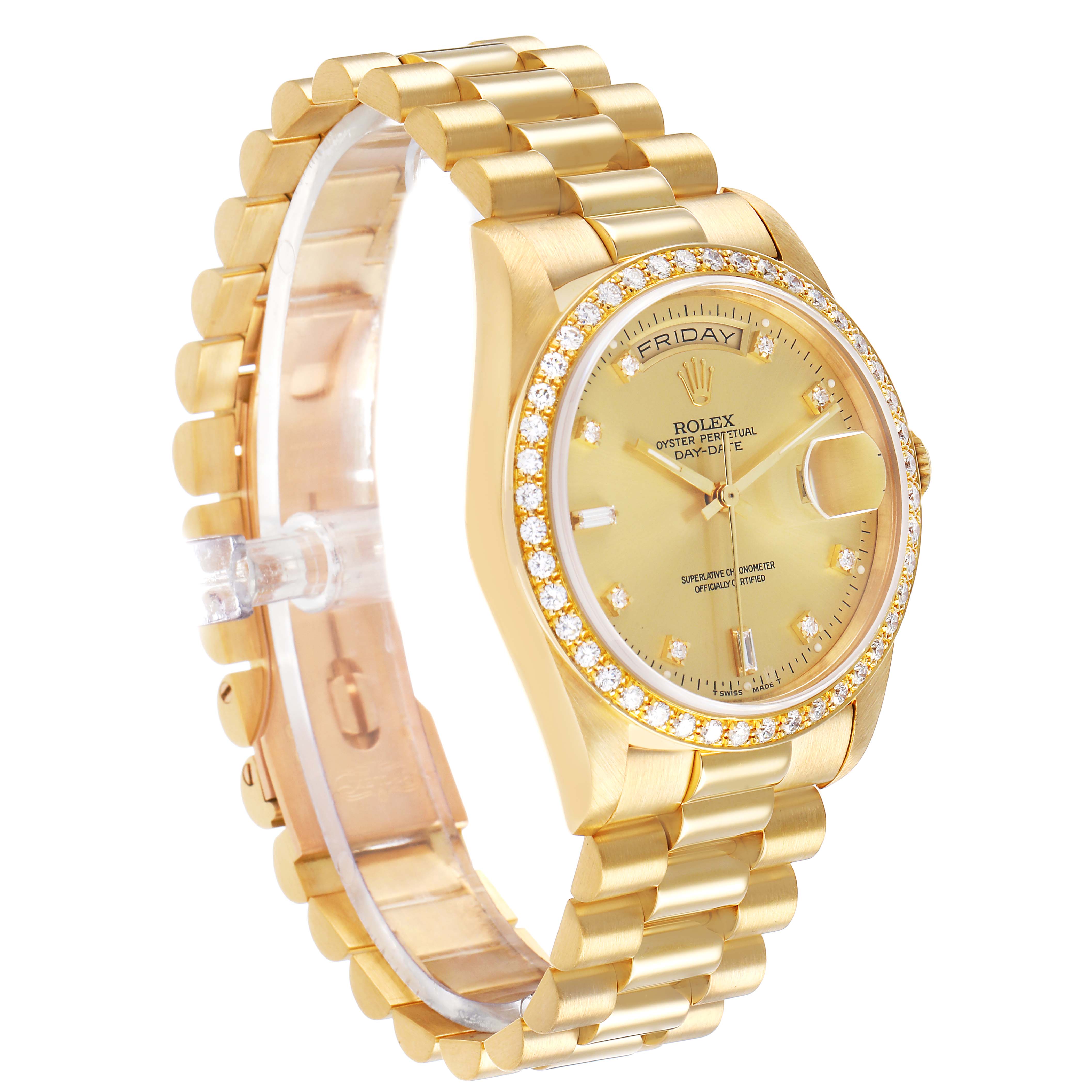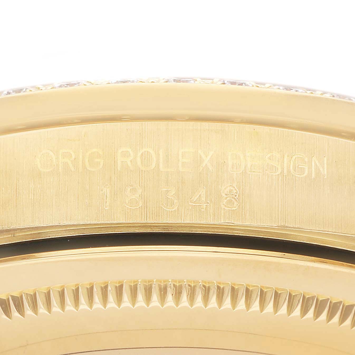 Rolex President Day-Date 36 Yellow Gold Champagne Diamond Mens Watch 18348. Officially certified chronometer automatic self-winding movement. 18k yellow gold oyster case 36.0 mm in diameter. Rolex logo on the crown. 18k yellow gold original Rolex factory diamond bezel. Scratch resistant sapphire crystal with a cyclops magnifier. Champagne dial with original Rolex factory diamond hour markers and tritium-inlay yellow gold baton hands. Date calendar at the 3 o'clock aperture. Weekday window at 12 o'clock. 18k yellow gold president bracelet with a hidden clasp. Fits a 7 1/2" wrist.