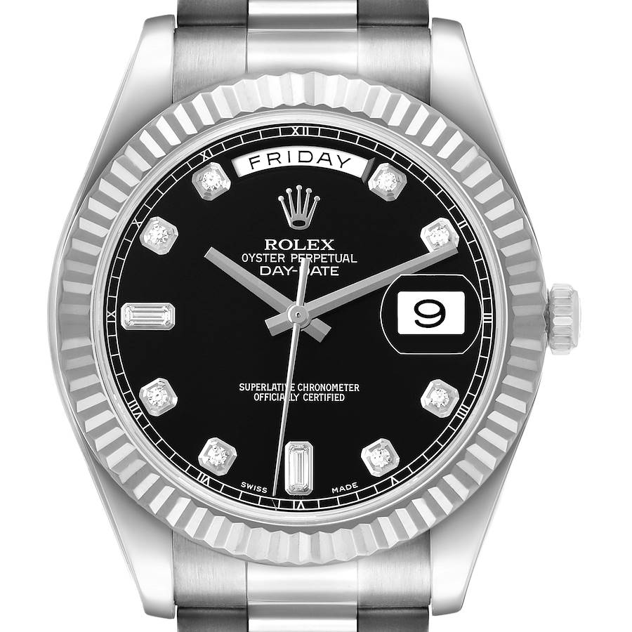 Rolex President Day-Date II White Gold Diamond Dial Mens Watch 218239. Officially certified chronometer self-winding movement. 18k white gold oyster case 41.0 mm in diameter. Rolex logo on the crown. 18k white gold fluted bezel. Scratch resistant sapphire crystal with a cyclops magnifier. Black dial with original rolex factory diamond hour markers and white gold baton hands. Sweep centre seconds. Outer minute track. Aperture for the weekday 12 o'clock. Date calendar at the 3 o'clock aperture. 18k white gold president bracelet with a hidden clasp. Fits up to a 7 3/4" wrist.