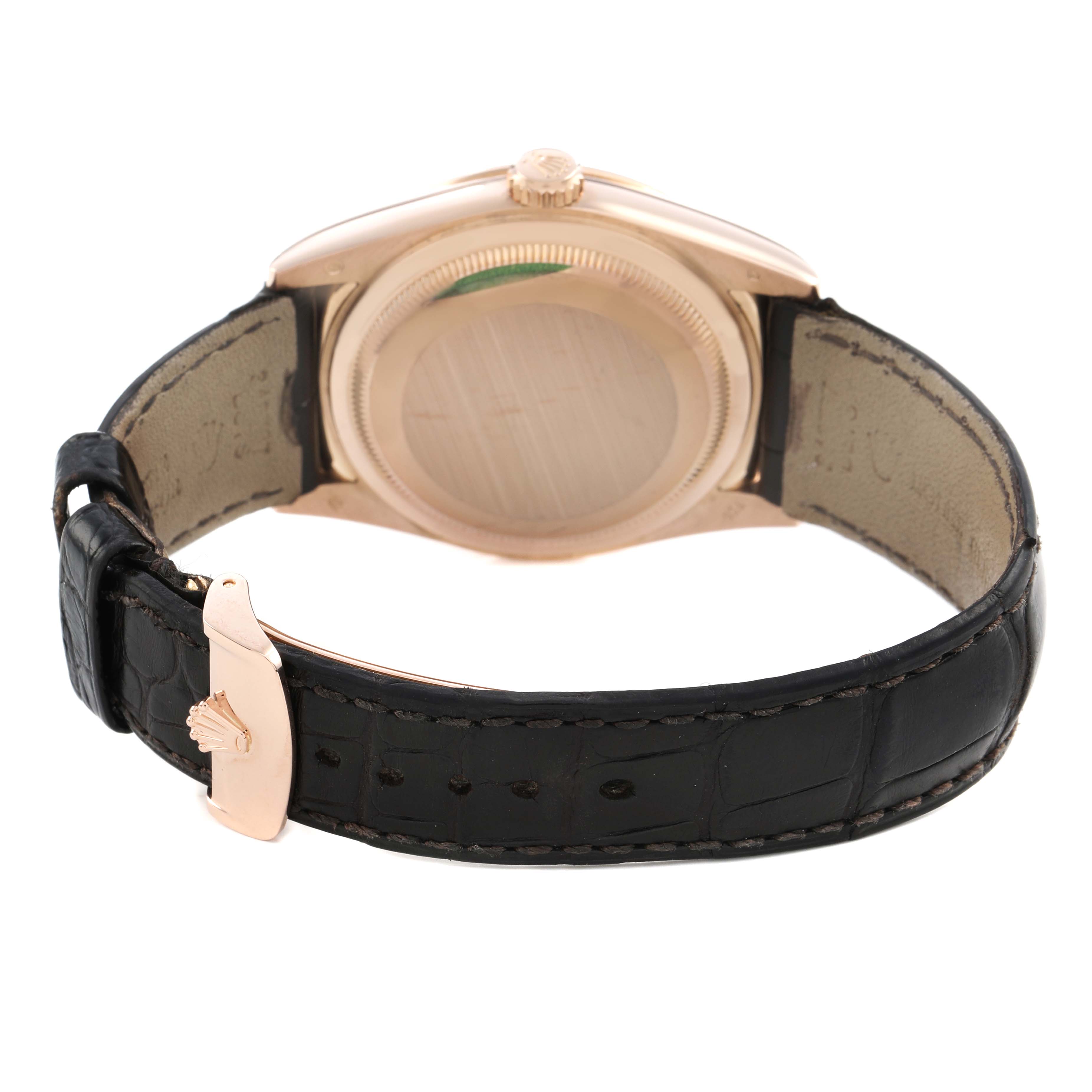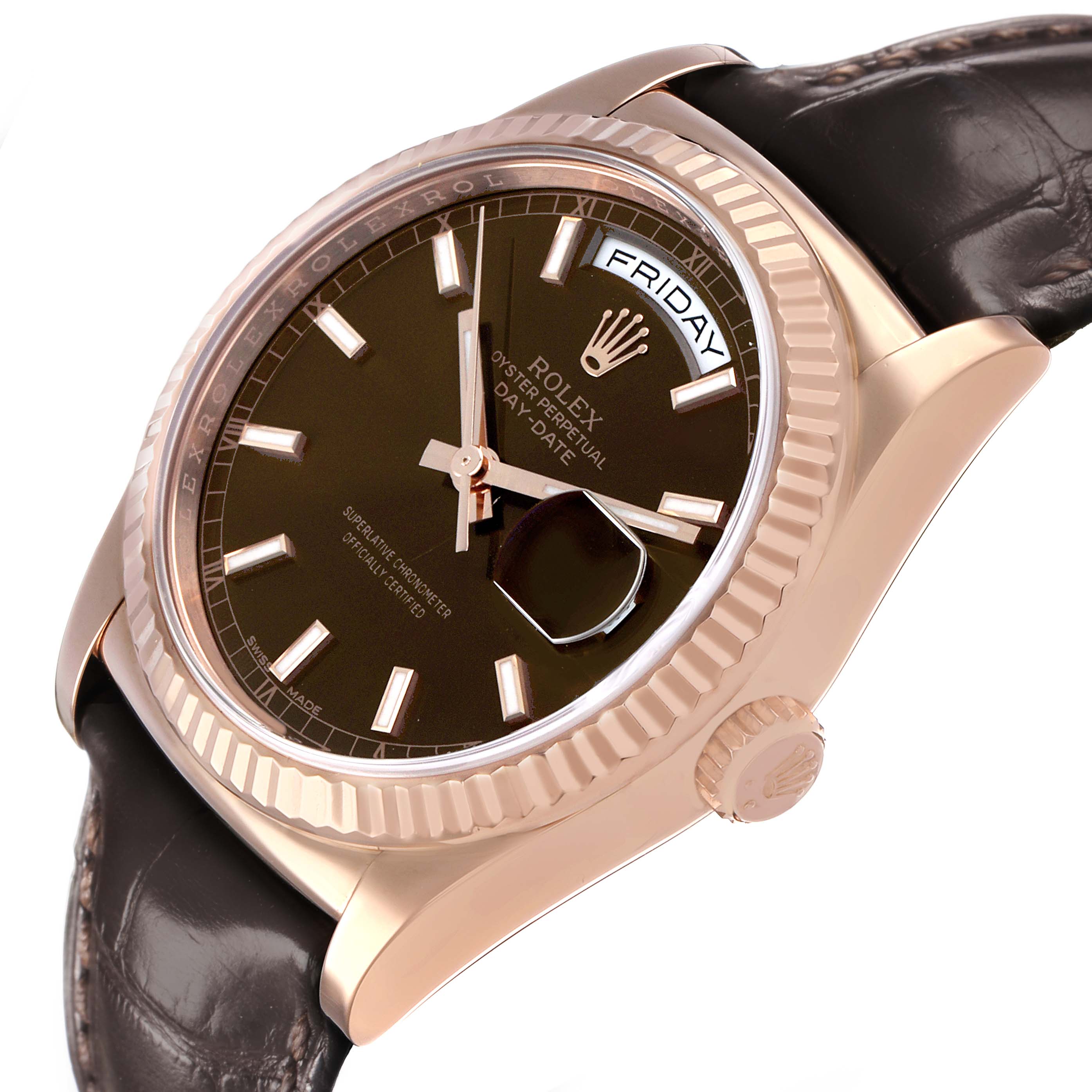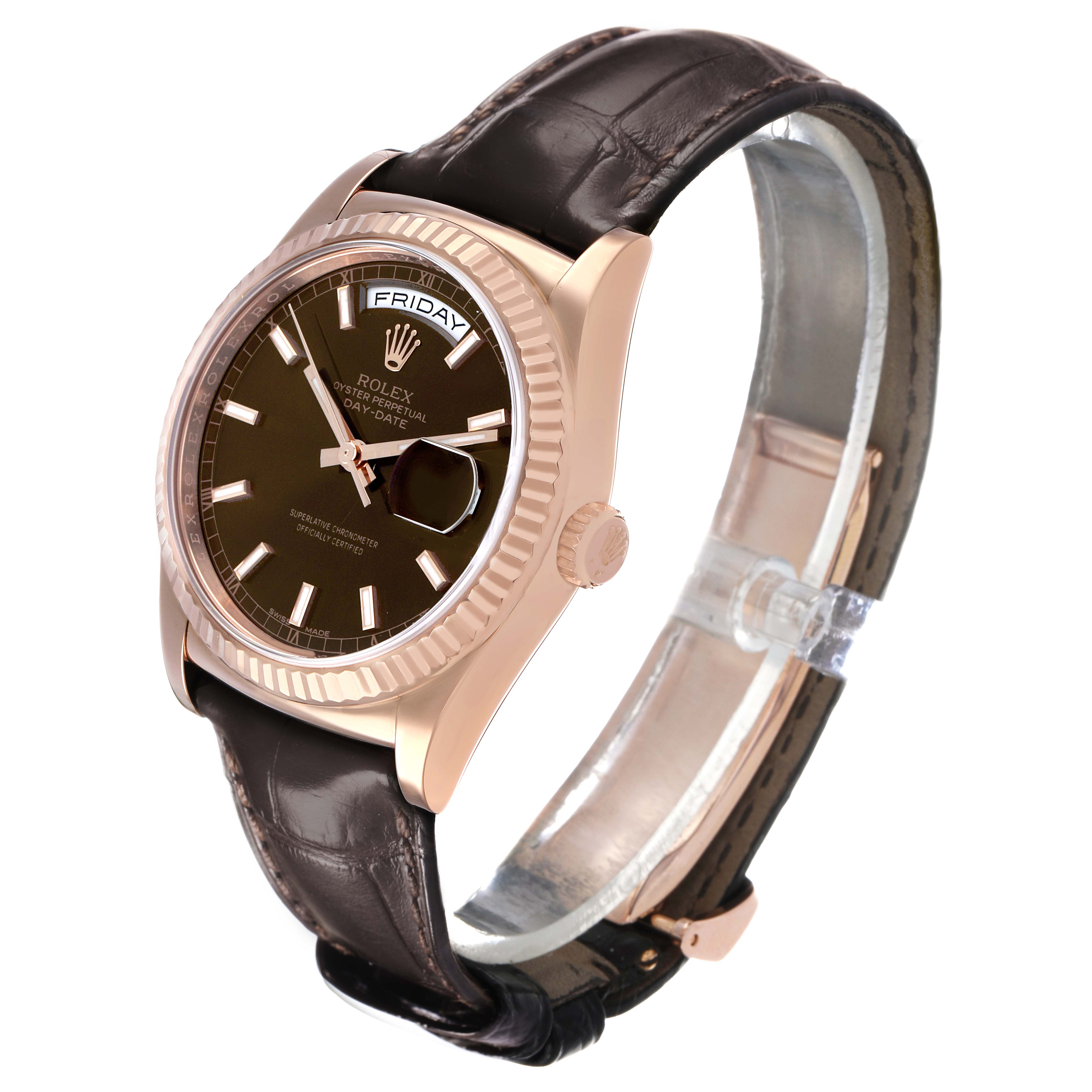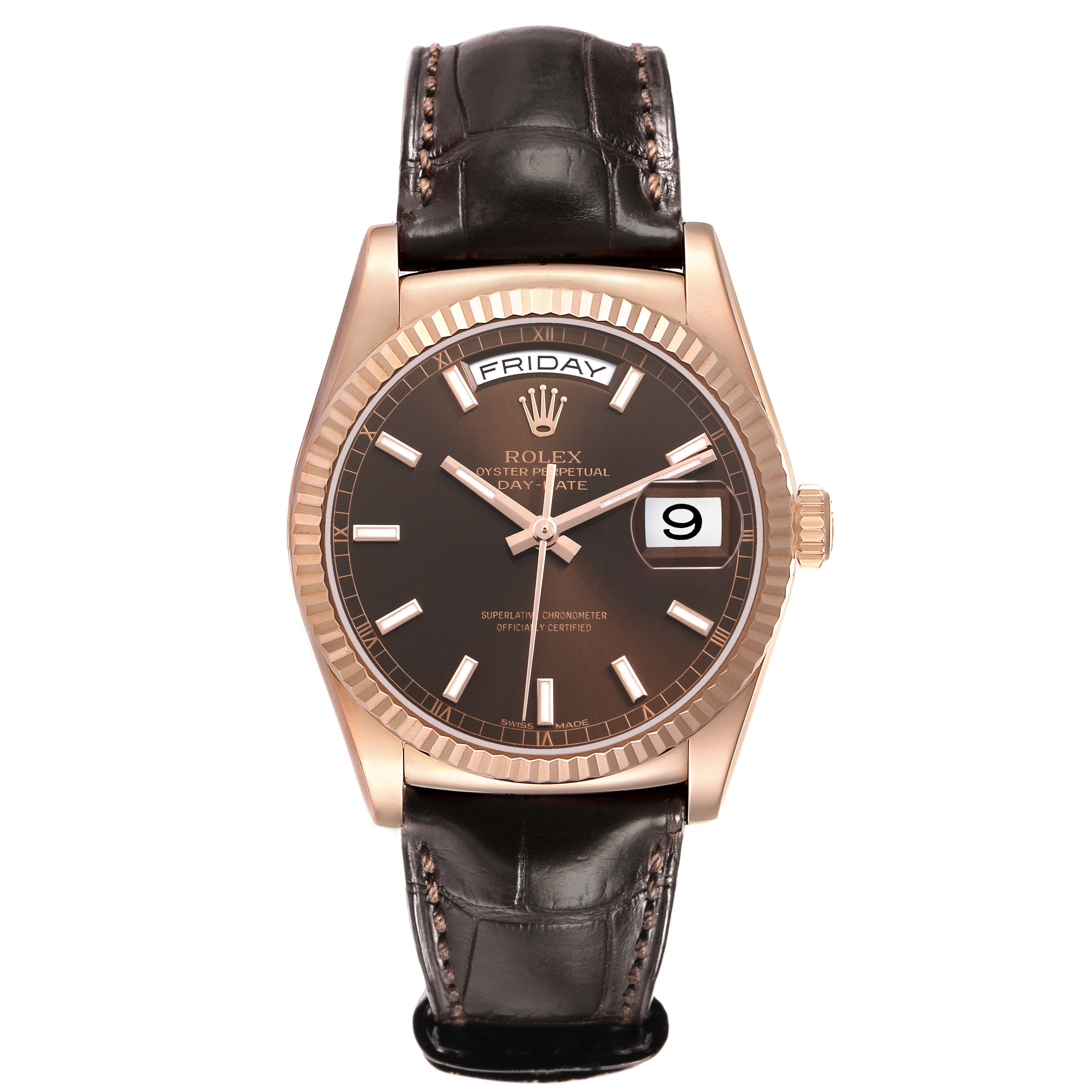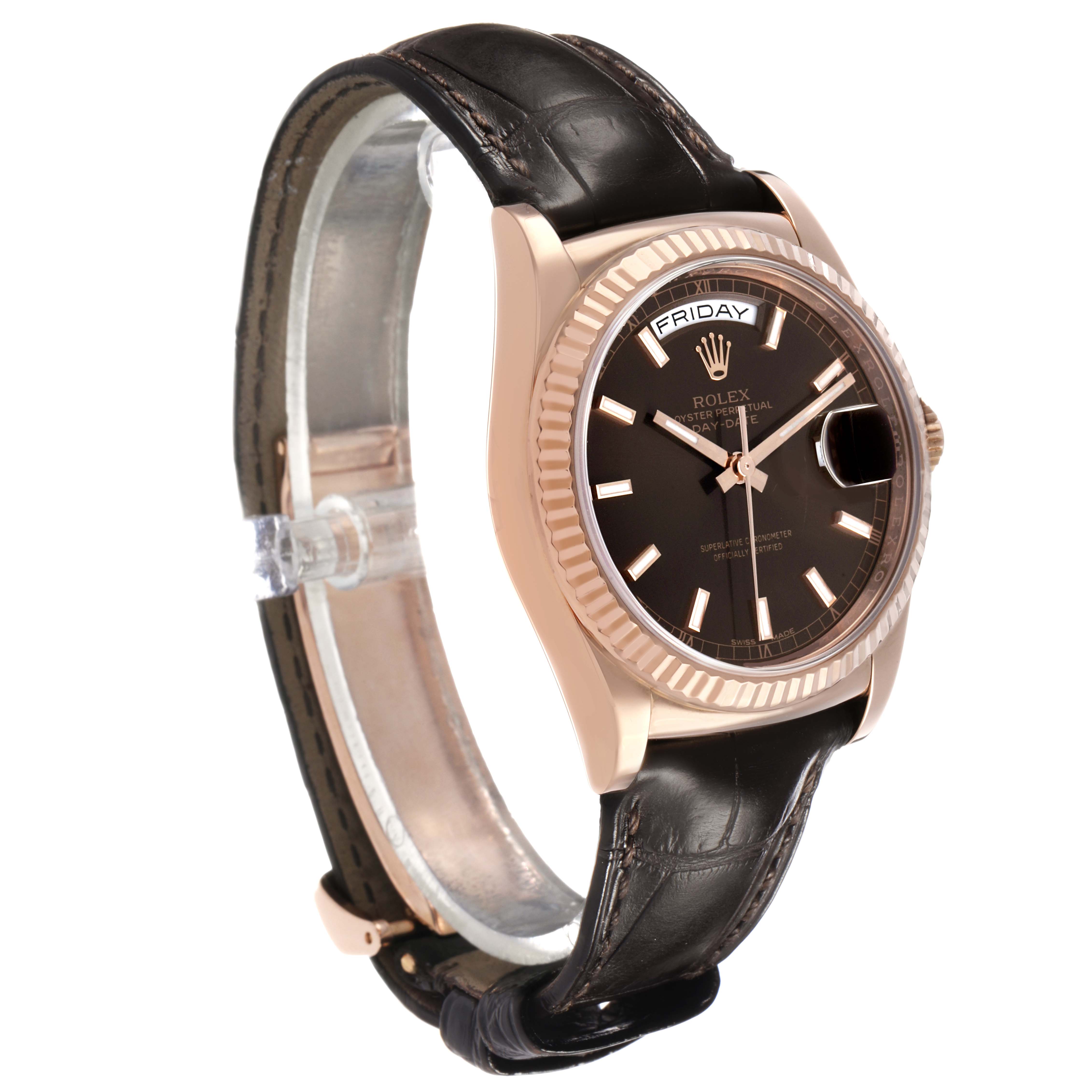 Rolex President Day-Date Rose Gold Chocolate Dial Mens Watch 118135. Officially certified chronometer automatic self-winding movement. 18k rose gold oyster case 36.0 mm in diameter. Rolex logo on the crown. 18k rose gold fluted bezel. Scratch resistant sapphire crystal with a cyclops magnifier. Chocolate dial with luminescent rose gold baton hour markers and hands. Sweep center seconds. An outer minute track. Aperture for the weekday at 12 o'clock. Aperture for the date at 3 o'clock. Brown alligator leather strap with an 18k rose gold deployant buckle.