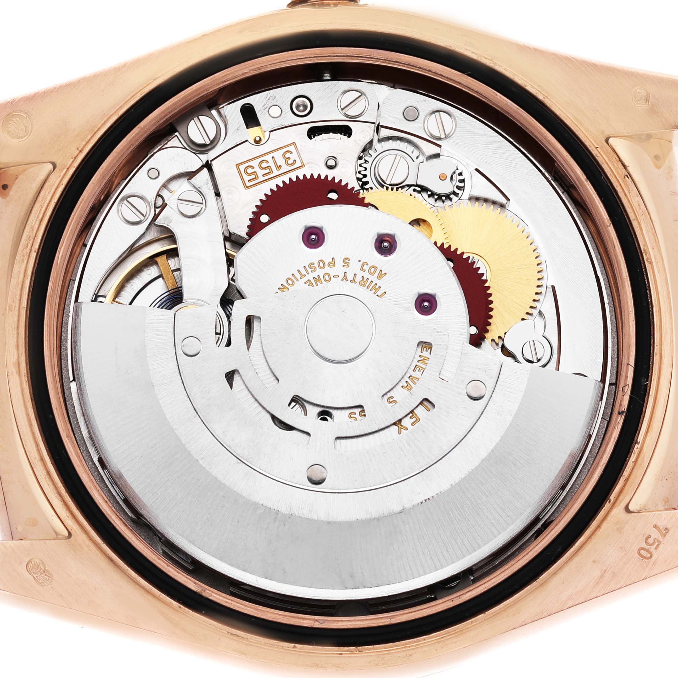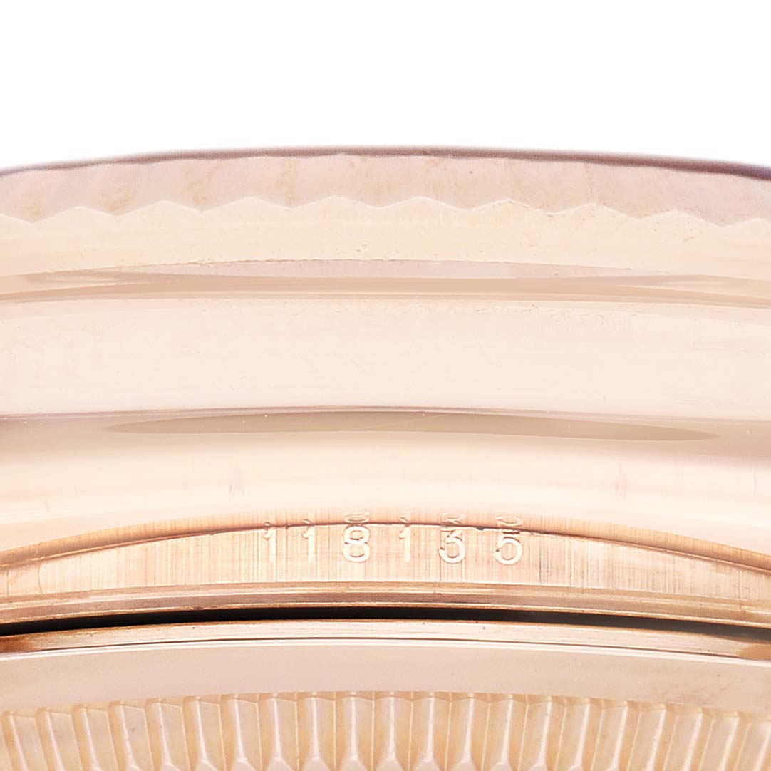 | Case: | 18k rose gold oyster case 36.0 mm in diameter. Rolex logo on the crown. |