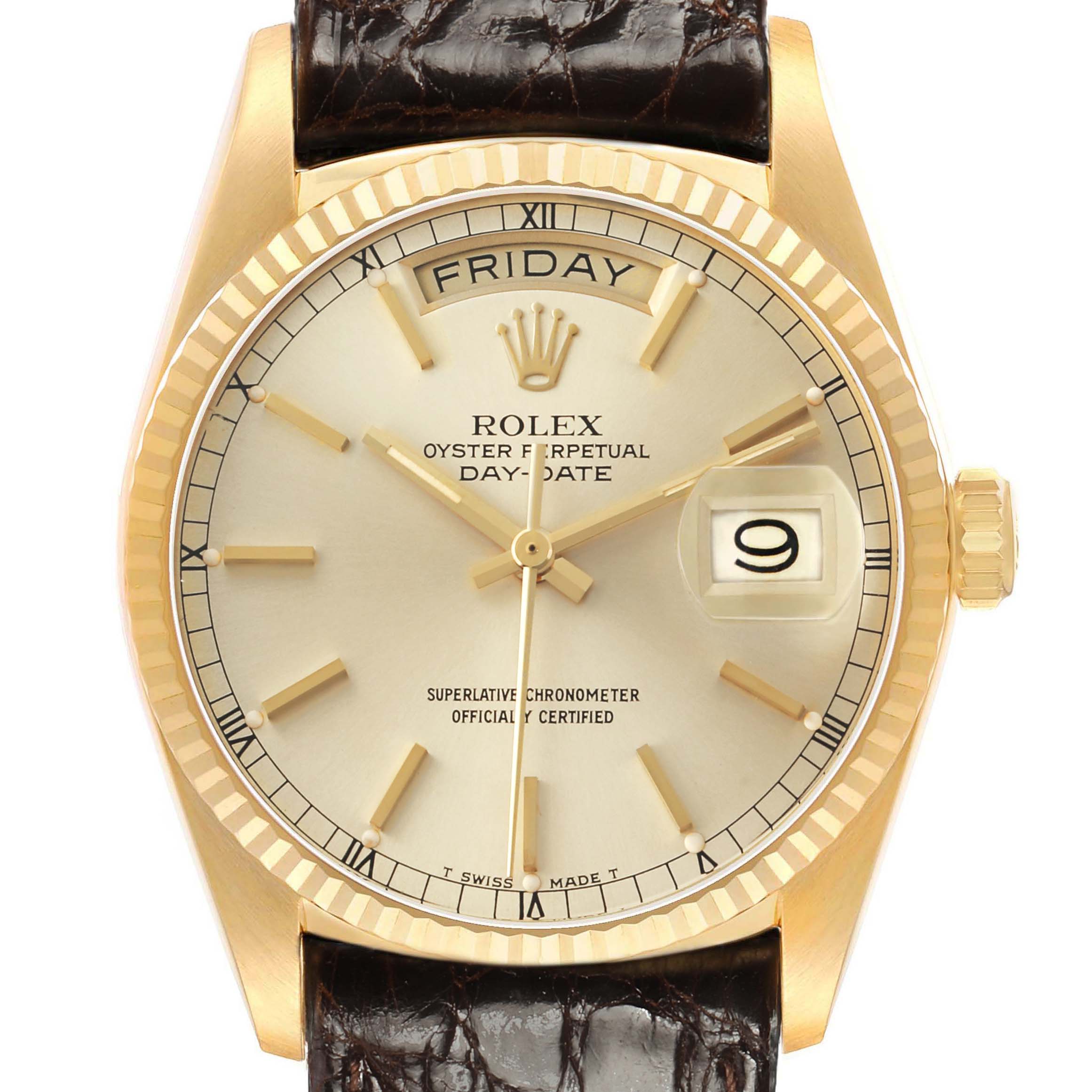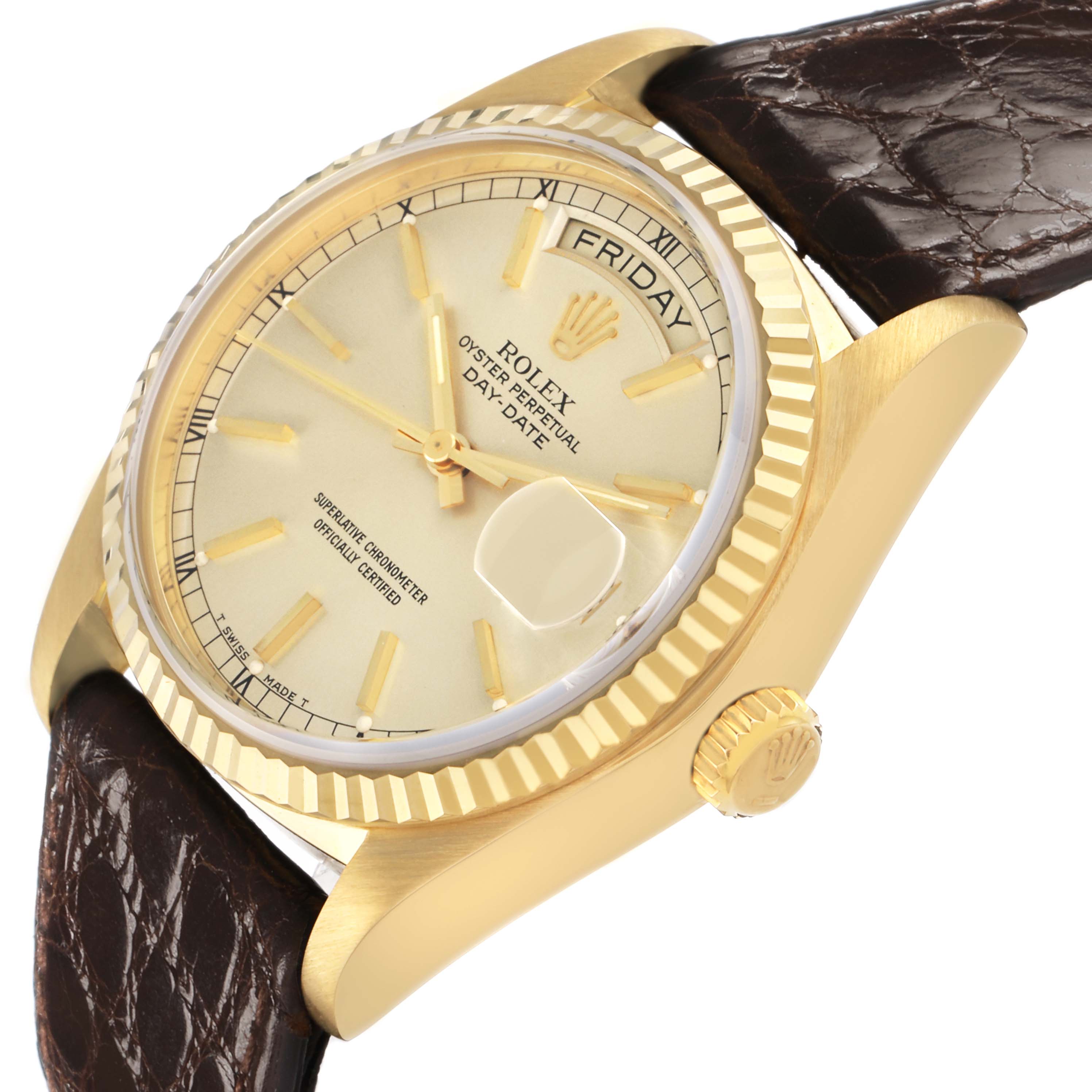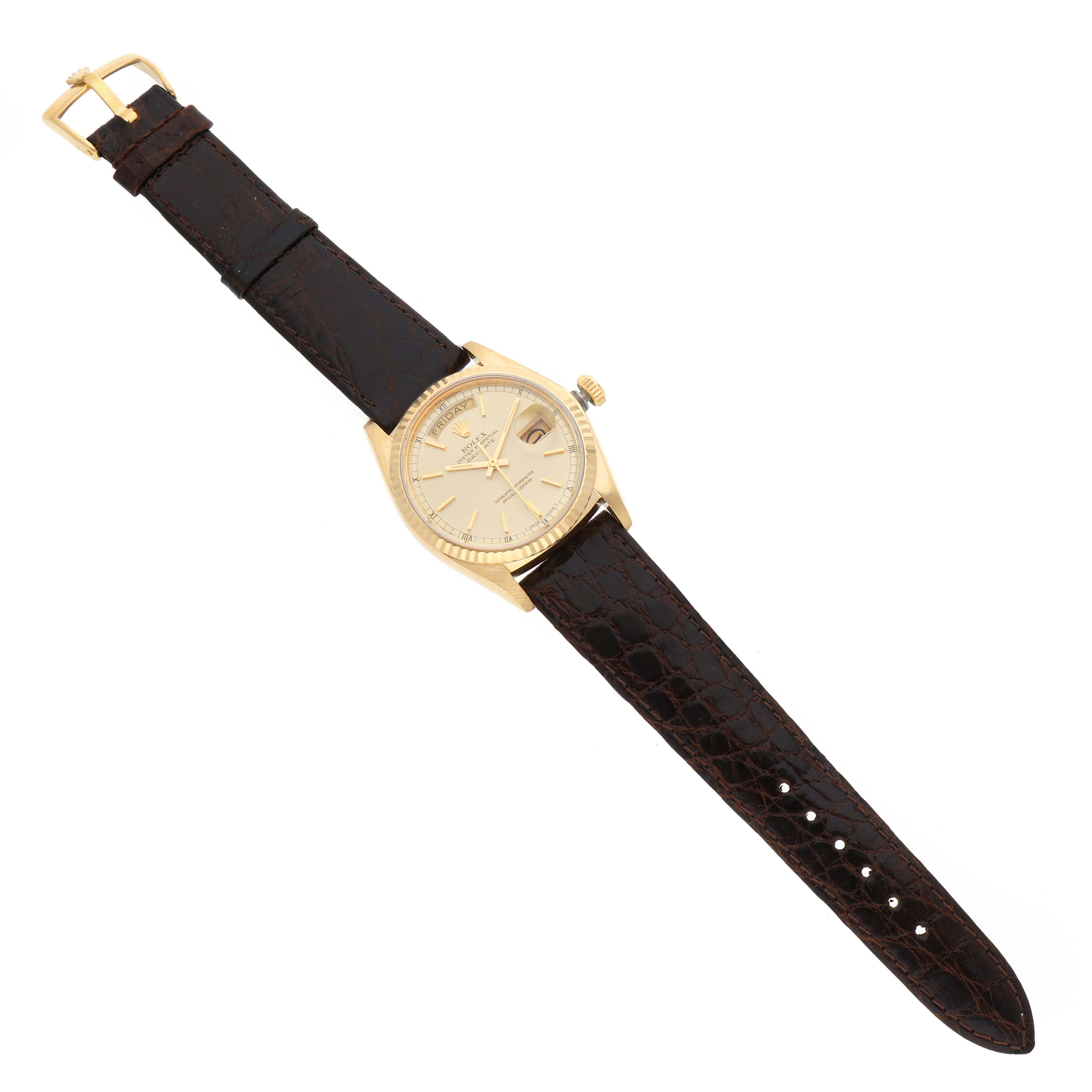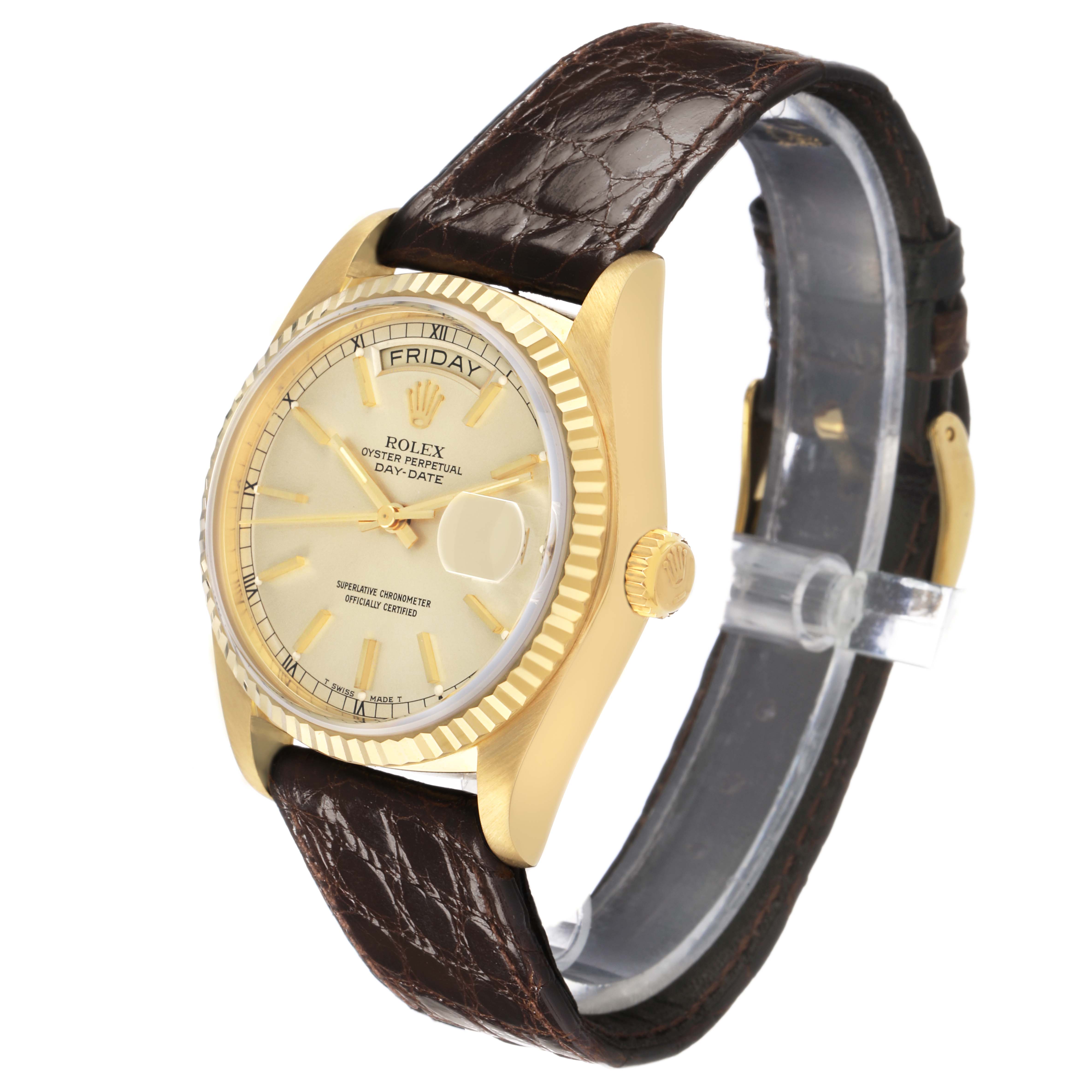 Rolex President Day-Date Yellow Gold Champagne Dial Mens Watch 18038. Officially certified chronometer automatic self-winding movement. 18k yellow gold oyster case 36.0 mm in diameter. Rolex logo on the yellow gold crown. 18k yellow gold fluted bezel. Scratch resistant sapphire crystal with cyclops magnifier. Champagne dial with yellow gold baton hour markers and luminescent hands. Yellow gold sweeping center seconds hand. An outer stick minute marker track. Aperture for the weekday at 12 o'clock. Aperture for the date at 3 o'clock. Brown leather strap with a custom yellow gold tang buckle.