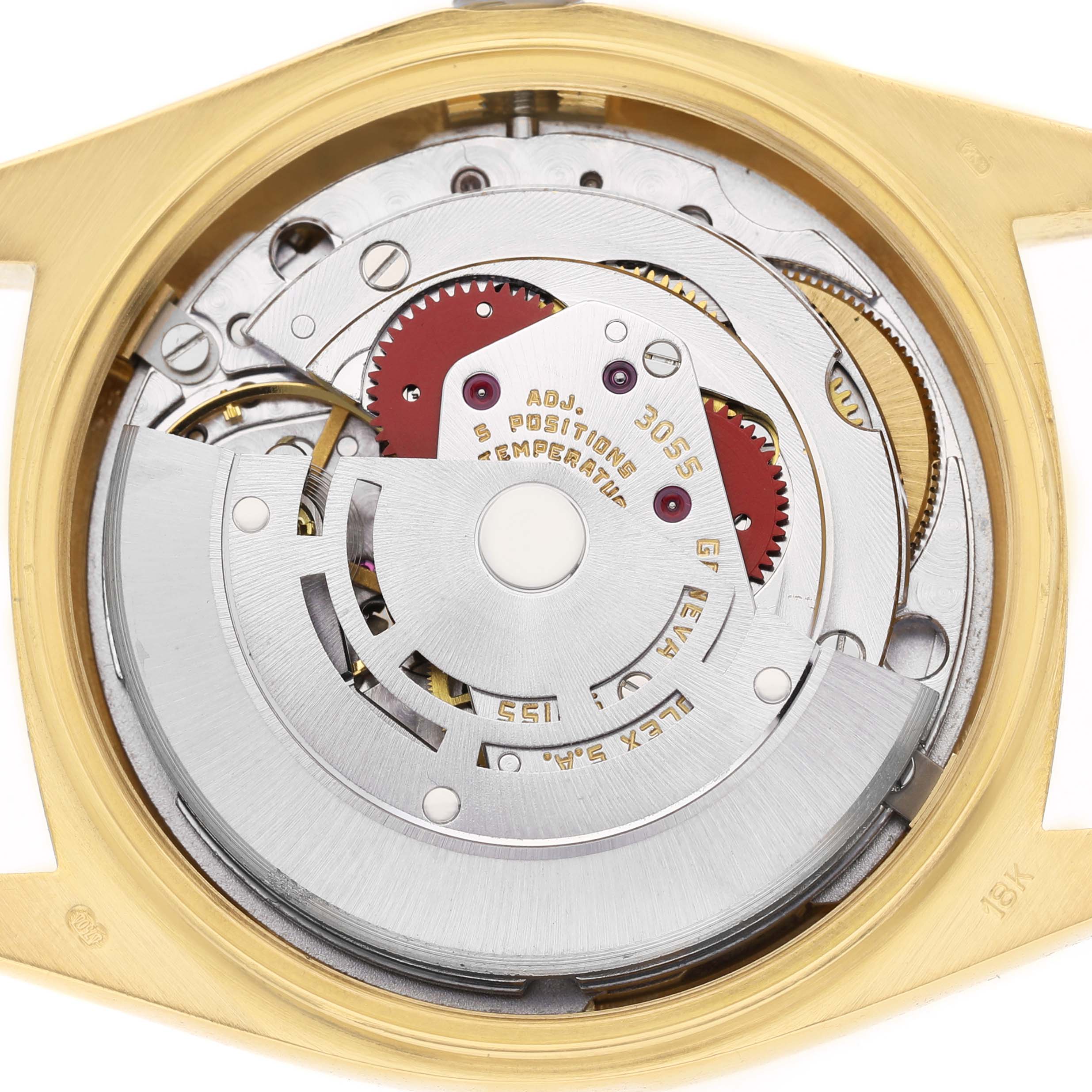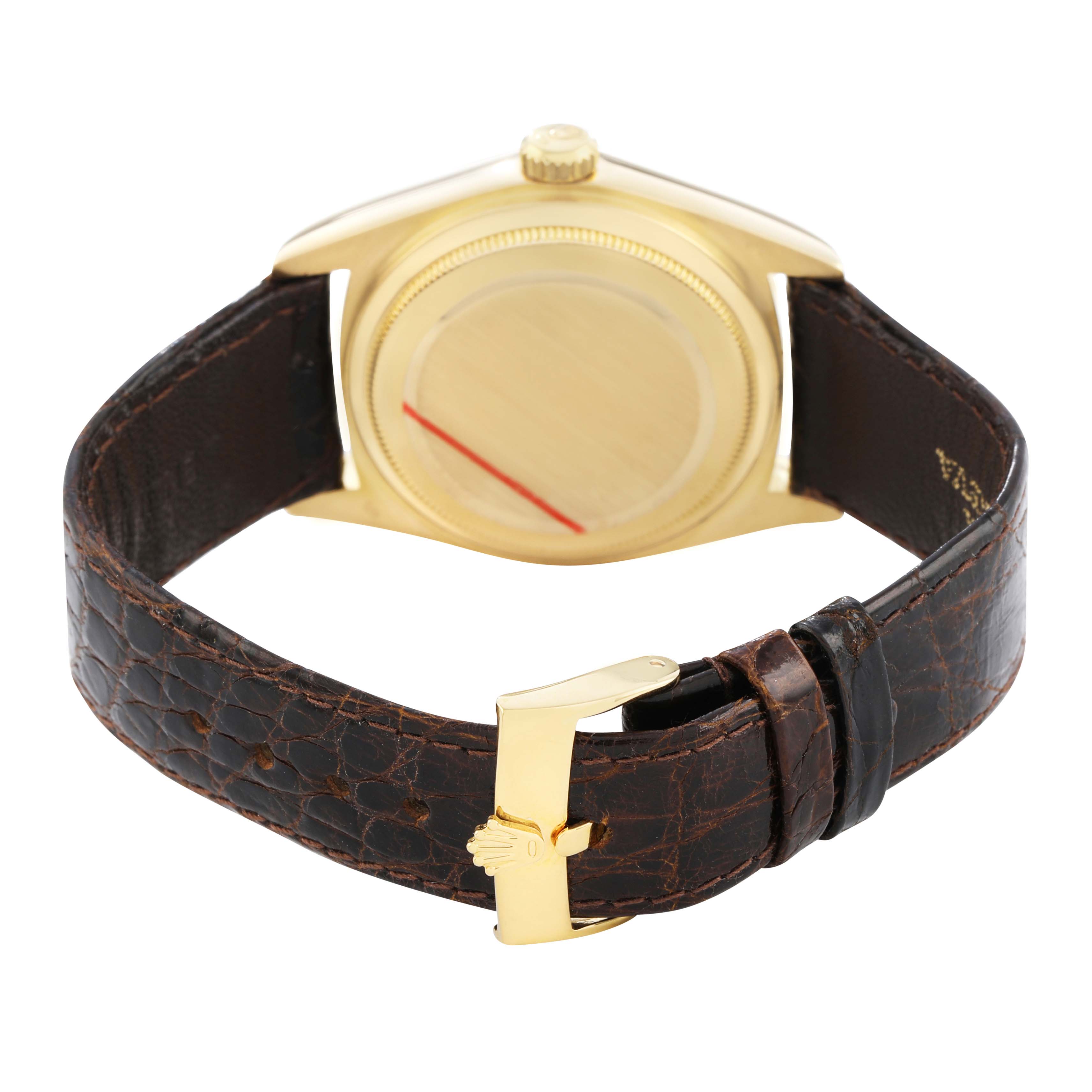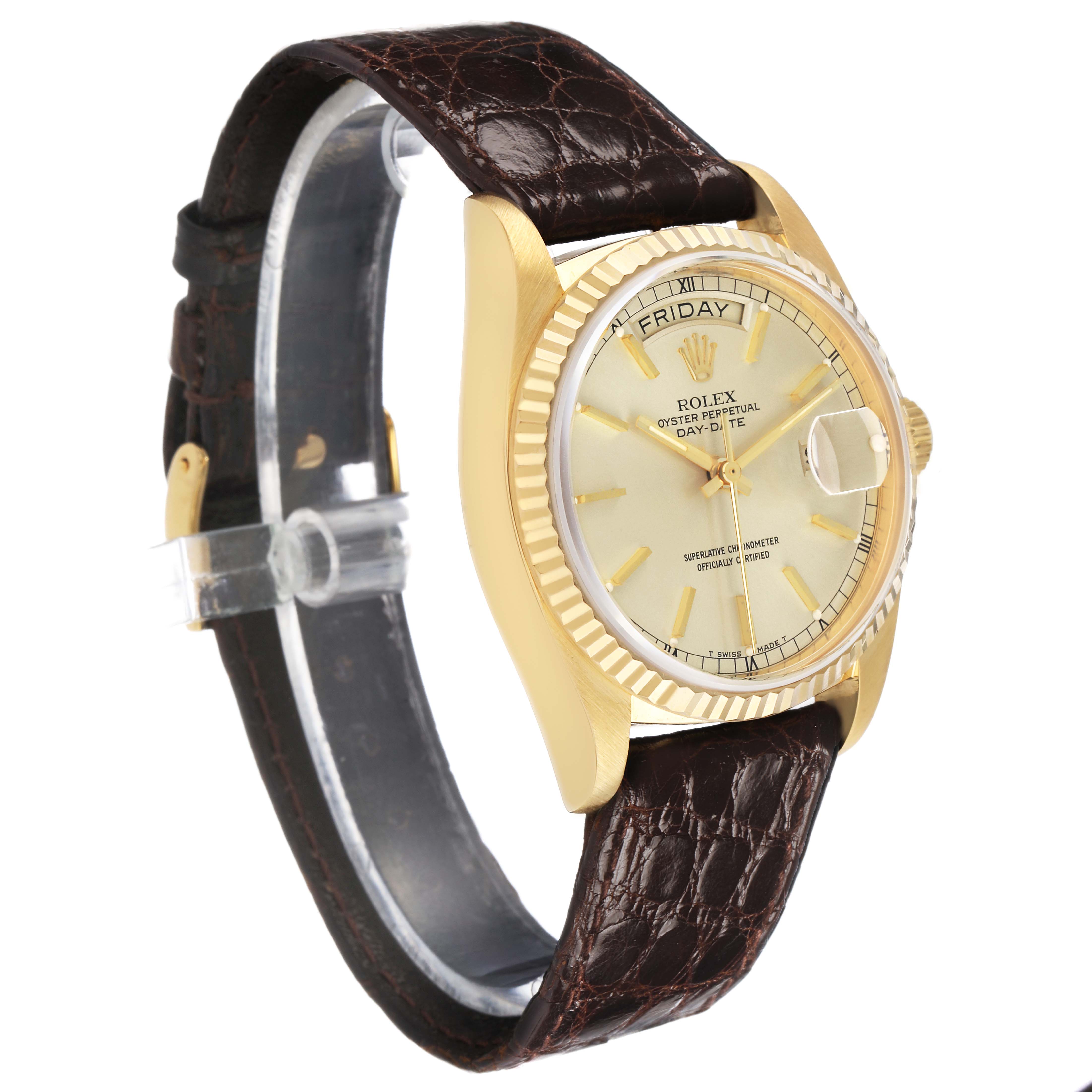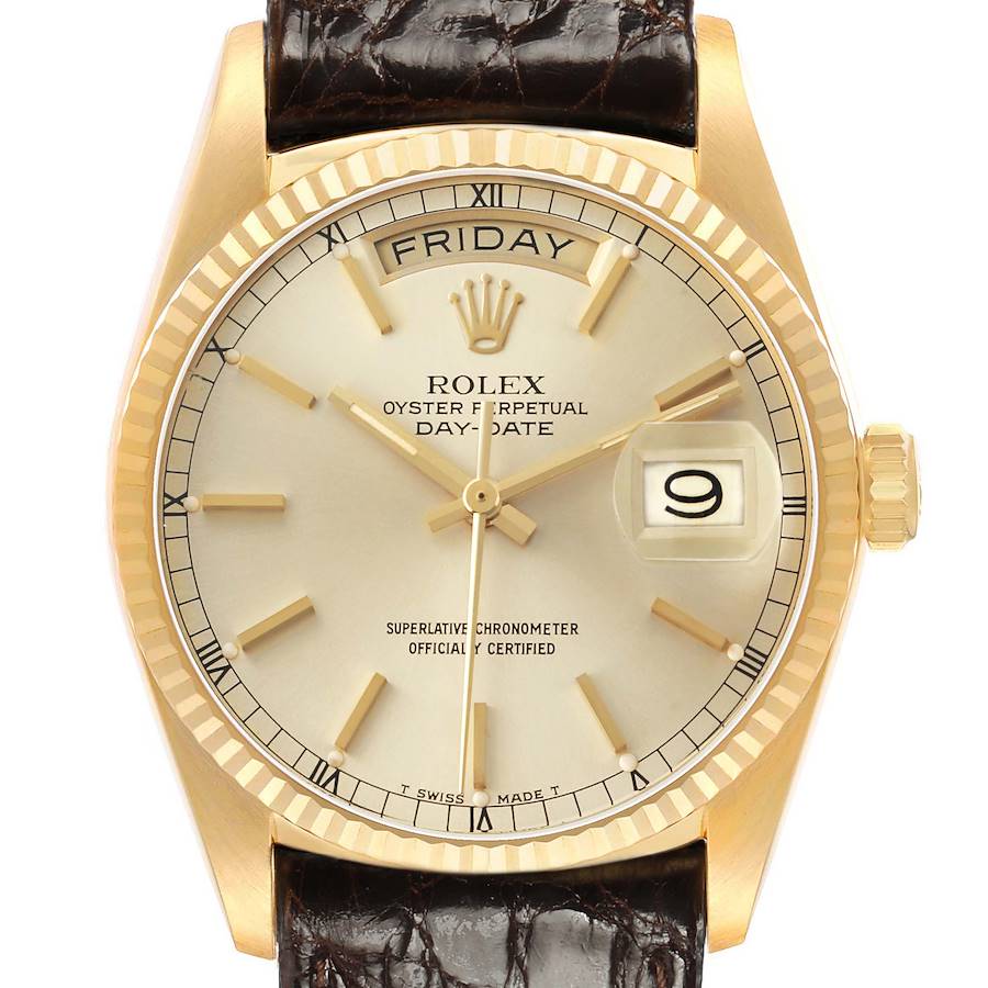 Rolex President Day-Date Yellow Gold Champagne Dial Mens Watch 18038. Officially certified chronometer automatic self-winding movement. 18k yellow gold oyster case 36.0 mm in diameter. Rolex logo on the yellow gold crown. 18k yellow gold fluted bezel. Scratch resistant sapphire crystal with cyclops magnifier. Champagne dial with yellow gold baton hour markers and luminescent hands. Yellow gold sweeping center seconds hand. An outer stick minute marker track. Aperture for the weekday at 12 o'clock. Aperture for the date at 3 o'clock. Brown leather strap with a custom yellow gold tang buckle.