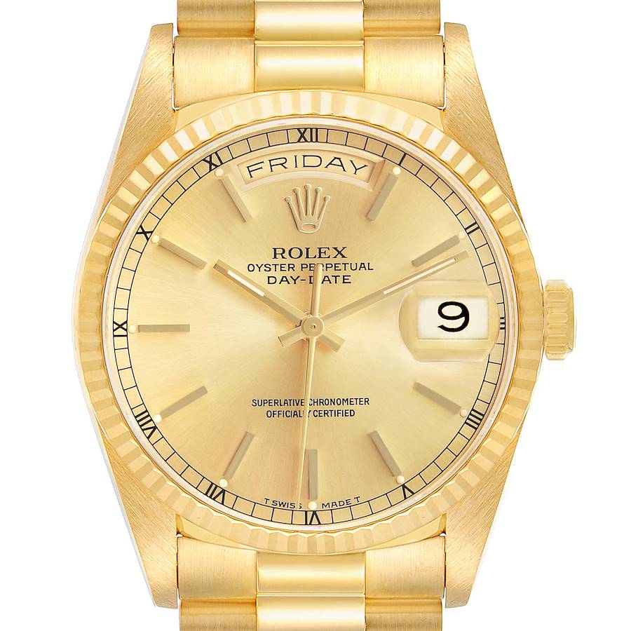 Rolex President Day Date Yellow Gold Mens Watch 18238. Officially certified chronometer self-winding movement. 18k yellow gold oyster case 36.0 mm in diameter. Rolex logo on an 18k yellow gold crown. 18K yellow gold fluted bezel. Scratch resistant sapphire crystal with Cyclops magnifier. Champagne dial with raised gold baton hour markers. Sweep centre seconds. Outer minute and 1/2 seconds divisions, aperture for day at 12, aperture for date at 3. 18k yellow gold presidential bracelet with a hidden folding clasp. Fits a 7 1/4" wrist.