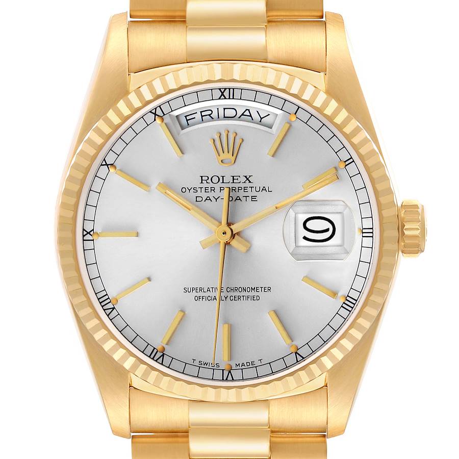 Rolex President Day-Date Yellow Gold Silver Dial Mens Watch 18038. Officially certified chronometer self-winding movement. 18k yellow gold oyster case 36.0 mm in diameter. Rolex logo on the crown. 18k yellow gold fluted bezel. Scratch resistant sapphire crystal with a cyclops magnifier. Silver dial with yellow gold baton hands and hour markers. Sweep centre seconds. Outer minute and 1/2 second divisions. Aperture for the weekday at 12. Date calendar at the 3 o'clock aperture. 18k yellow gold president bracelet with a hidden clasp. Fits up to a 7 1/4" wrist.