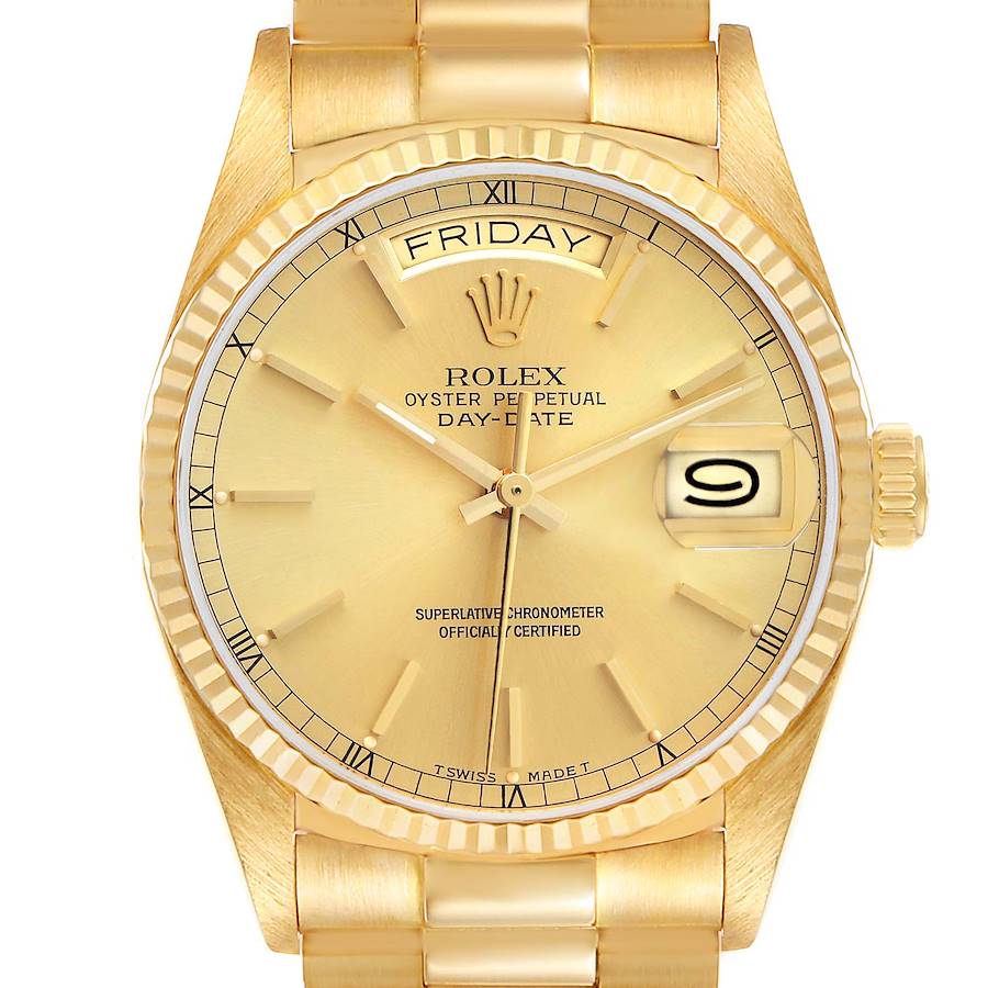Rolex President Day-Date Yellow Gold Mens Watch 18038. Officially certified chronometer automatic self-winding movement. 18k yellow gold oyster case 36.0 mm in diameter. Rolex logo on the crown. 18k yellow gold fluted bezel. Scratch resistant sapphire crystal with a cyclops magnifier. Champagne dial with yellow gold baton hour markers and hands. Sweeping centre seconds. An outer minute track. Aperture for the weekday at 12 o'clock. Aperture for the date at 3 o'clock. 18k yellow gold president bracelet with a hidden clasp. Fits a 7 3/4" wrist.