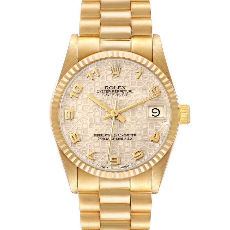 Rolex President Midsize 31 Yellow Gold Anniversary Dial Ladies Watch 68278. Officially certified chronometer automatic self-winding movement. 18k yellow gold oyster case 31.0 mm in diameter. Rolex logo on the crown. 18k yellow gold fluted bezel. Scratch-resistant sapphire crystal with a cyclops magnifier. Ivory jubilee anniversary dial with Arabic numeral hour markers and yellow gold hands. Date calendar at 3 o'clock aperture. 18k yellow gold president bracelet with a hidden folding clasp. Fits a 6.5" wrist.