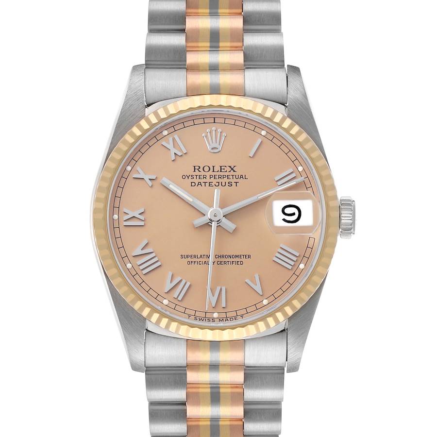 Rolex President Midsize Tridor White Yellow Rose Gold Ladies Watch 68279. Officially certified chronometer automatic self-winding movement. 18k white gold oyster case 31.0 mm in diameter. Rolex logo on the crown. 18K yellow gold fluted bezel. Scratch resistant sapphire crystal with a cyclops magnifier. Bronze dial with Roman numeral hour markers and luminescent white gold baton hands. Date calendar at 3 o'clock aperture. 18k tri-colored white, yellow, and rose gold Tridor president bracelet with a hidden folding clasp. Fits up to a 6.5" wrist.