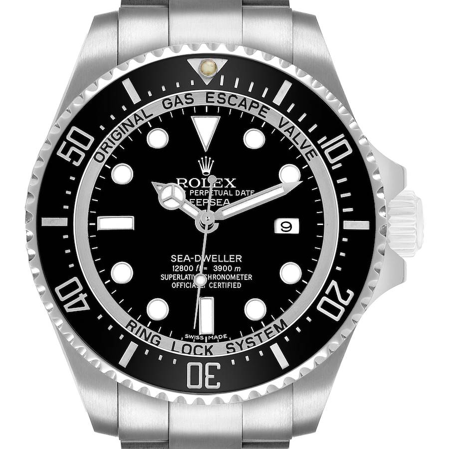 Rolex Sea-Dweller Deepsea Steel Black Dial Ceramic Bezel Watch 116660. Officially certified chronometer automatic self-winding movement. Stainless steel oyster case 44.0 mm in diameter. Rolex logo on the crown. Pointed crown guards. Special time-lapse unidirectional rotating Cerachrom ceramic bezel with 60-minute graduation engravings. Scratch resistant sapphire crystal. Black dial with white luminescent Mercedes hands and dot hour markers. Luminescent lollipop-tipped centre seconds hand. Date calendar at the 3 o'clock aperture. Outer minute track. Stainless steel oyster bracelet with a flip-lock clasp. Fits an 8 1/2" wrist.