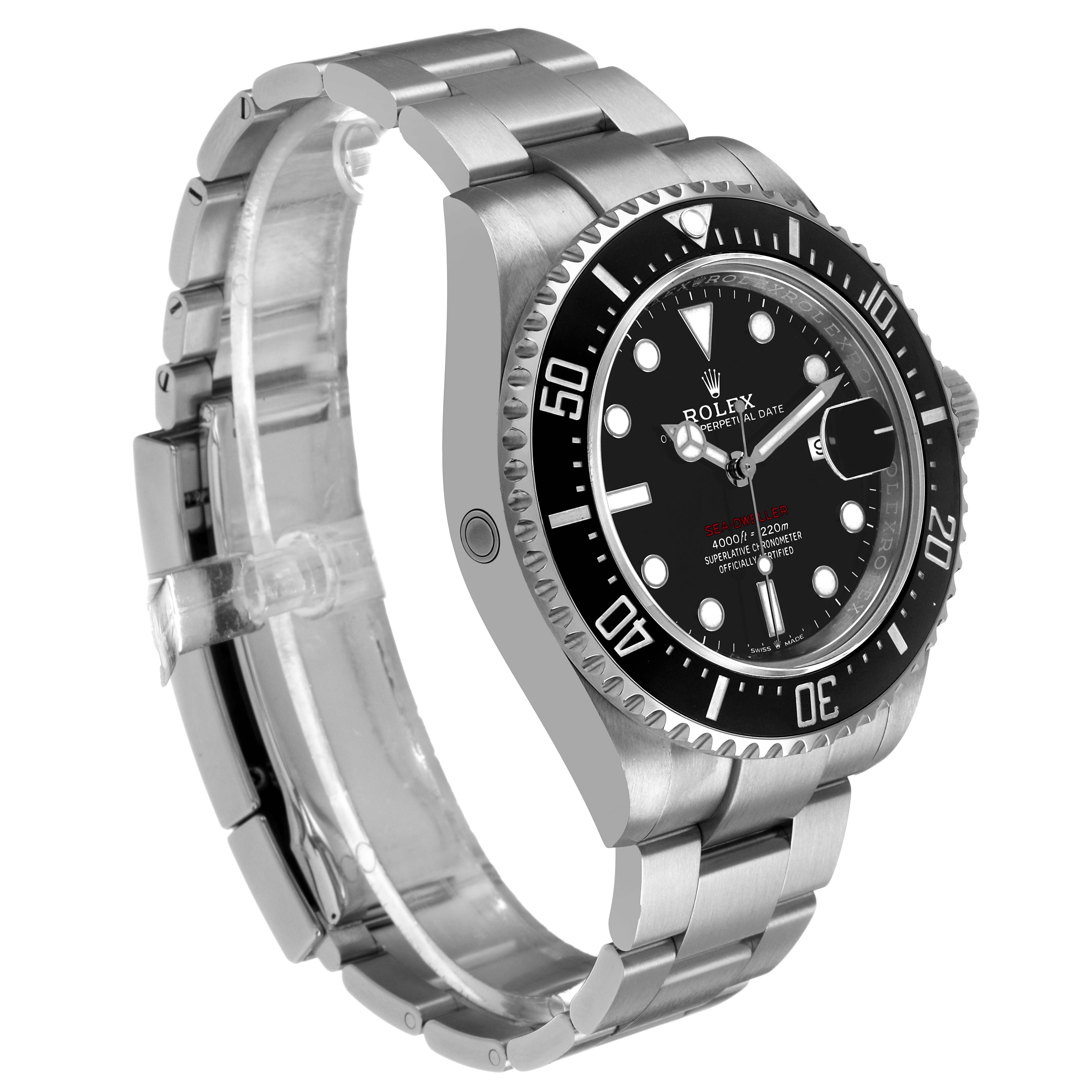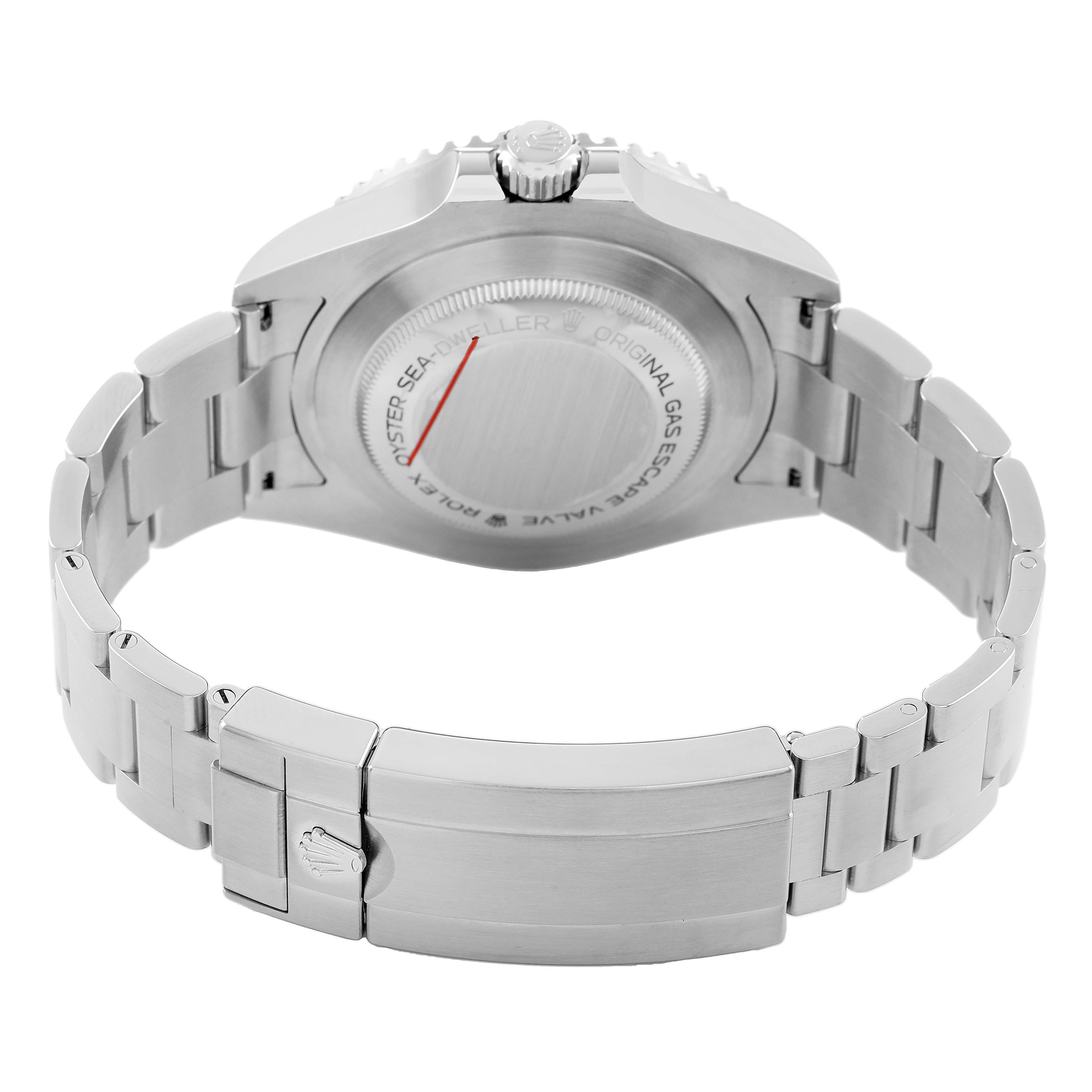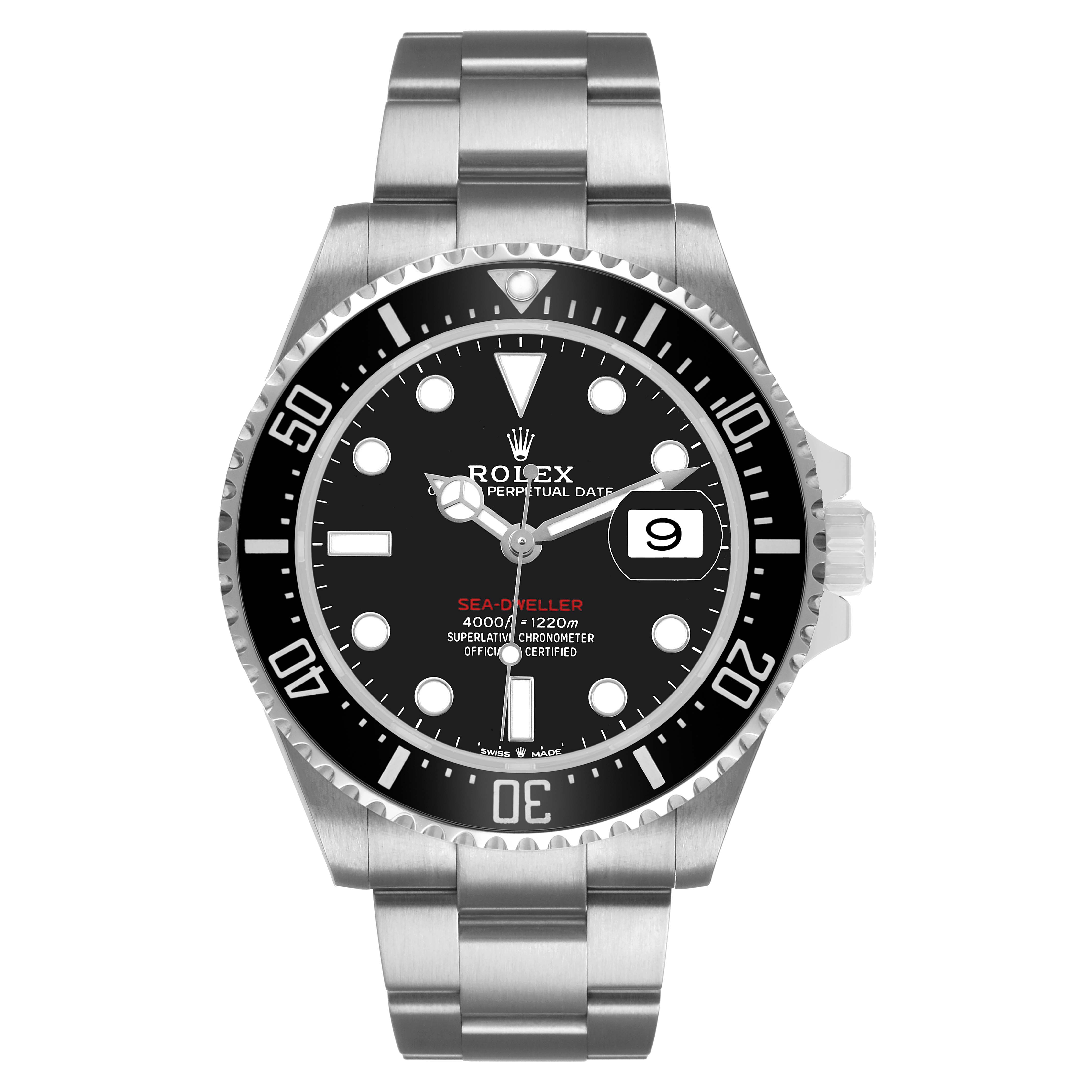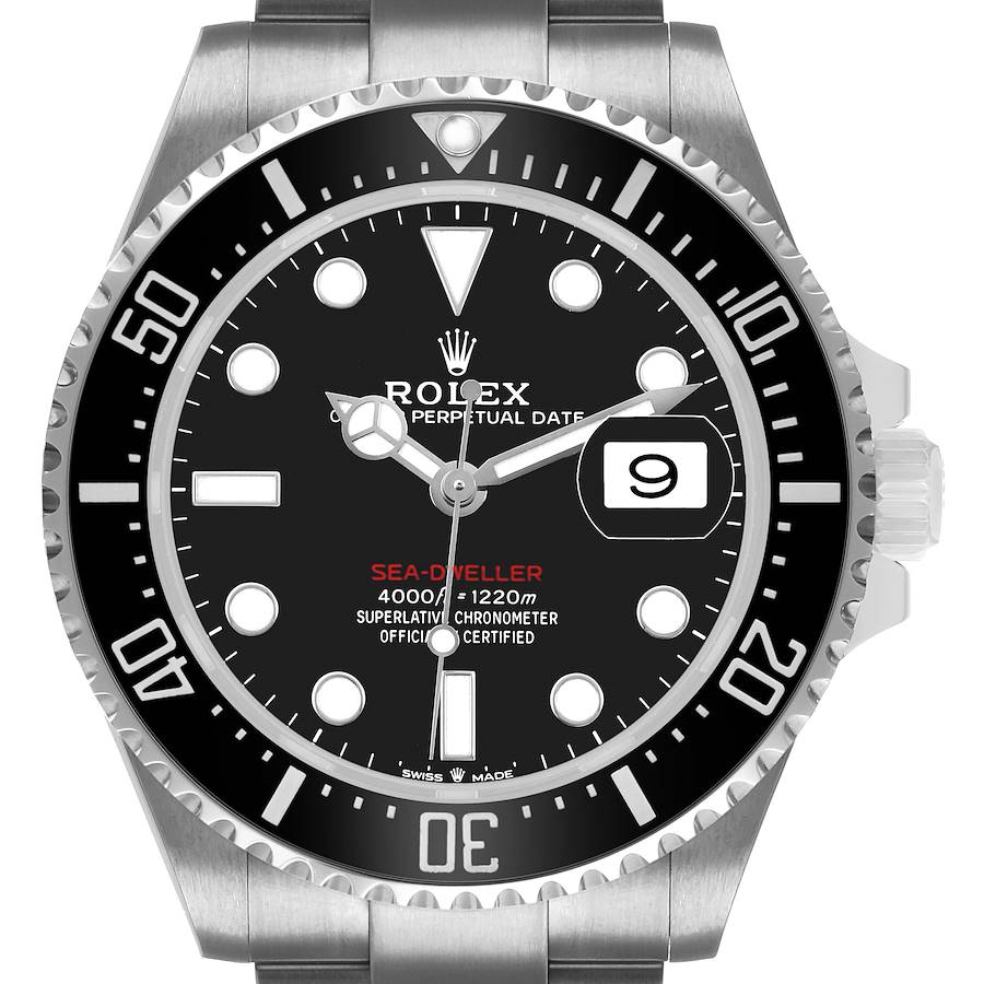 Rolex Seadweller 43 50th Anniversary Steel Black Dial Mens Watch 126600. Officially certified chronometer automatic self-winding movement. Stainless steel oyster case 43.0 mm in diameter. Rolex logo on the crown. Ceramic unidirectional rotating time-lapse bezel with numerals and graduations coated in platinum. Scratch resistant sapphire crystal with a cyclops magnifier. Black dial with white luminescent Mercedes hands and dot hour markers. Luminescent lollipop-tipped centre seconds hand. Outer stick minute markers. Red "Sea-Dweller" text. Date calendar at the 3 o'clock aperture. Stainless steel oyster bracelet with a flip-lock clasp. Fits an 8 1/4'' wrist.